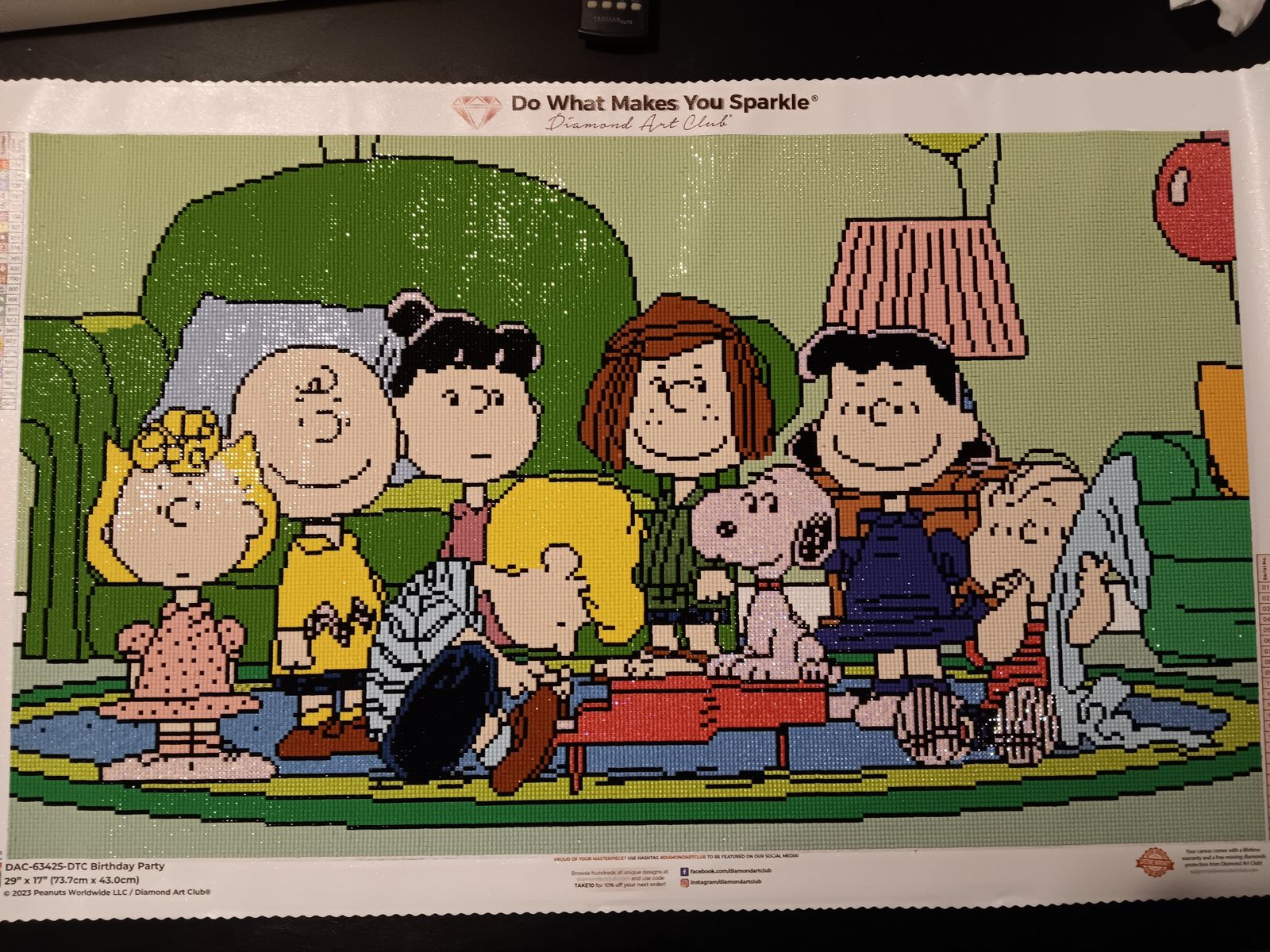 I just finished my first xtra large diamond painting! Yayyy! It’s Peanuts, “ Birthday Party.” I enjoyed every minute of it. It’s square which were awesome. The quality of the canvas is soft but sturdy. This was the first painting I’d worked on from DAC and i don’t know how I’m going to go back and work on some of the canvases I’ve gotten from Temu & AliExpress? The sparkle from the special drills is so pretty! Hopefully you’ll be able to see it in the photos. It took me from 6/21/25 to today to finish this painting. It’s 29”x17” . It has 18 colors plus 4 abs & 2 fairy dust drills.☺️