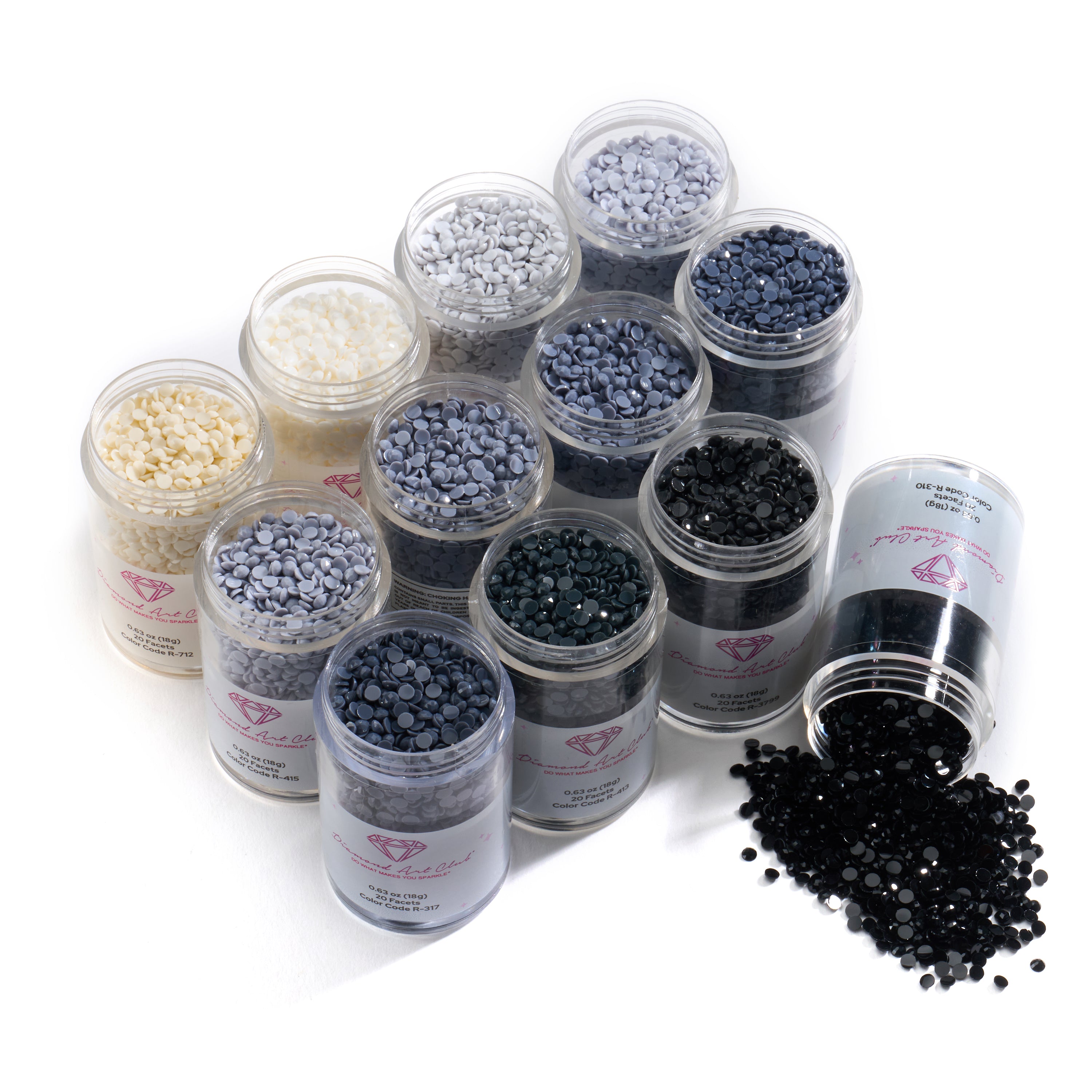 Perfect for shadows, backgrounds, architectural details, and monochrome designs, this set brings balance, clarity, and bold contrast to your artwork. Each sturdy jar contains 0.63 oz (18g) of our signature round resin drills, with the complete set totaling 7.56 oz (216g) for consistent sparkle and smooth placement.