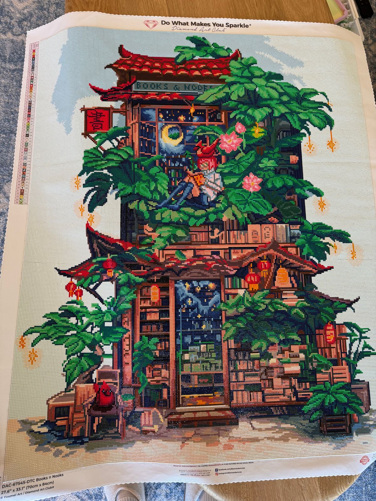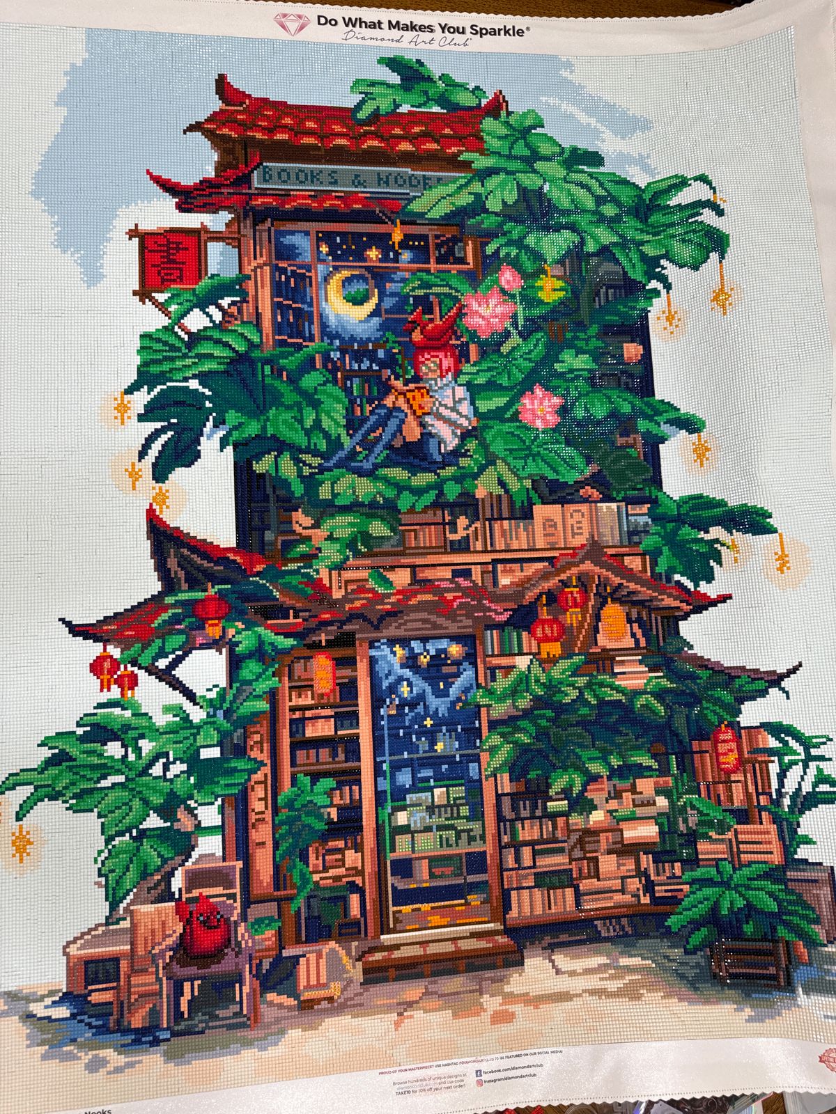 Books n Nooks by Yuumei has easily become one of my favorite diamond paintings from Diamond Art Club! The moment I saw this artwork, I knew I had to have it – and it did not disappoint. The colors are rich and vibrant, and the details are absolutely beautiful. Every section felt like opening a tiny storybook, filled with cozy vibes and magical little corners.