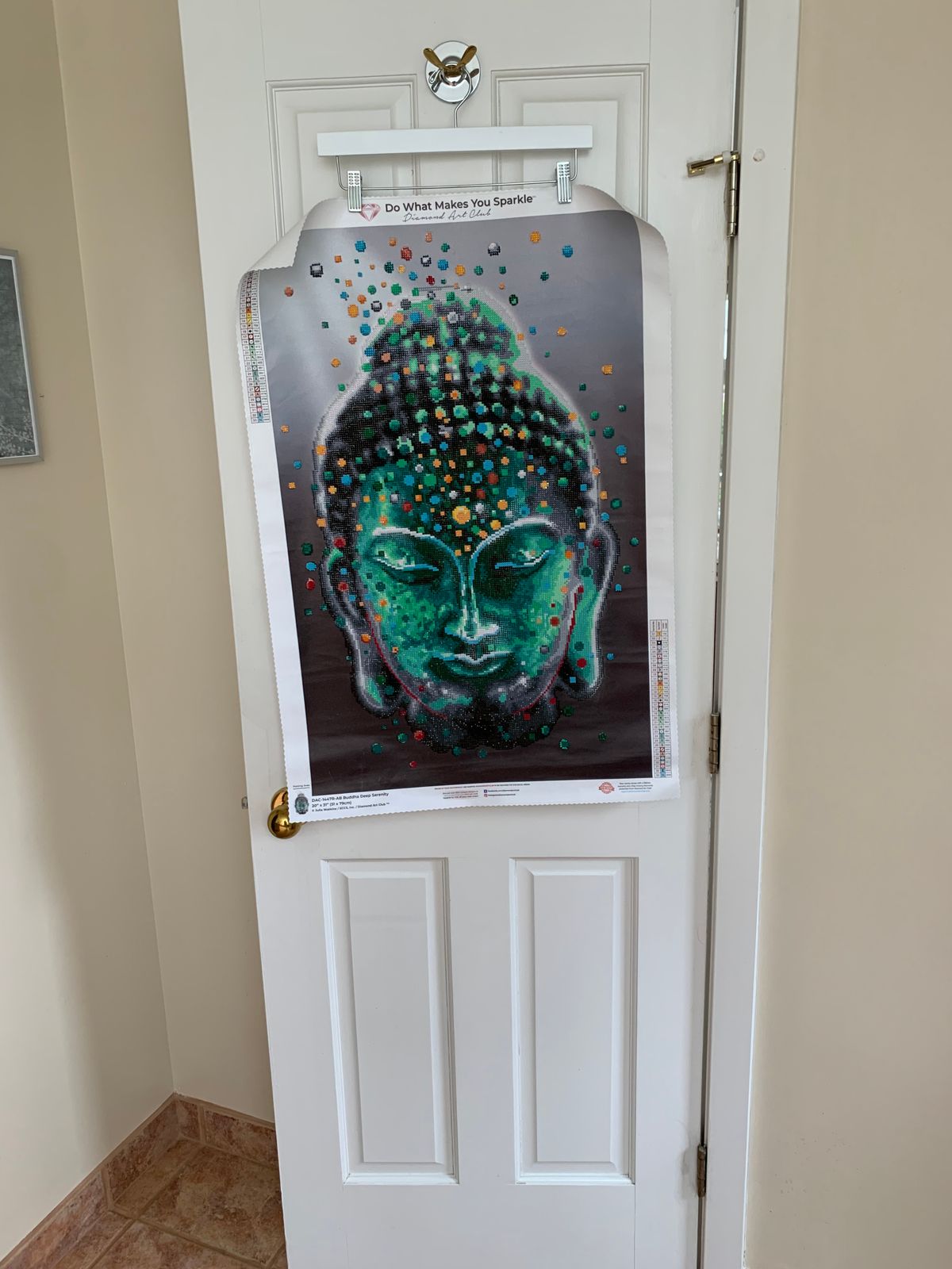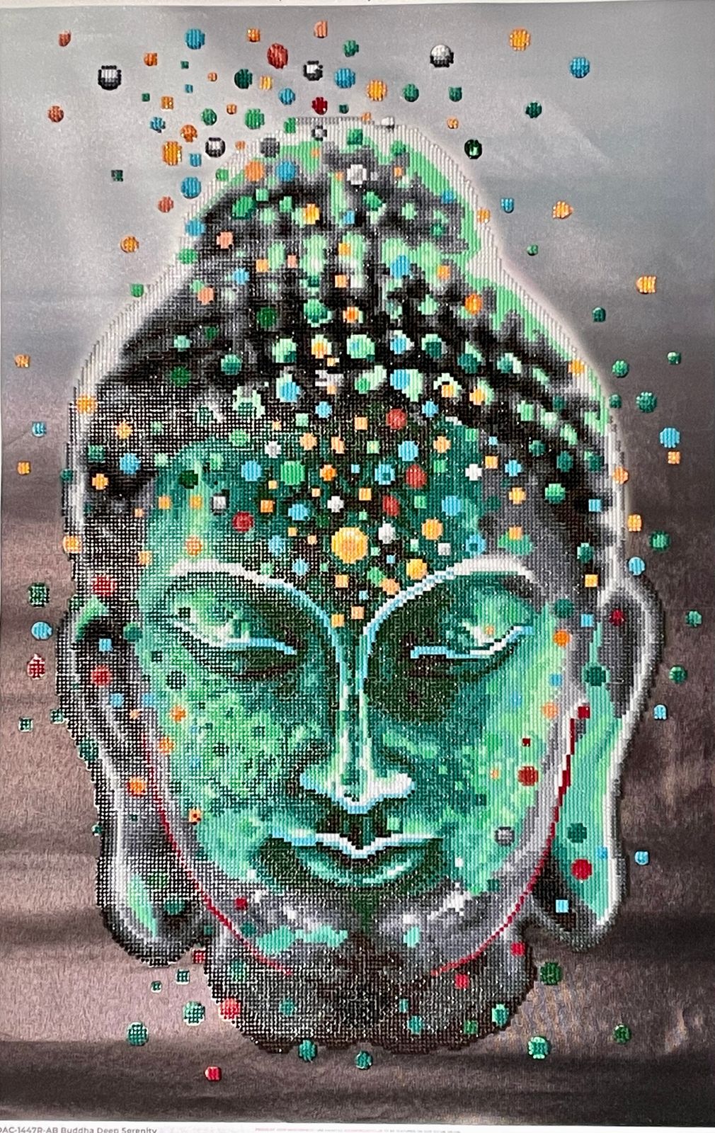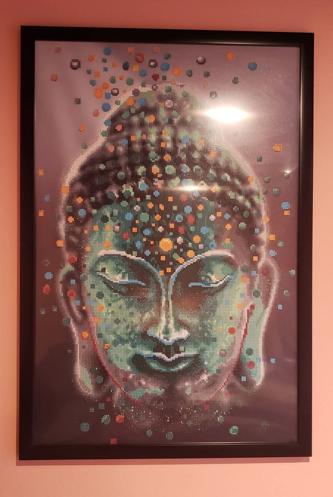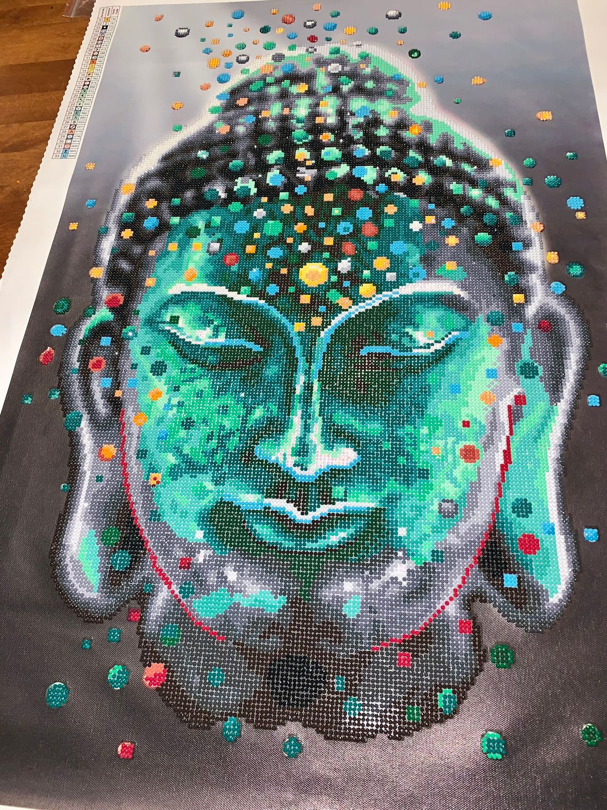 I had a great time working on this painting. Canvas/glue field was great. Laid flat pretty easily. Drills were very consistent with minimal trash. Symbols were clear and east to read. I loved the pops of color on the mostly green and grey field. As a beginner myself, I didn’t find this painting too difficult. The partial canvas is something different. I did find that my hand would stick to the glue around the small circles that dot the outer areas of the canvas. Fun project overall!