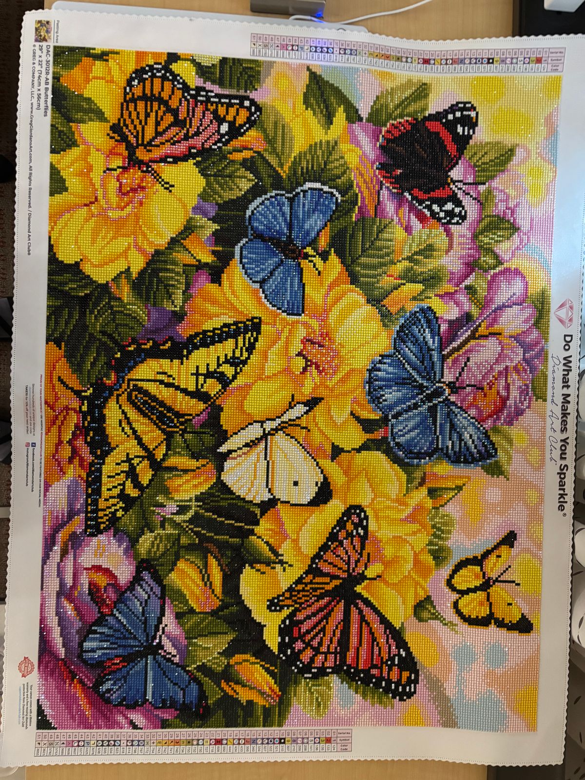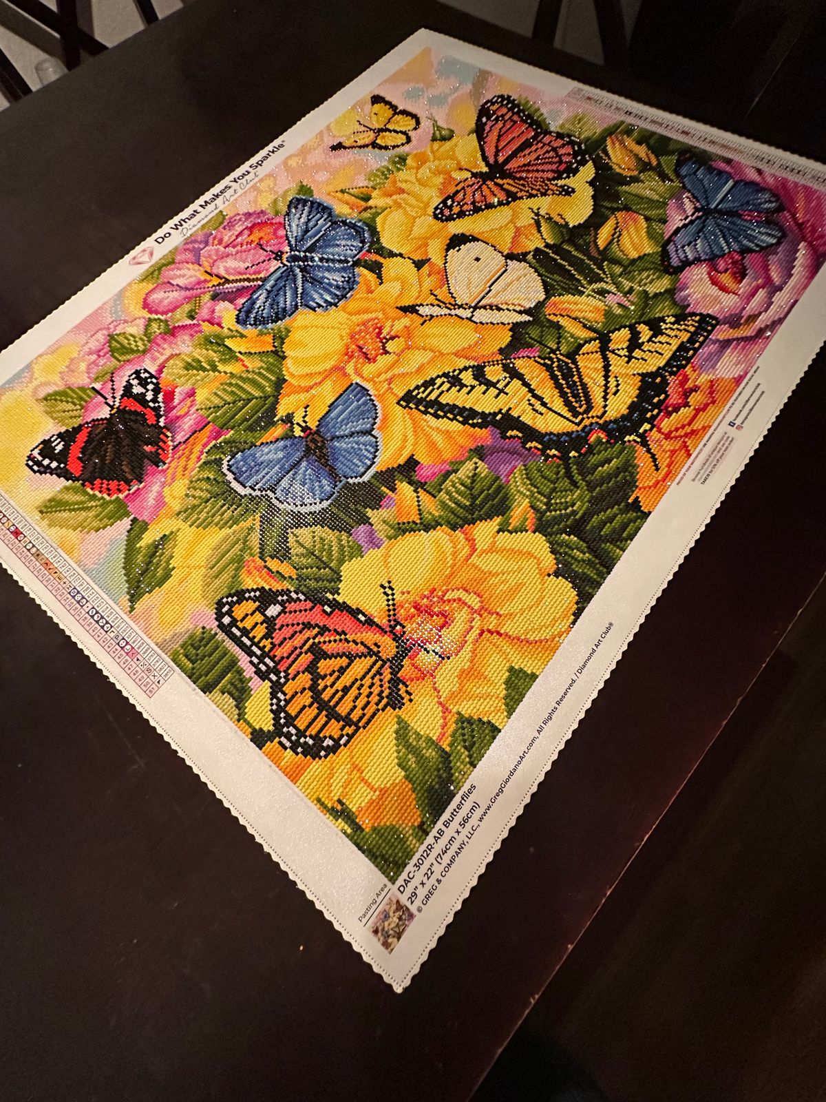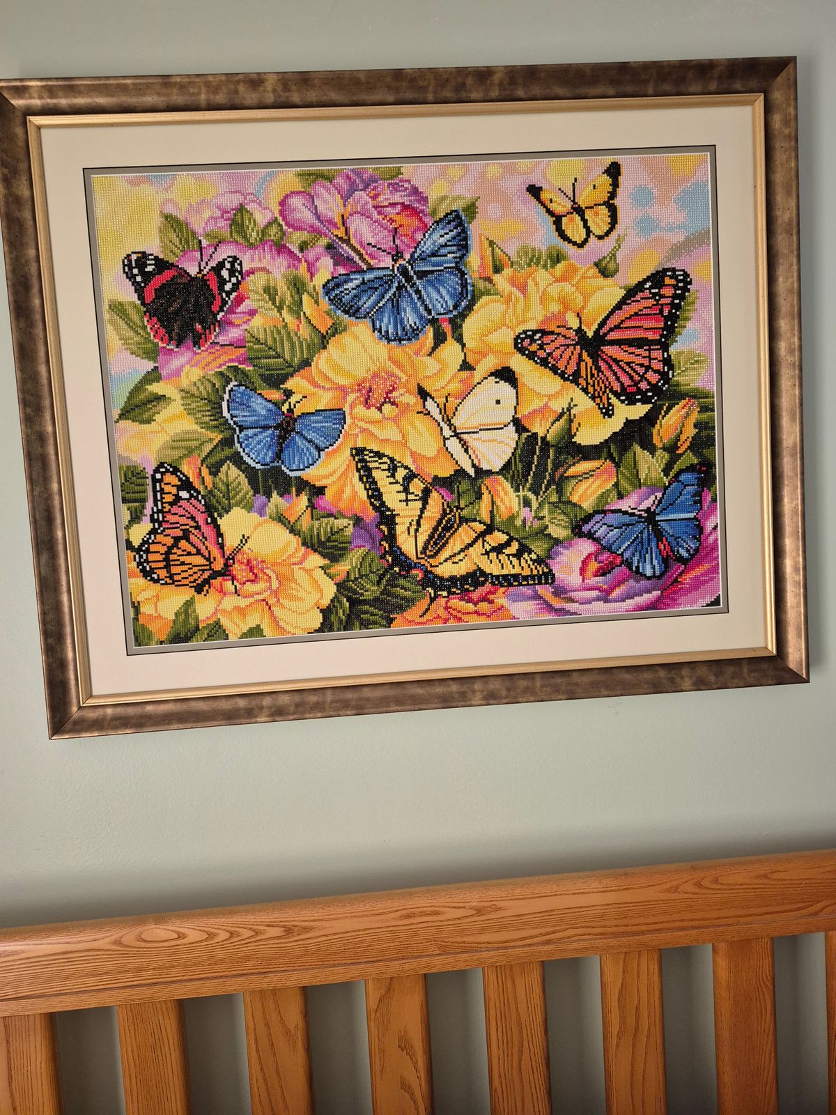Multi colored butterflies landed and fluttering in a group of multicolored flowers. Had it framed in a gold frame, which is a color i don't usually choose for my frames. My spare bedroom is in greens and neutral brown tones so this picture with the bright yellows really makes the room. Took about 4 months of spare time to complete.