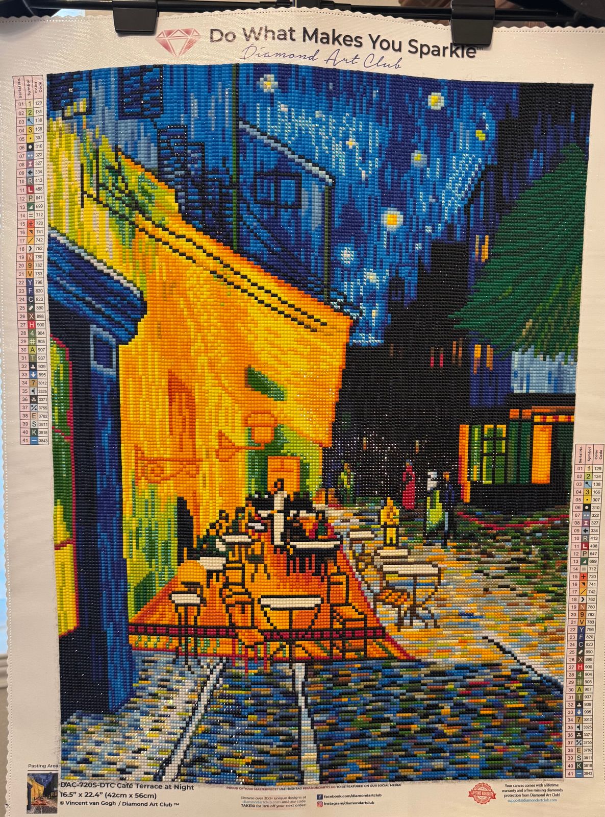 So happy to be able to work on Van Gogh’s Cafe Terrace at Night, & I love the way this DAC diamond painting turned out! This kit contains a quality canvas as well as great tools & diamonds; it was rare to find a junk drill. There were a few areas on the canvas that could’ve been stickier. Purchased a frame online, & I have this masterpiece on my wall.