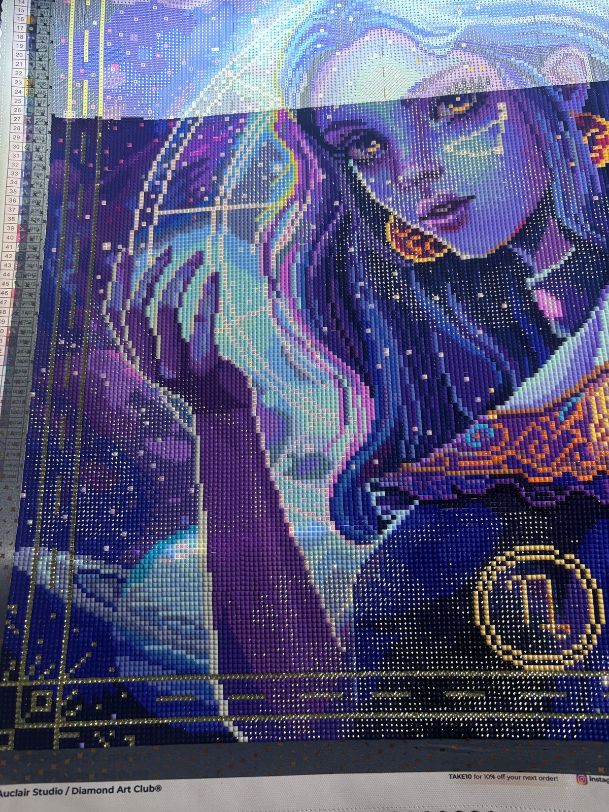 Be aware that this canvas is rather mono-chromatic. There are blues and purples and very little other contrasting colors. Many symbols have very close shade of colors. The % sign (color 552), the X sign (color 3837), the dot with a right vertical line sign (color 209) and the down arrow (color 553) are all very similar shade of purples, and I needed to single place with a magnifying glass to get thru these areas. Same with North-West pointing empty arrow sign (color 826) and the 0 with a / inside sign (color517) that are similar shade of blues. Not really a complaint, just a fact. I still enjoyed working on her very much, and the end result is pleasing to my eyes. This is my 5th horoscope canvas by Auclair Studio, and I love this serie alot. The iridescent inner frame bring much contrast to this picture that would otherwise be absent because of the lack of other colors. And the size is just right. Took me around 2 months of work, and I enjoyed my time working around her. Many thanks to DAC and Auclair Studio.