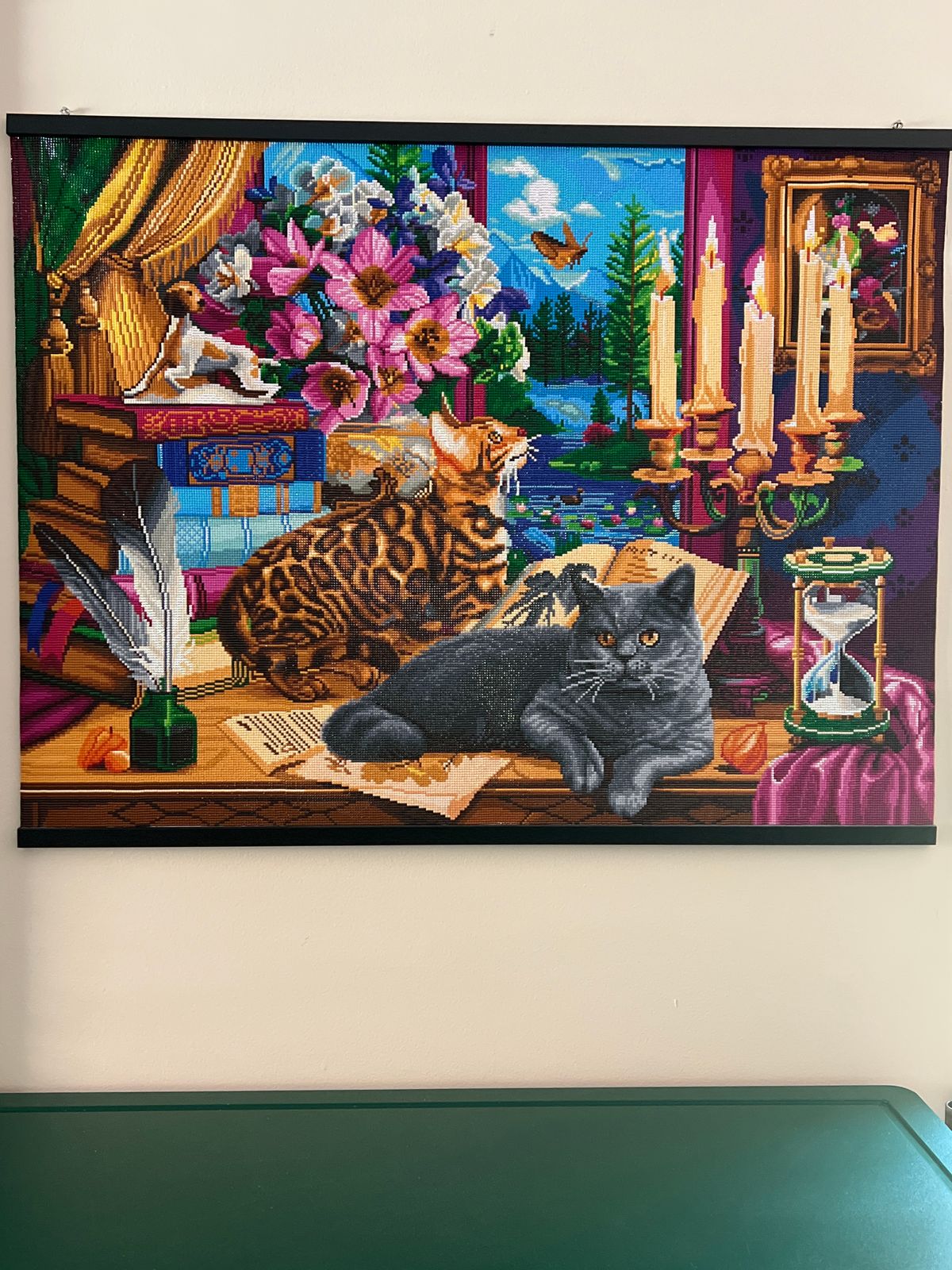 Capture the charmed life of an indoor cat in this beautiful painting where landscape meets decor. Pursue a fluttering moth in the flickering candlelight, contemplate the sand slowly trickling through an hourglass, or, perhaps, you'll simply decide to knock something off your perch just because you can.