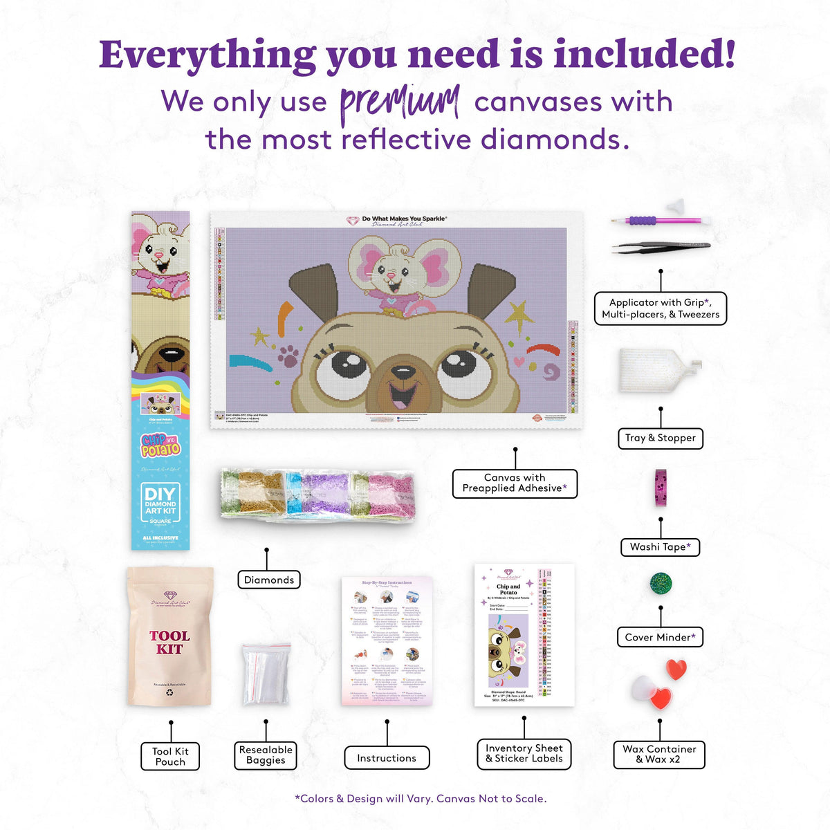 Canvas x 1, Diamonds, Tray x 1, Applicator + Grip x 1, Wax x 2, Tweezers x 1