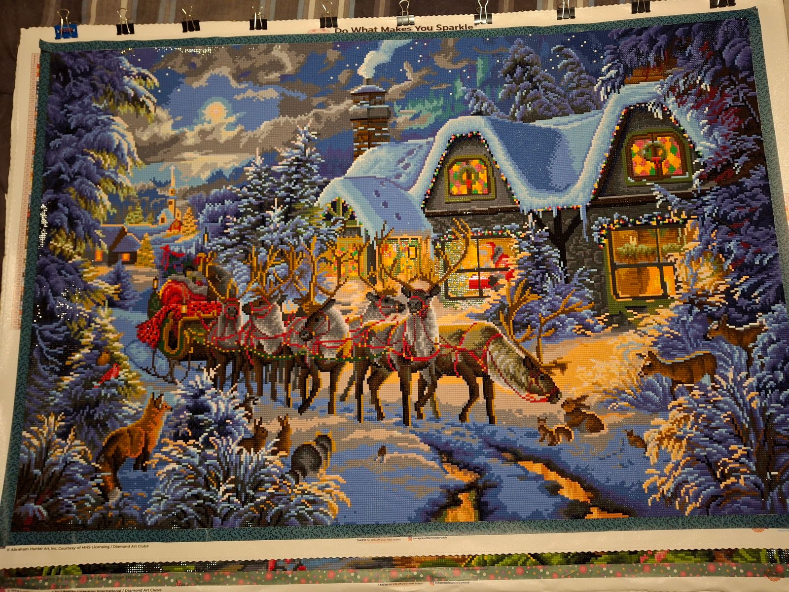 This canvas was such a delight to work on. I like how the details developed as I worked on it. I also like how colorful it is and looks perfect with my other Christmas decor. I love the reindeer, Santa, and the wildlife.