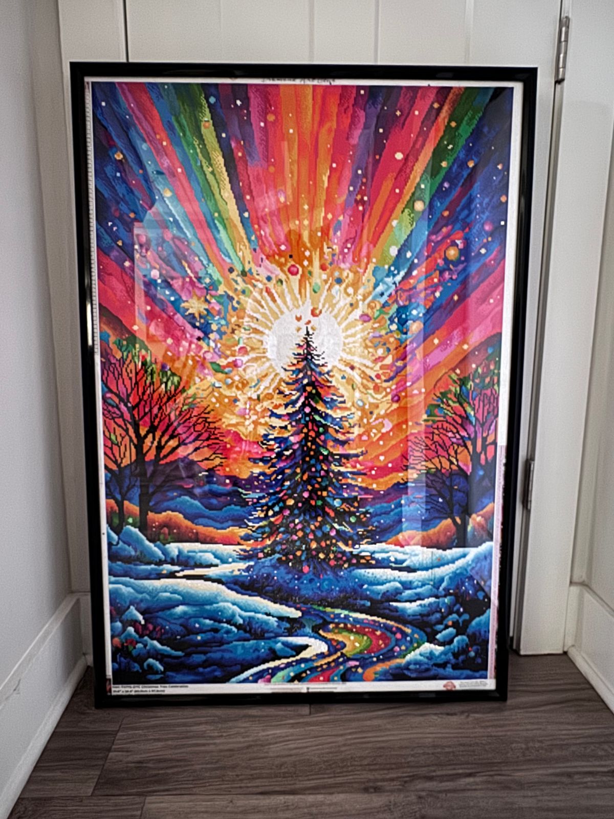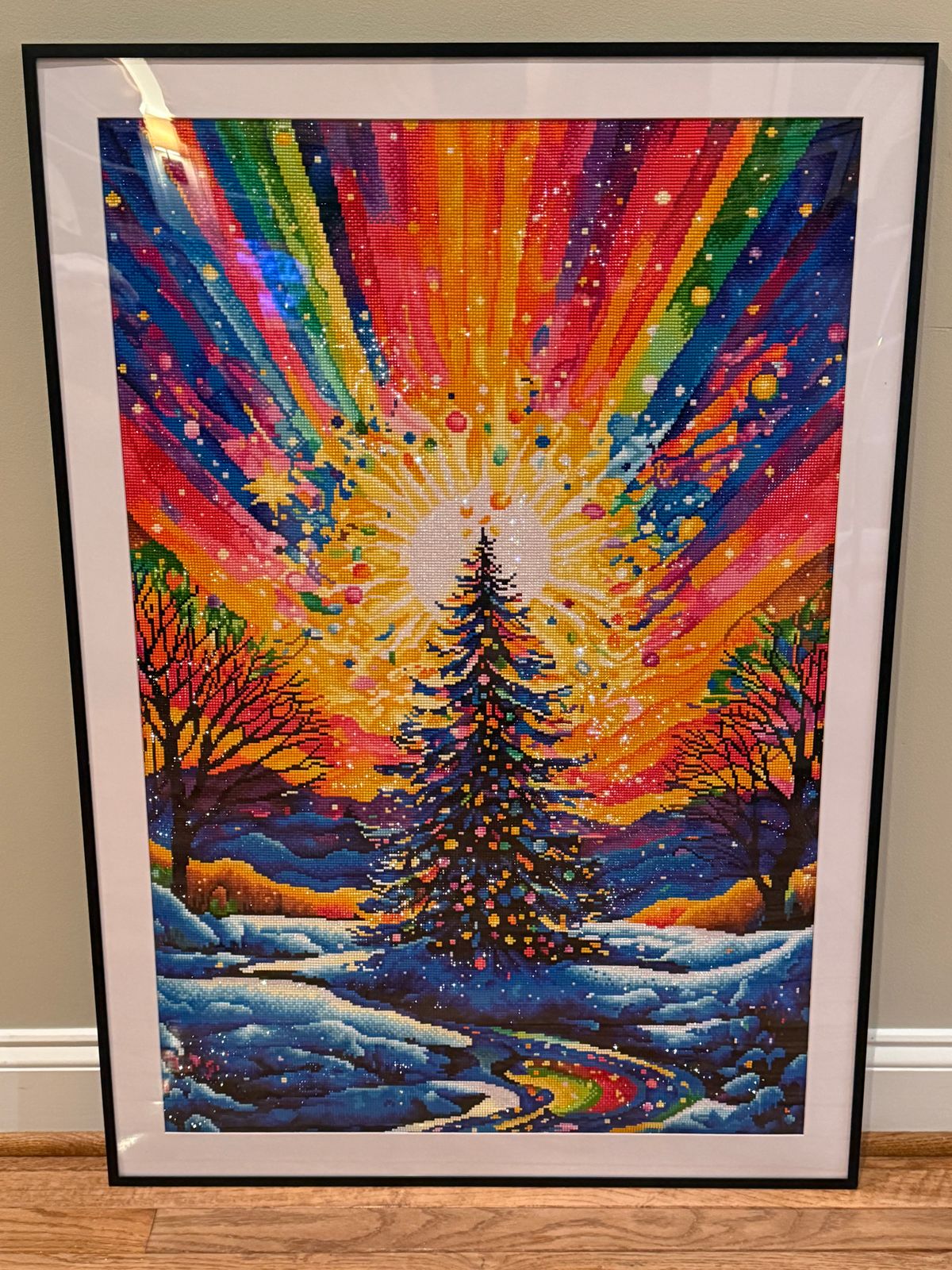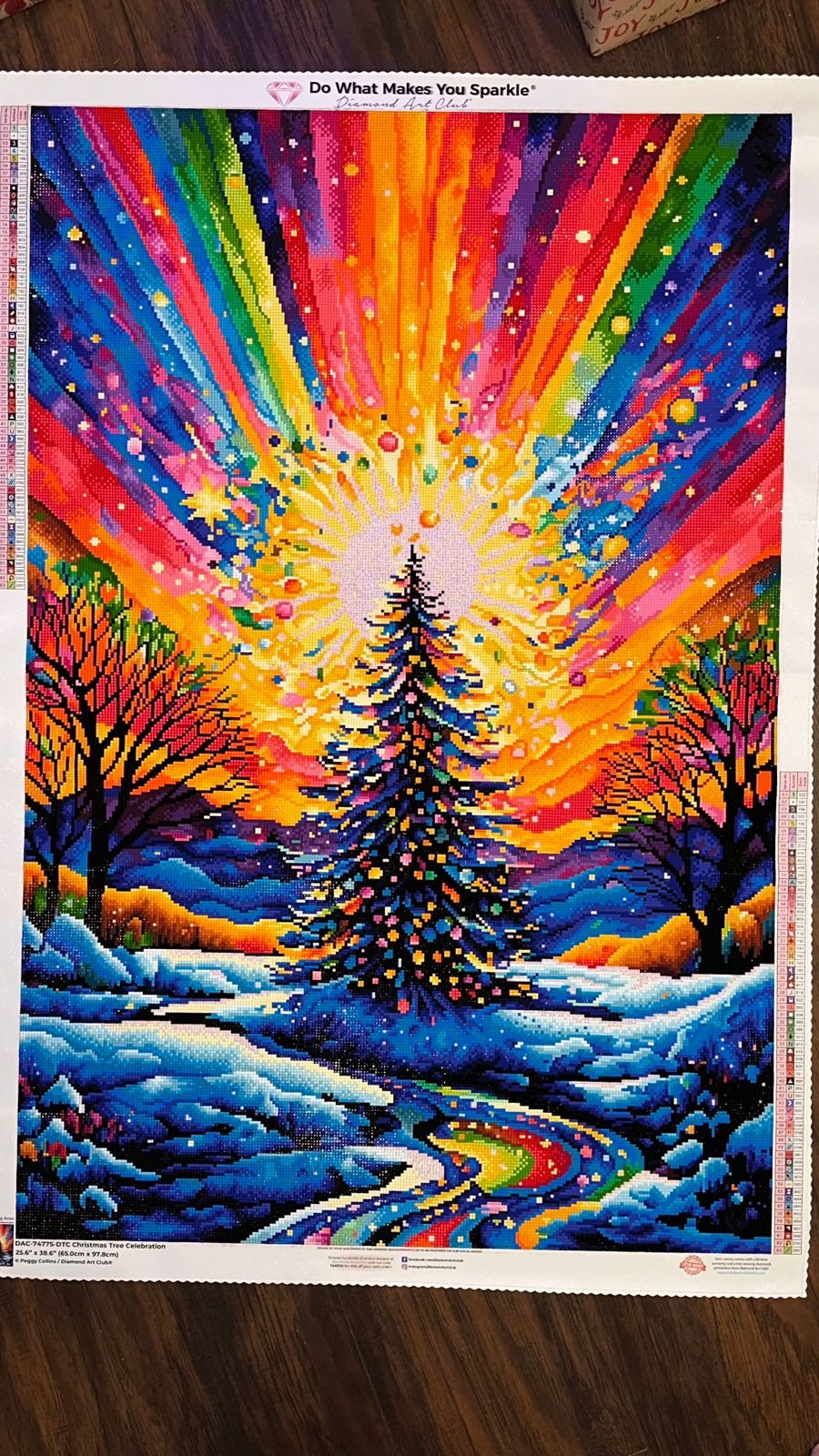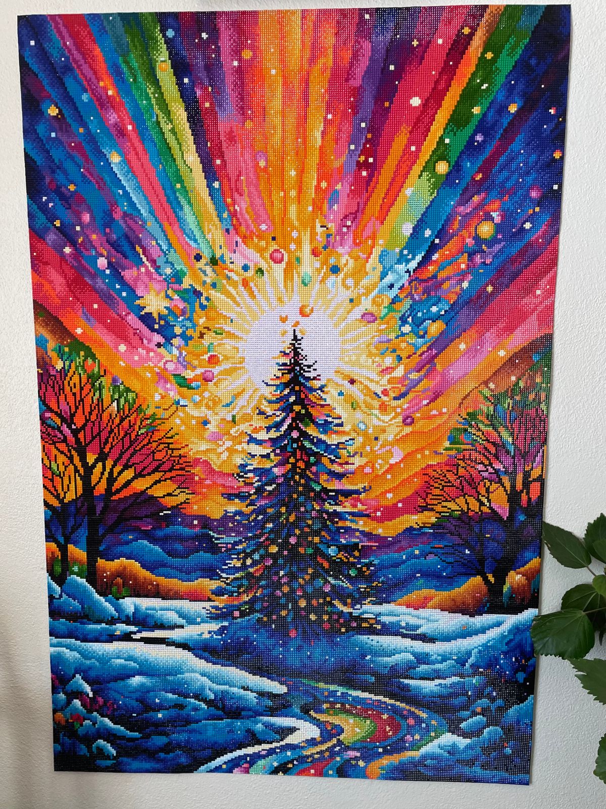 Awaken your senses with this magical scene of a fully decorated tree sparkling under a rainbow sky! Light up your holiday with exuberant joy and layers of color, creating a festive spectacle!