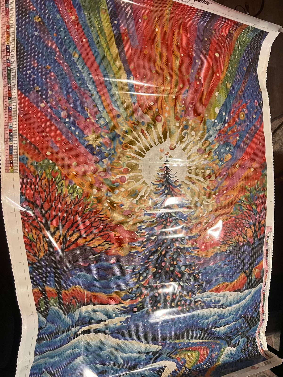 This was a really enjoyable and beautiful big canvas to work on. I really love how colorful it is - goes well beyond the traditional red and green Christmas colors! Although there is a lot of confetti, there is also a great mix of color blocking to go with it. My children helped with small portions of it so it is now a family memory.