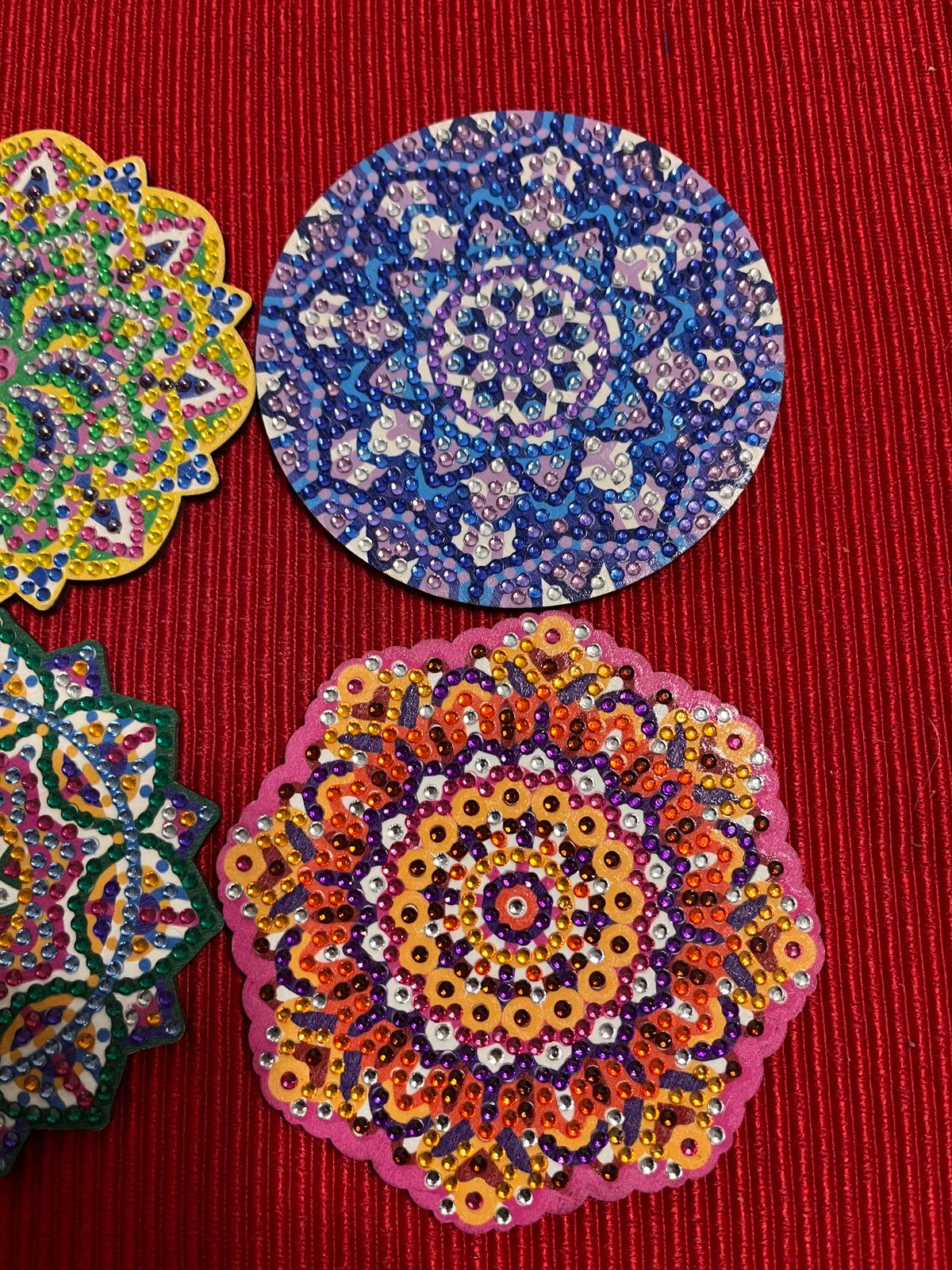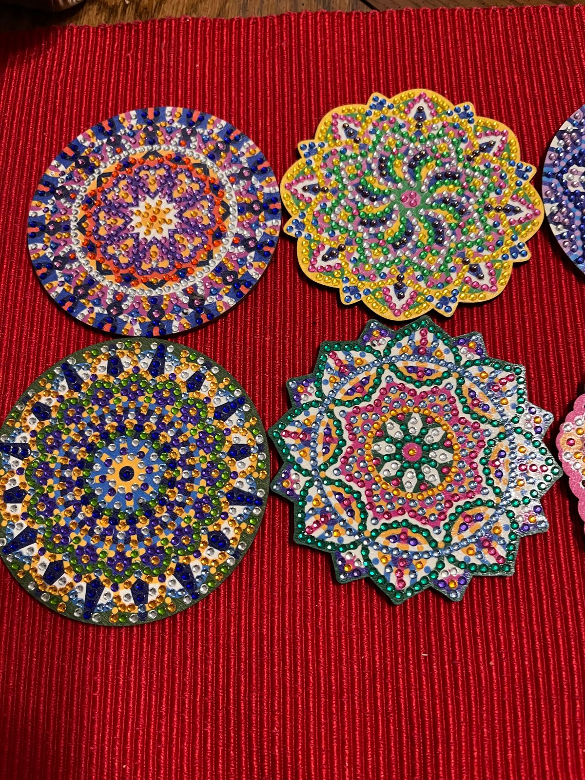 Was able to finish one coaster in between loads of laundry. I bought several of the coaster kits to do with family at our Christmes gathering this year. I think that even the grandkids will like these and they are small enough to complete in a couple hours. Colors are bright and vibrant. Diamond gems are smaller than I thought they would be but the tool makes it easy to place them. (Also the bonus of purchasing several kits means several family members can create at one time.)