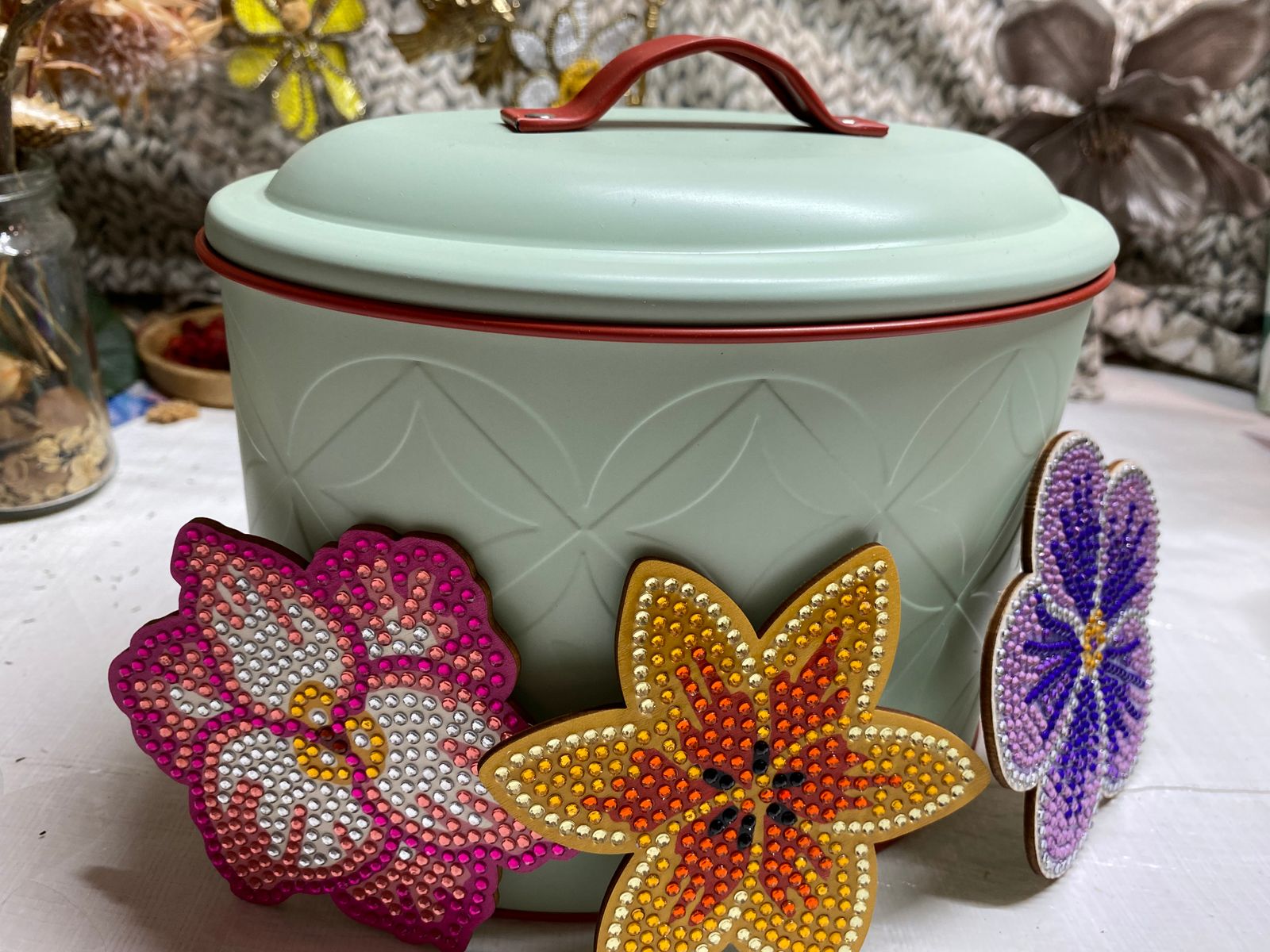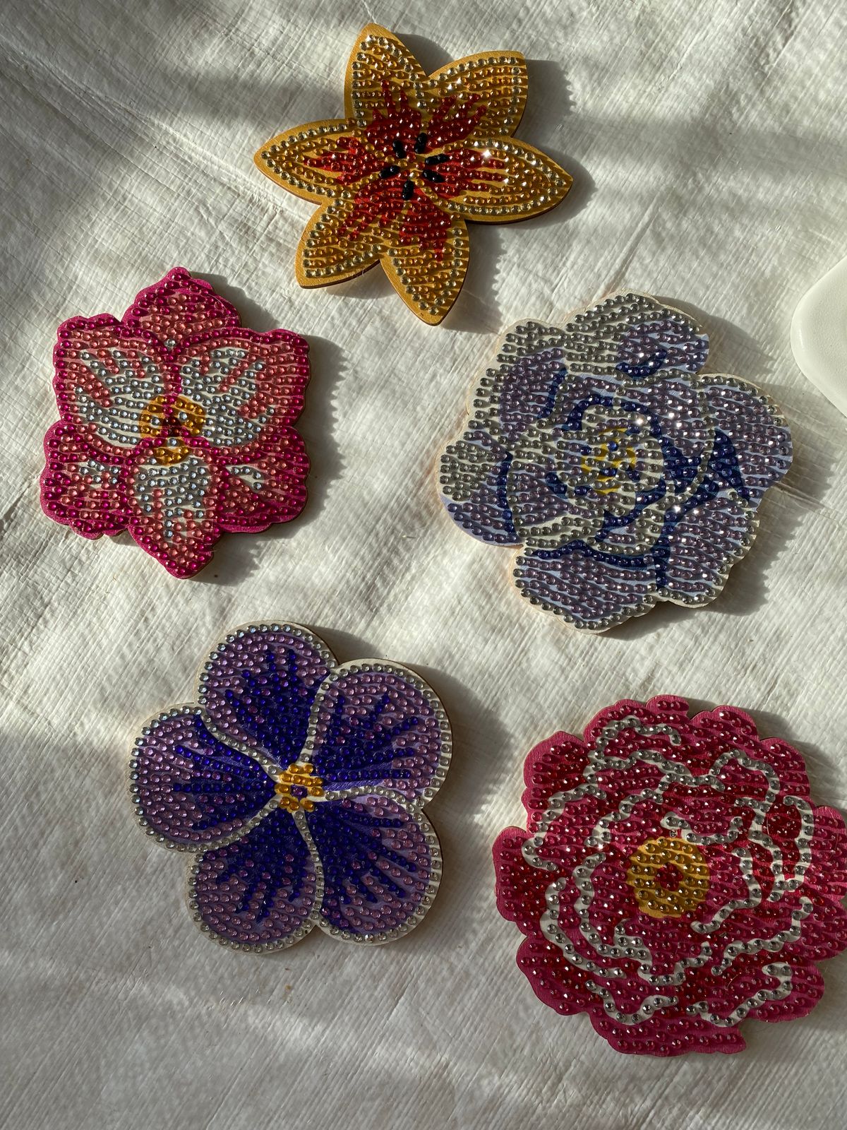 I love that the coasters were in flower shapes . They were a joy to do and very sparkly (gave the red rose away as a gift) and using them as decoration on boxes , would love to see more oranges in the range