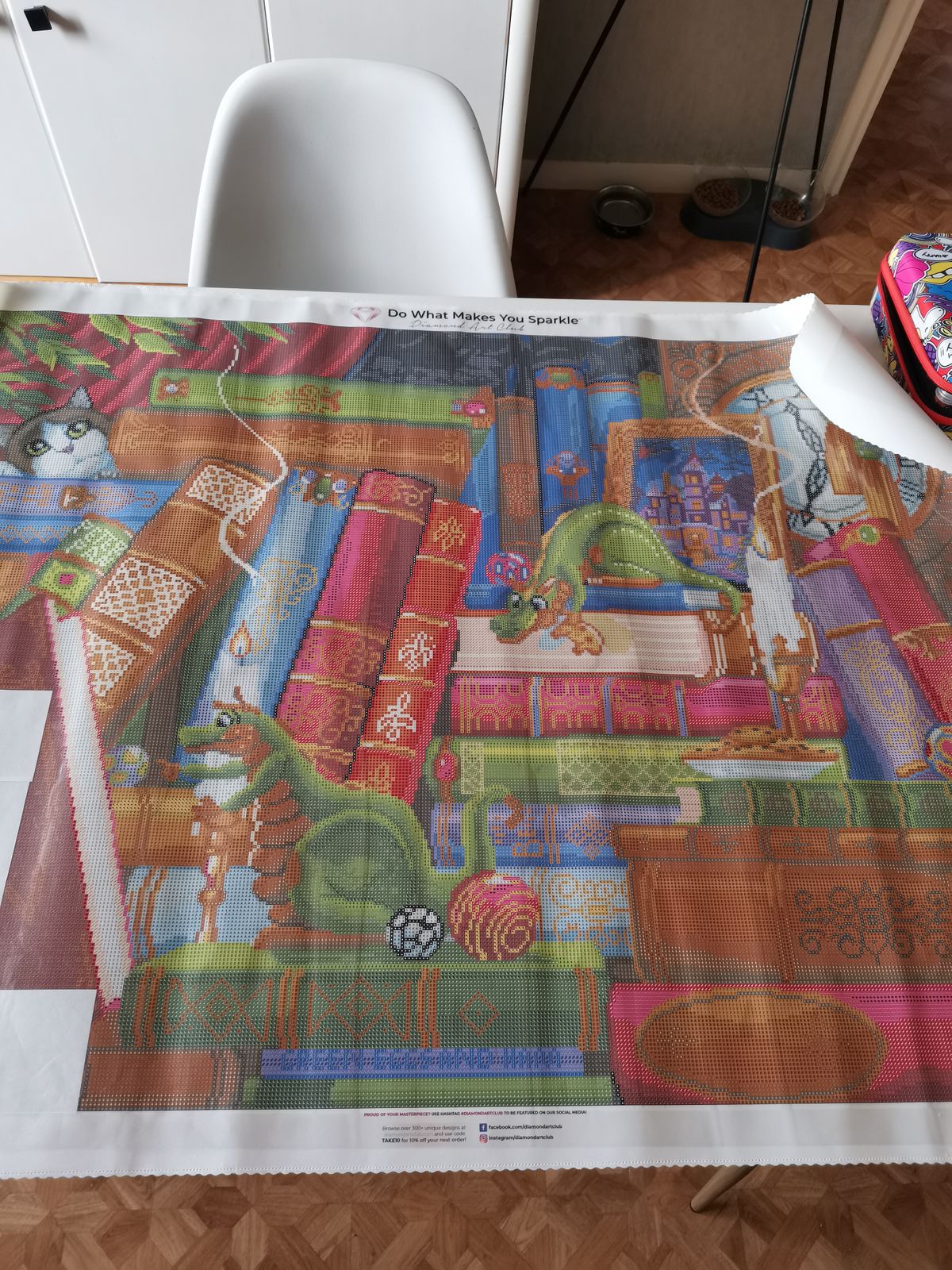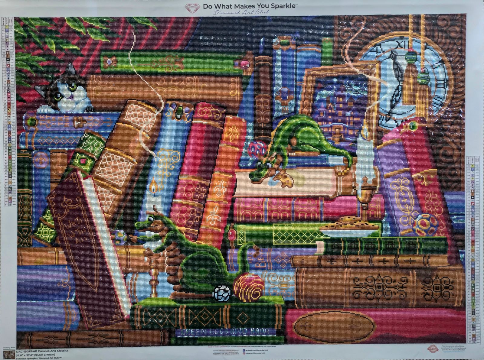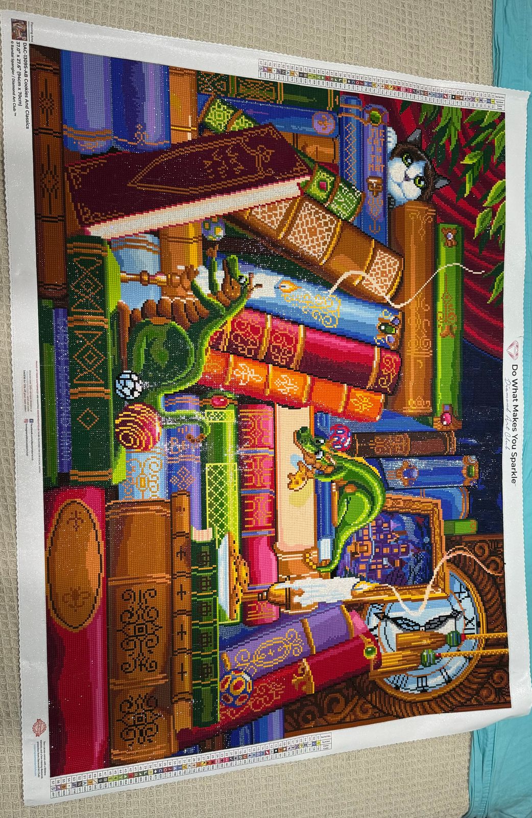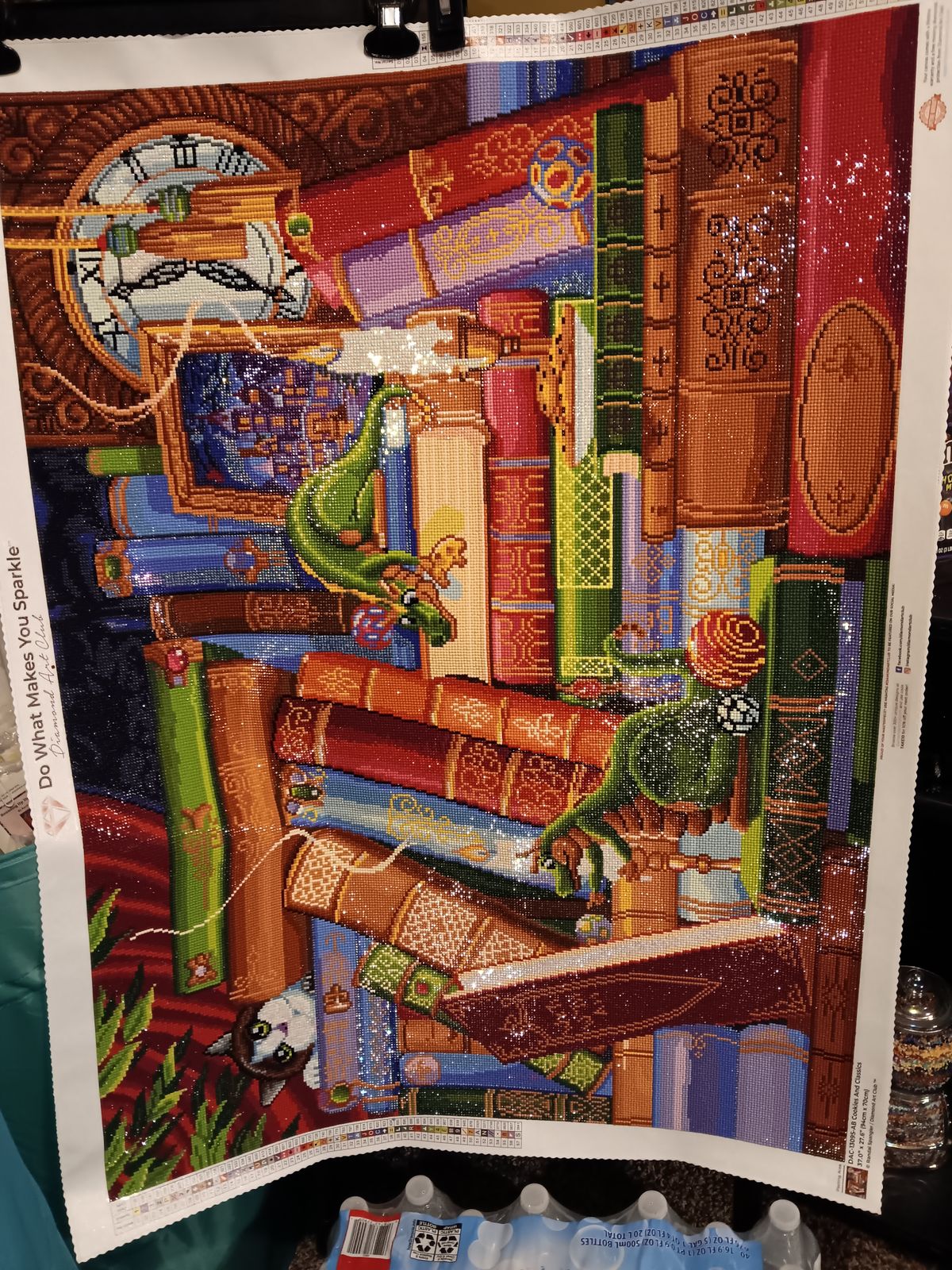 Enjoyed working on this piece. Liked the variety of books and some of the titles. Just a side note. I don't know if this is an older kit or not, but it seemed there was a lot more gapping in this picture than my previous ones. I don't know if the drills were abnormally small, or if the canvas was printed with slightly larger squares. Finished product still looks good, just something I noticed while working on the painting.