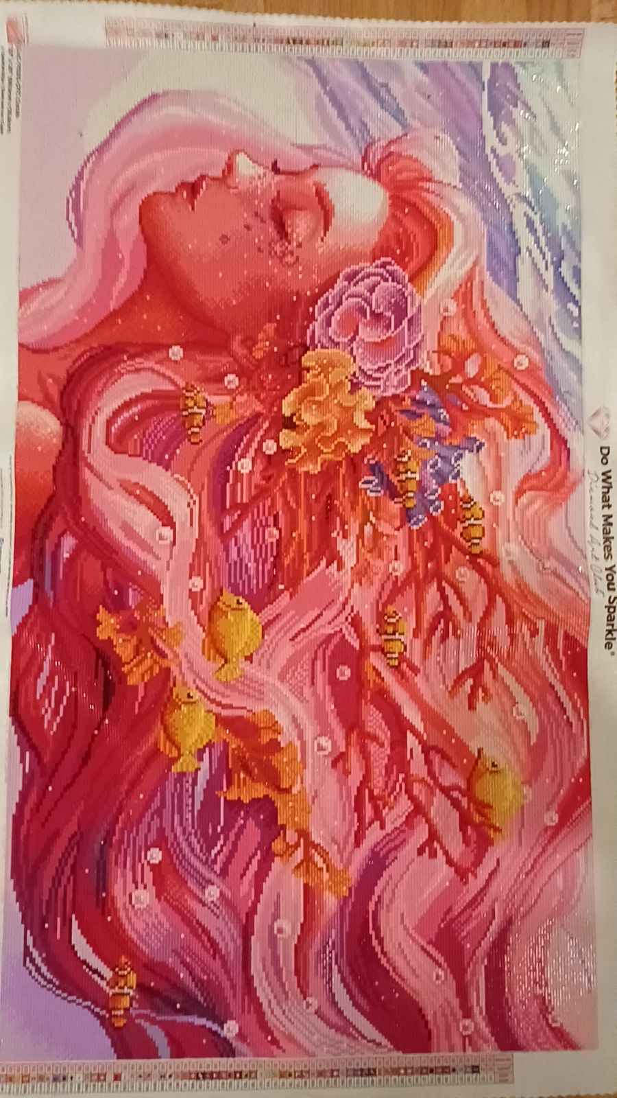 She’s lovely! This is a large canvas at around 88cm x 50cm, but it’s amazing. Love all of the little clownfish and yellow tangs swimming around her.