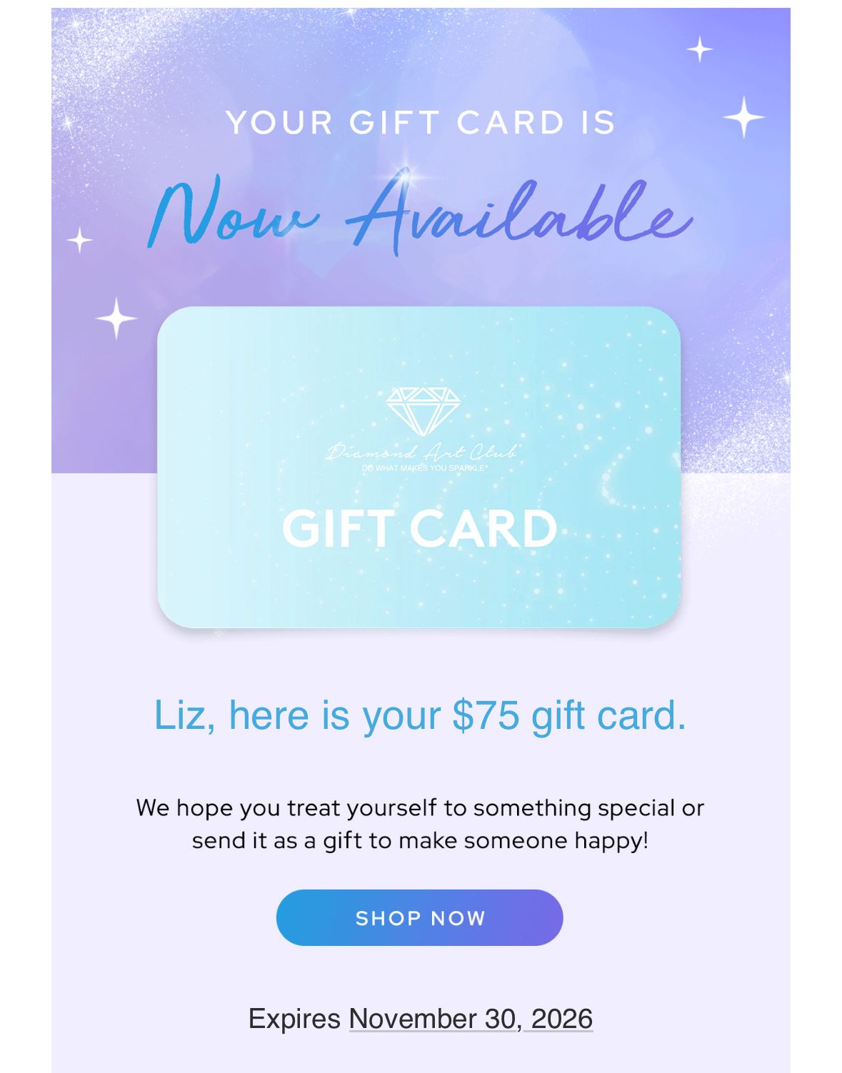 “This gift card is such a great idea! It’s fast, convenient, and perfect for anyone who loves diamond painting. Diamond Art Club always delivers top-tier quality, and a gift card lets you pick the canvas you’ve been dreaming of. Highly recommend for birthdays, holidays, or just because!”