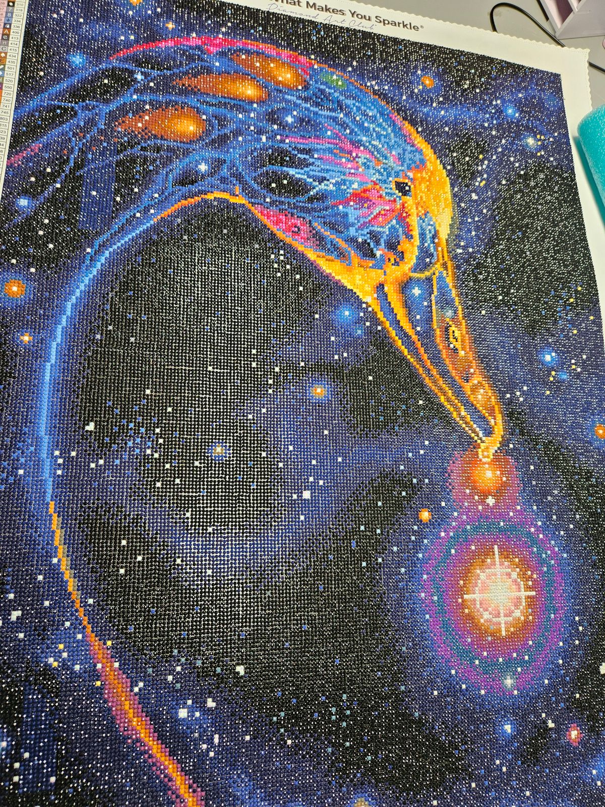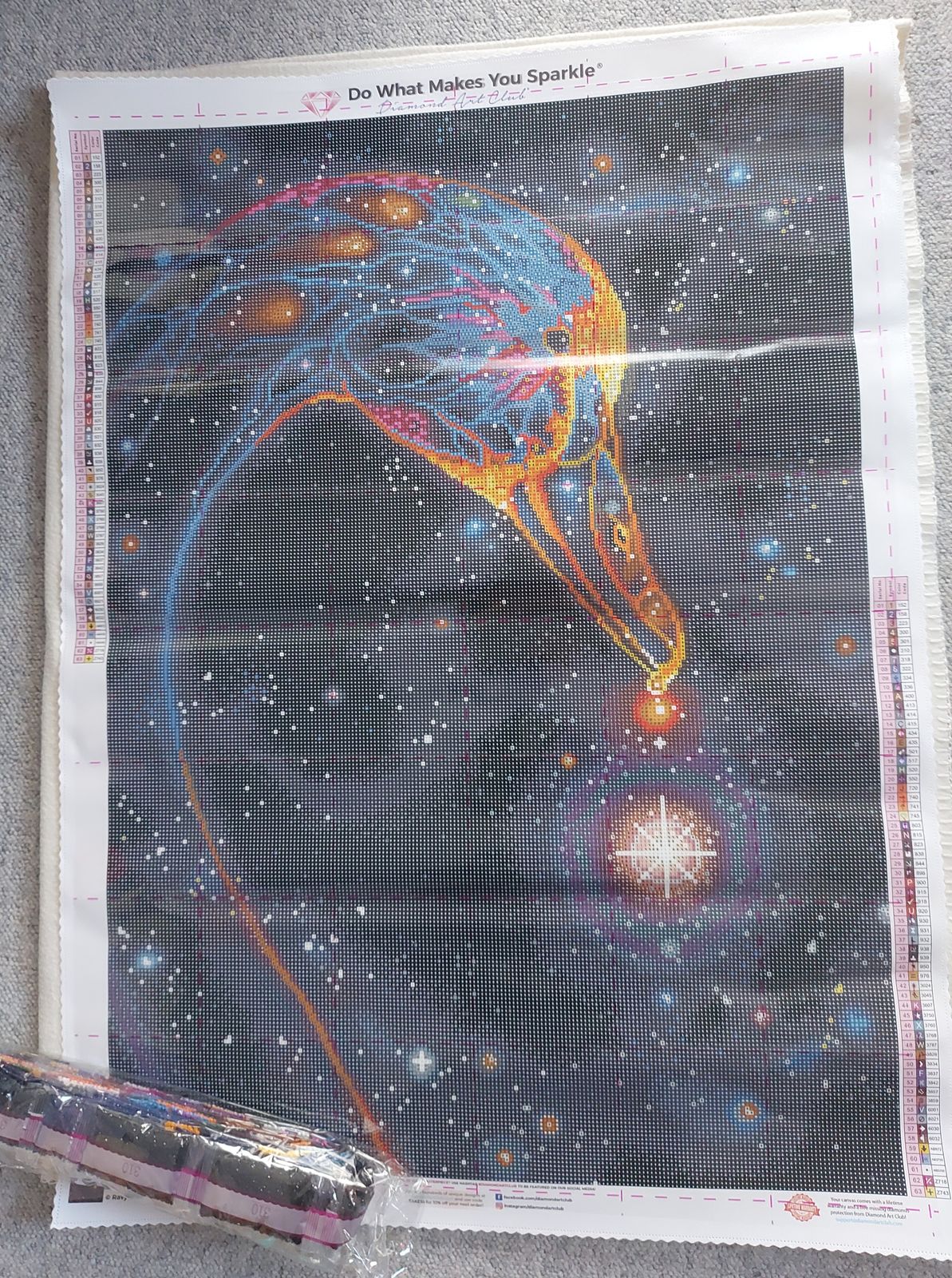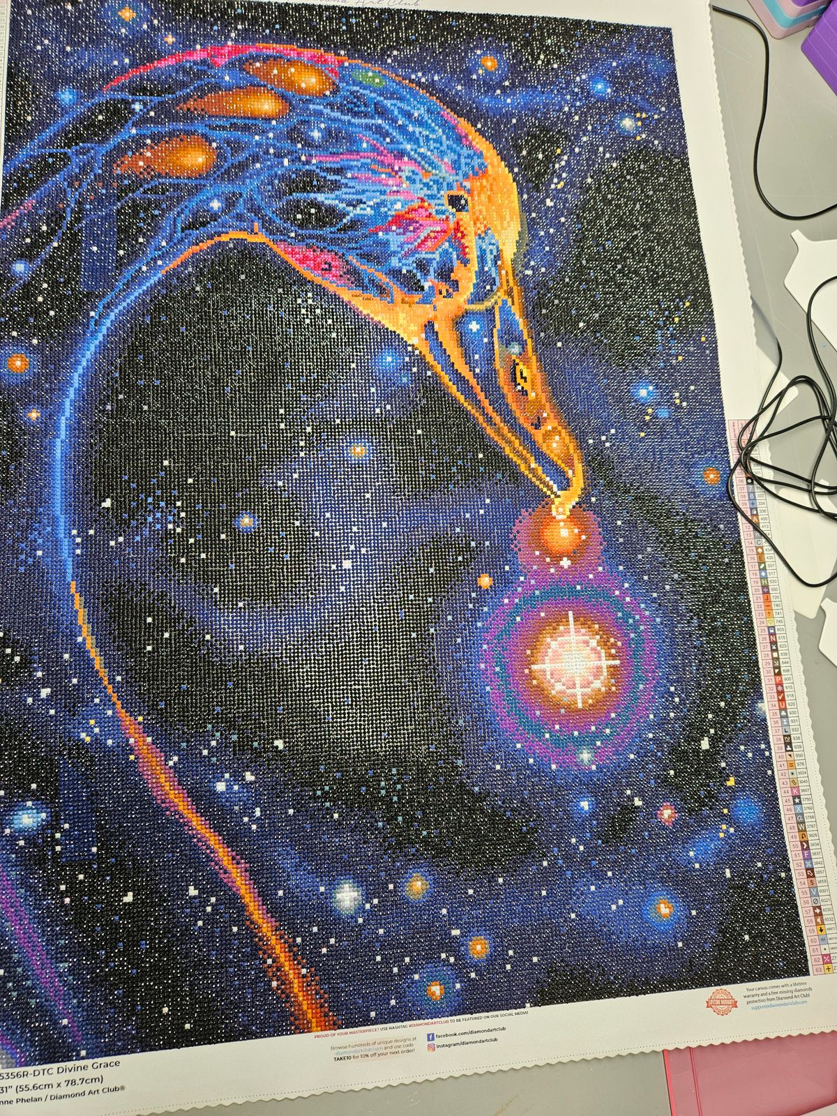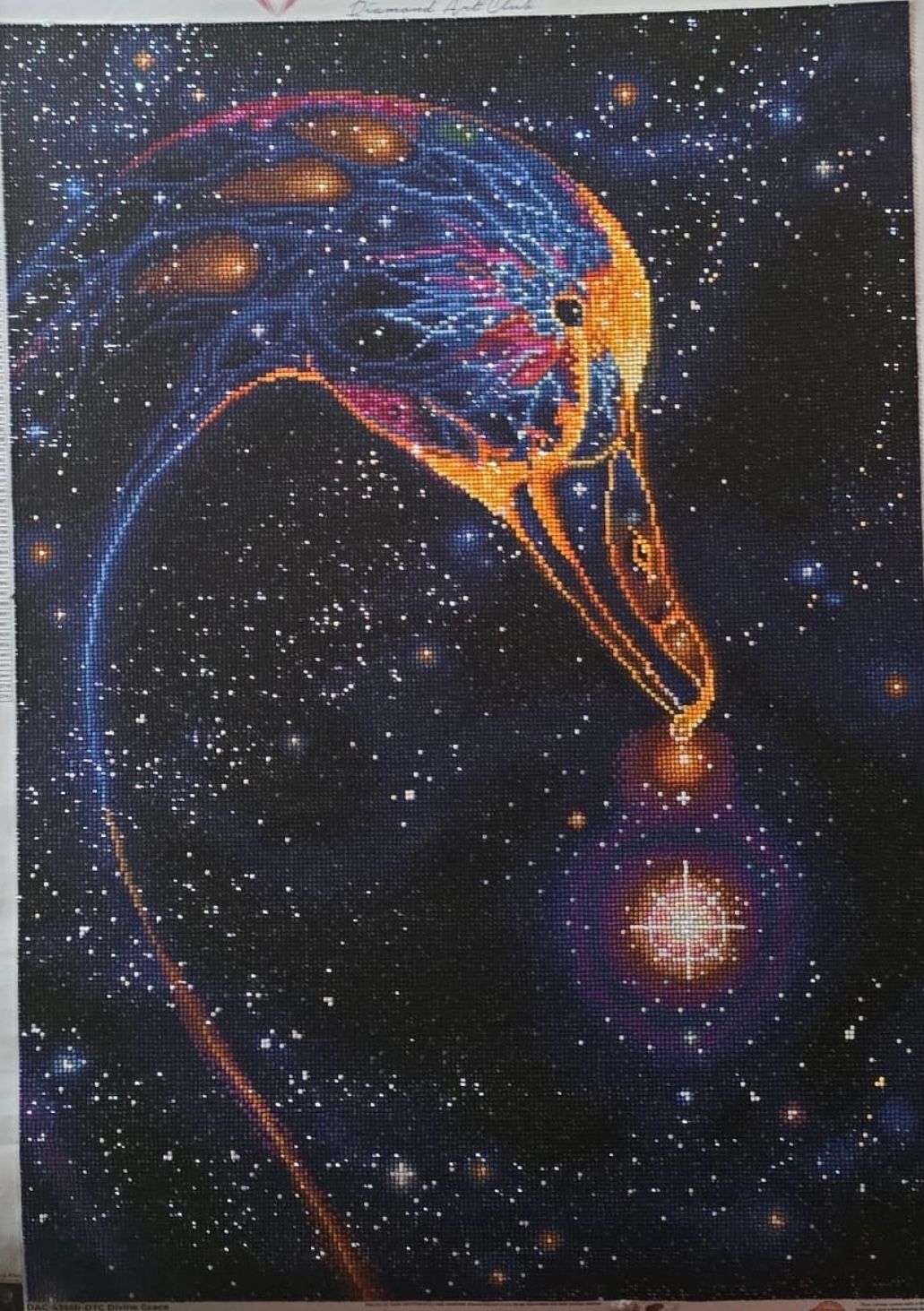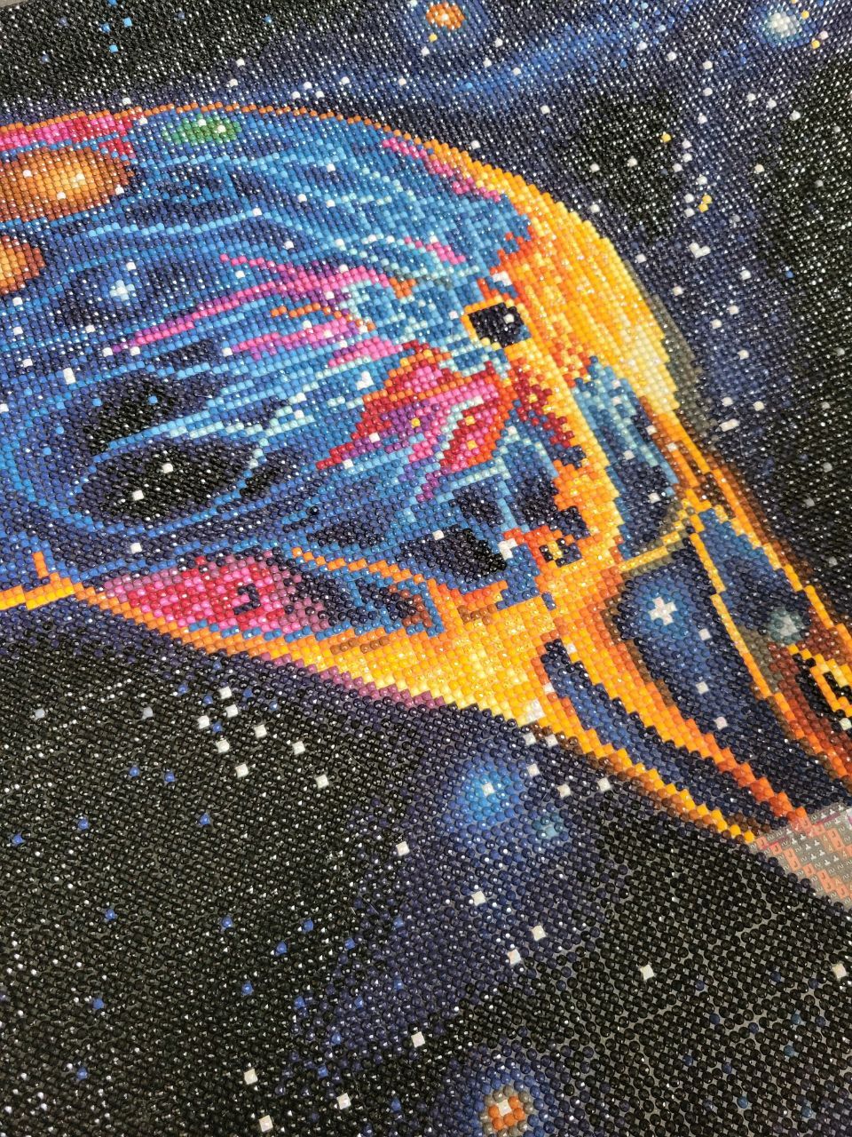 My first big diamond painting - loved working on it. Loved the result even more! Easy and relaxing process, beginner friendly (as this was only my third DP and I managed!). There are a lot of dark-colored blocks, not only black, but like four shades of dark blue too. Which makes gorgeous soft color changes in the final picture. You can see the space! =)