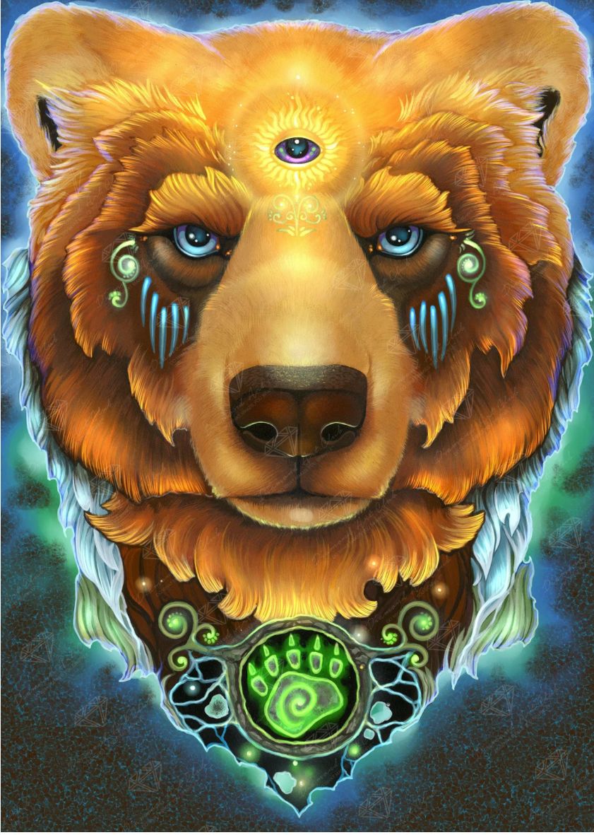 Bring a golden bear's radiant energy and power into your mind and soul. Focus on the iconic symbols of strength and wisdom emanating from its intensely focused eyes of blue.