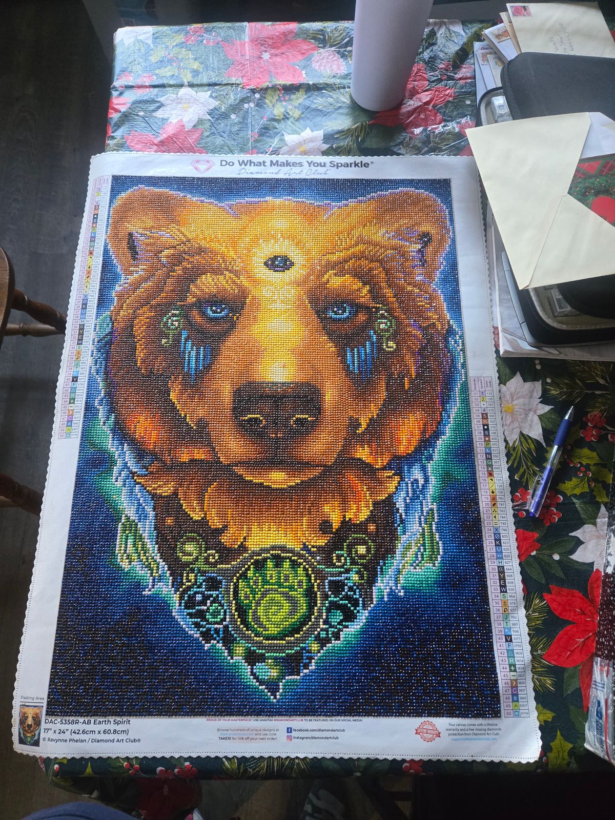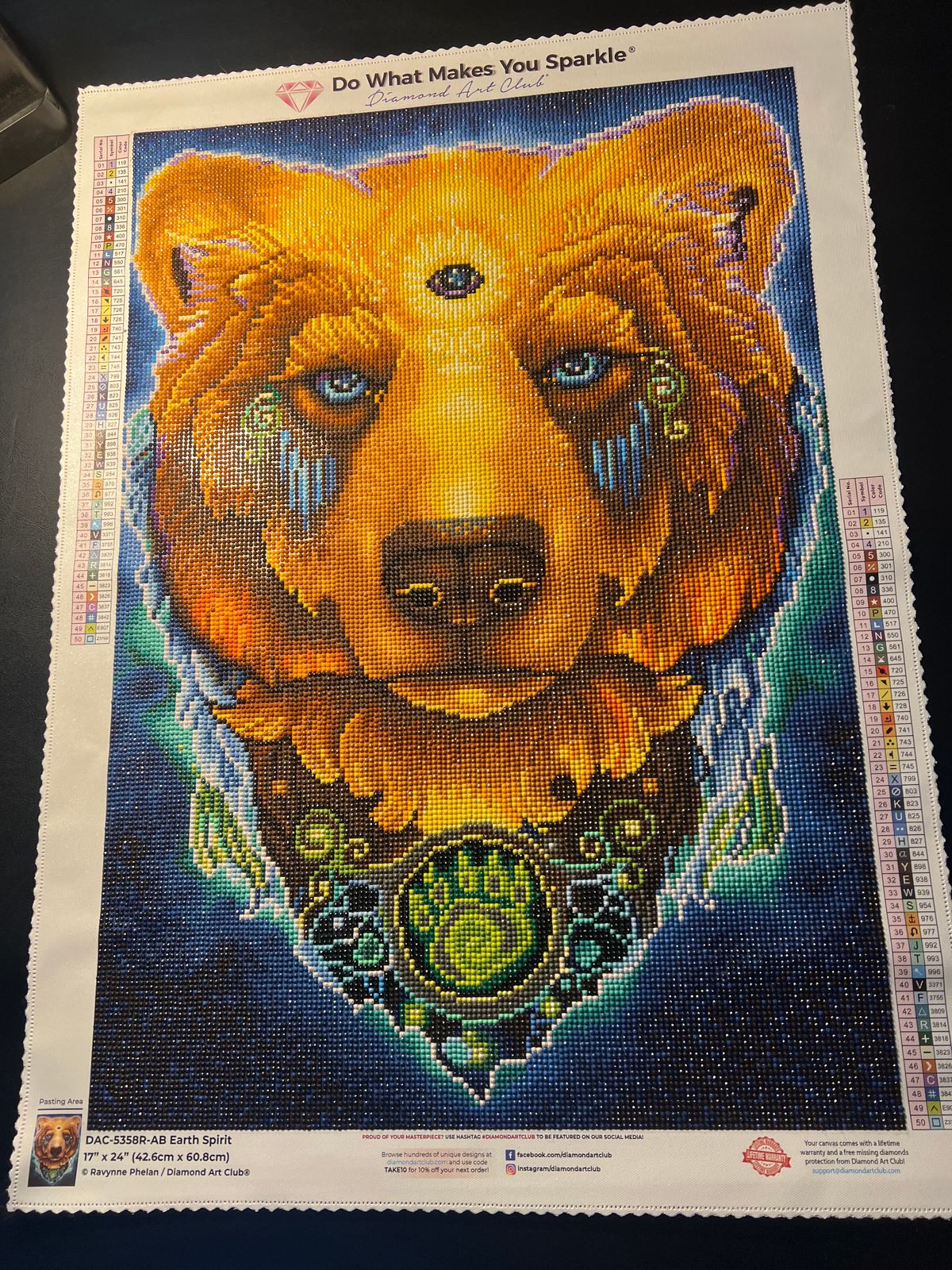Symbol # is incomplete, instead symbol looks like 2 lowercase ll. Also symbols printed near bottom harder to read with and w/out light pad. Otherwise normal DAC canvas, glue was scant in spots. The moss green ABs look not good, replaced most with crystals. Wasn’t happy with rendering around third eye area, too subtle. So swapped those for some crystals and will add pixie dust crystals when come in. Going to use slivers under eyes instead of blue drills.