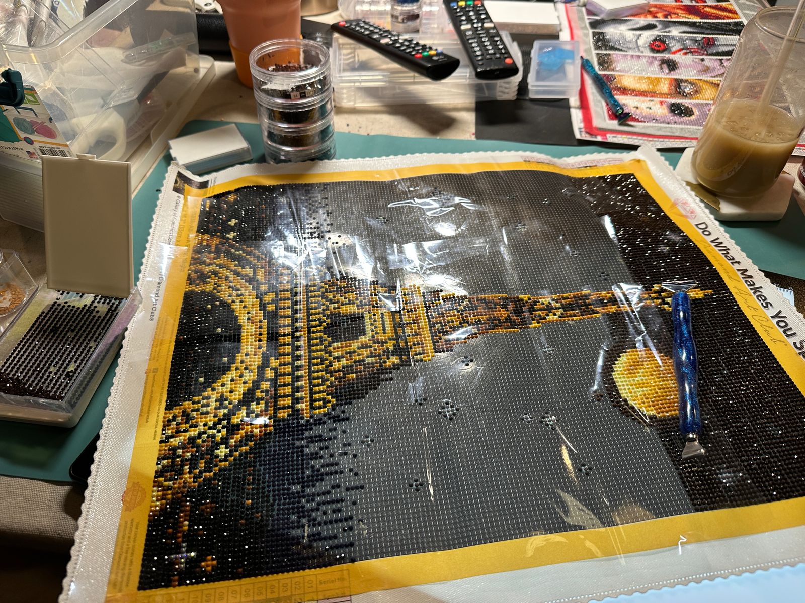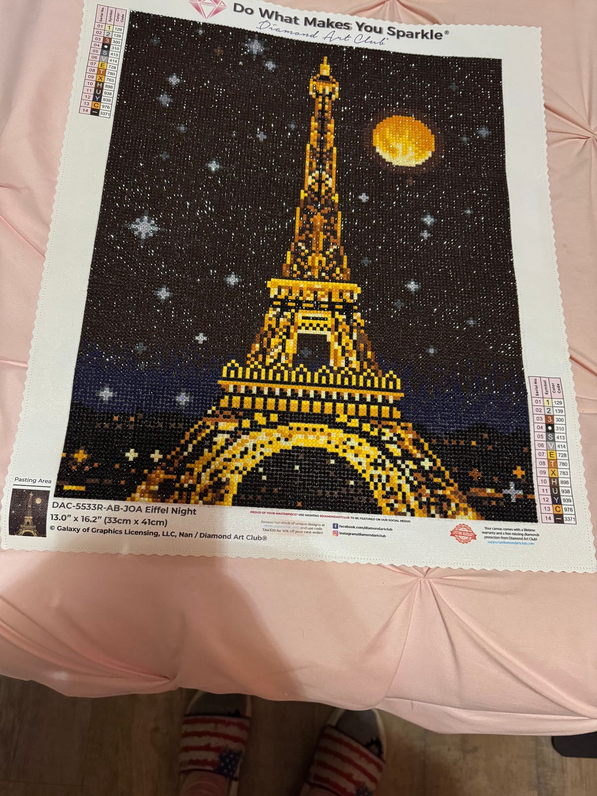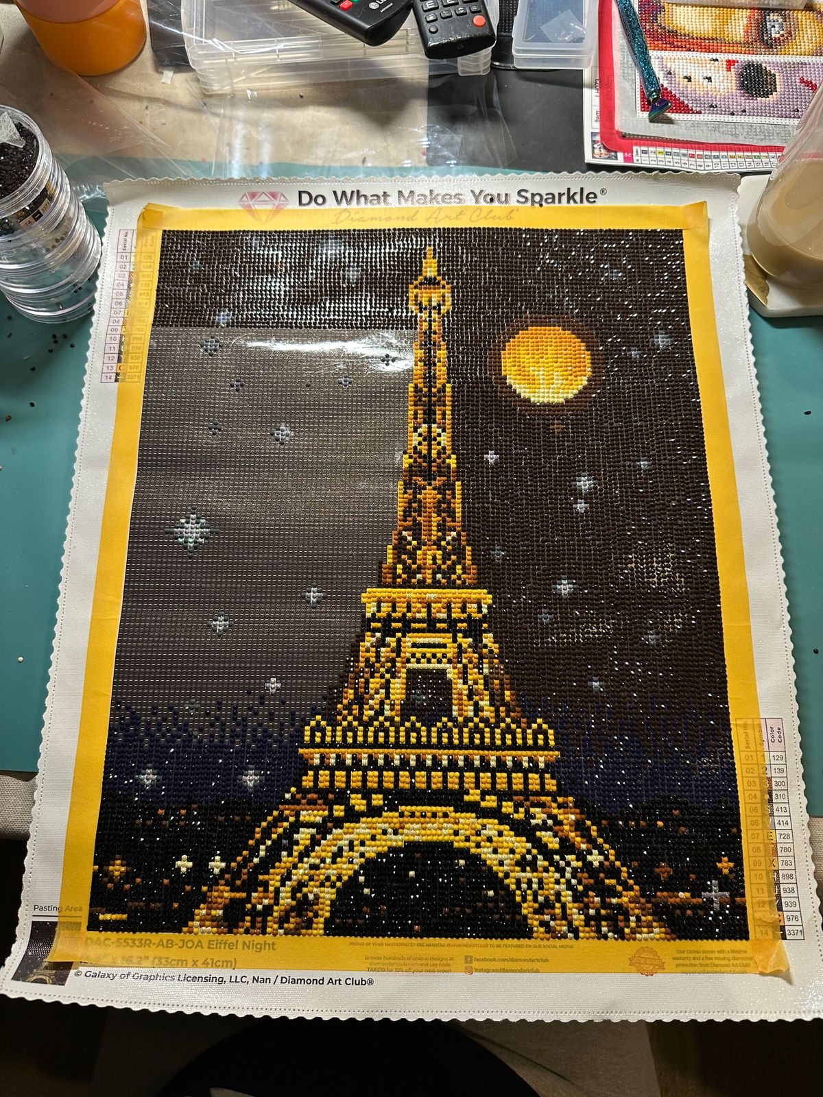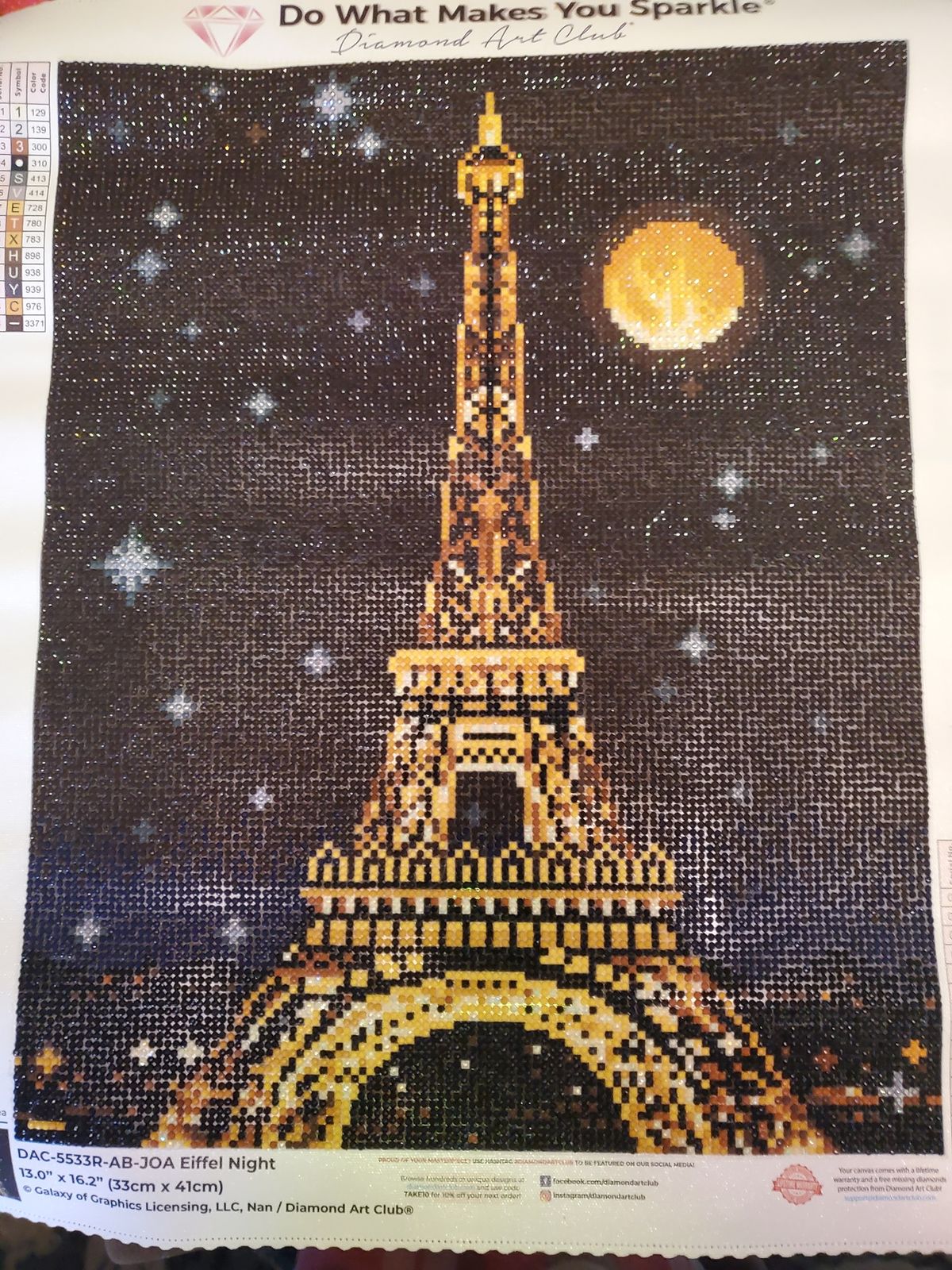 If you didn’t get this Eiffel Tower you missed a good painting. It was so exciting to do because I ordered special drills and it was worth every cent. I even had special drills for the stars. The finish was so beautiful on the black background. Canvas and drills were great as usual