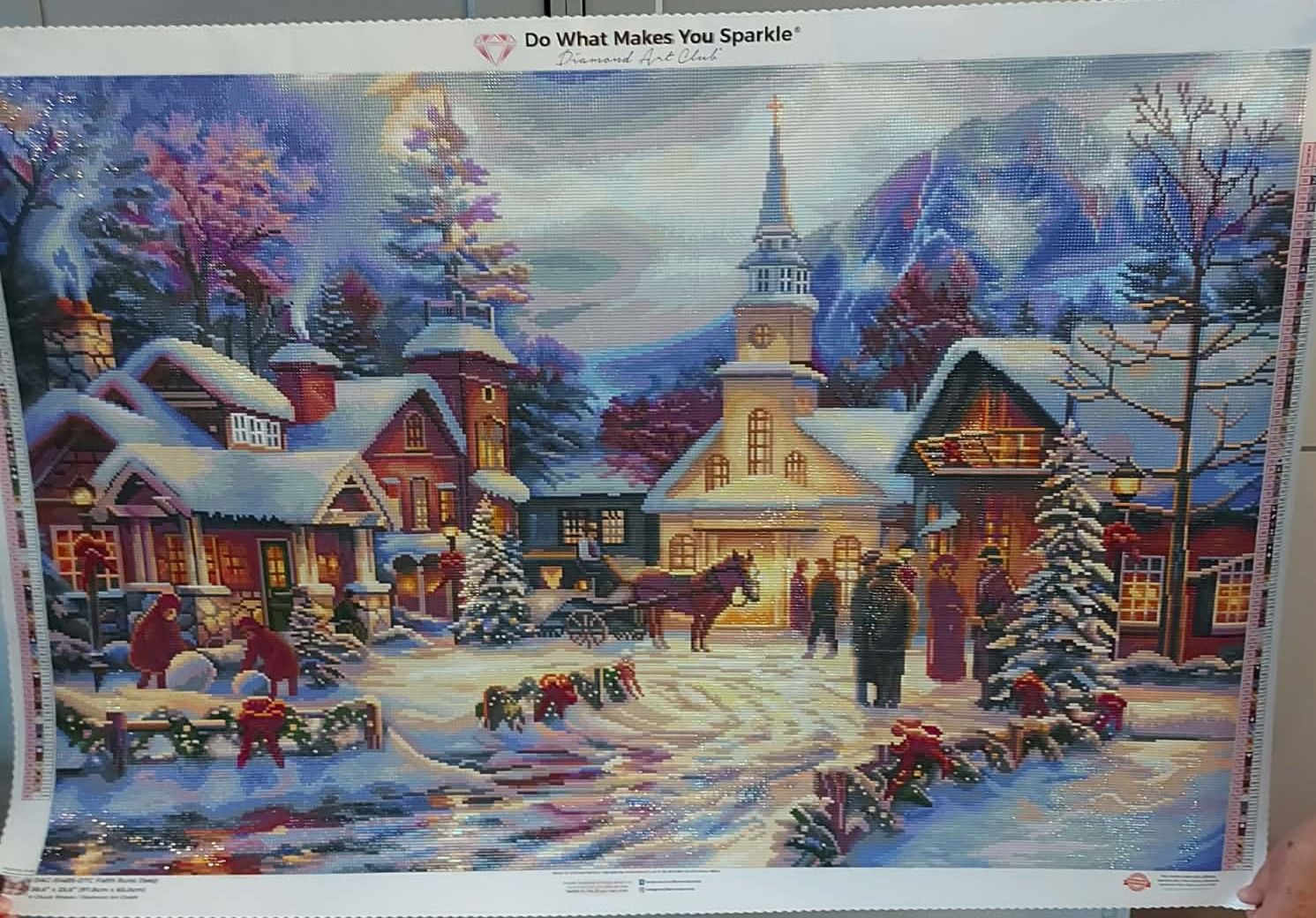 This was my fifth diamond art project. When I received it I found it overwhelming and thought I was not ready for this. DAC had a film over it that was sectioned off in squares. The canvas is super nice and velvety and drills are good quality. I did the piece section by section. It was addictive and relaxing. Finished it in 6 1/2 weeks. I couldn’t be more proud and happy with this diamond art project