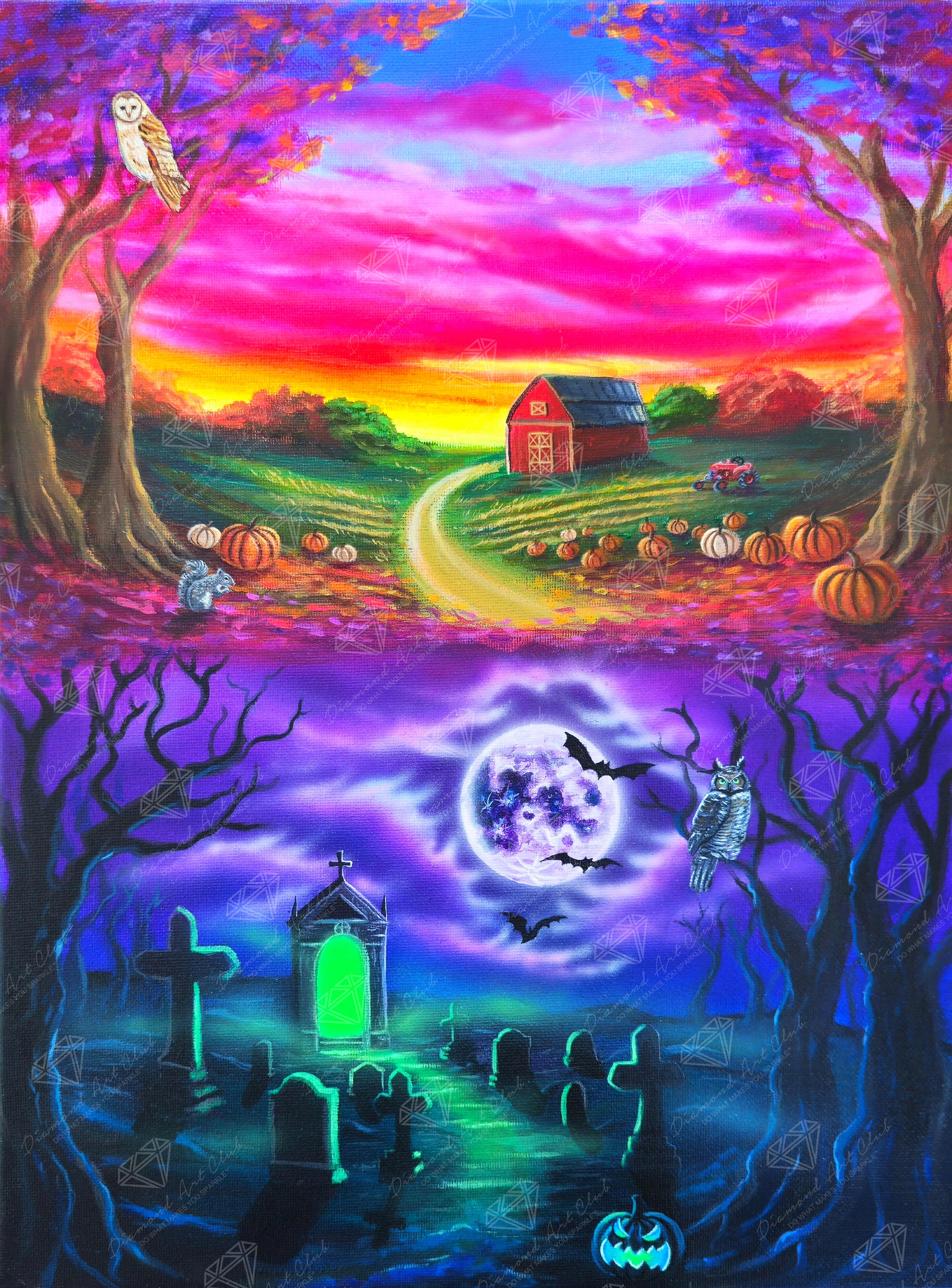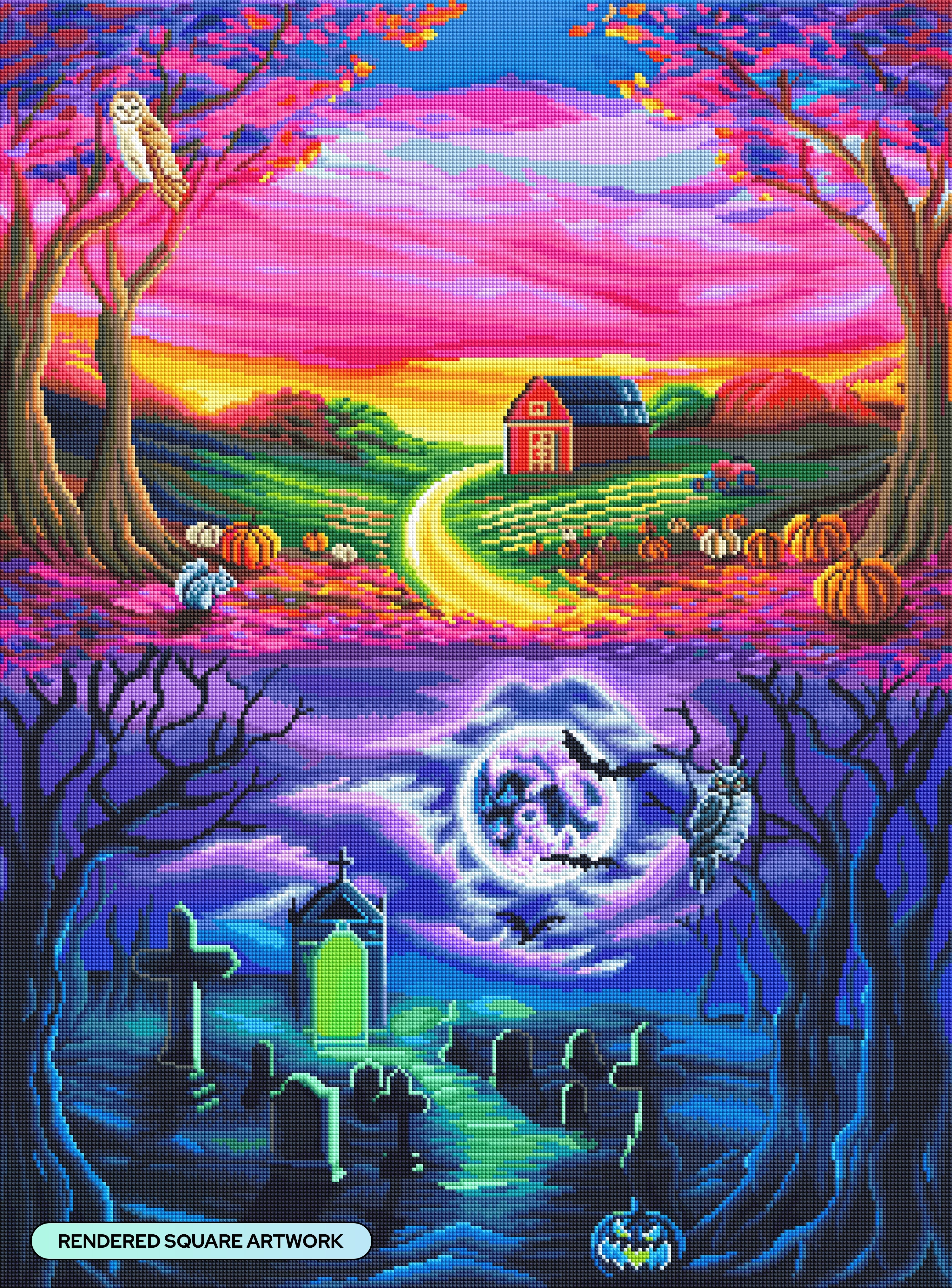 Step between two worlds where autumn’s mesmerizing color meets the eerie glow of the unknown! Experience a dance of comforting enchantment alongside the allure of mystery under the moonlit sky.