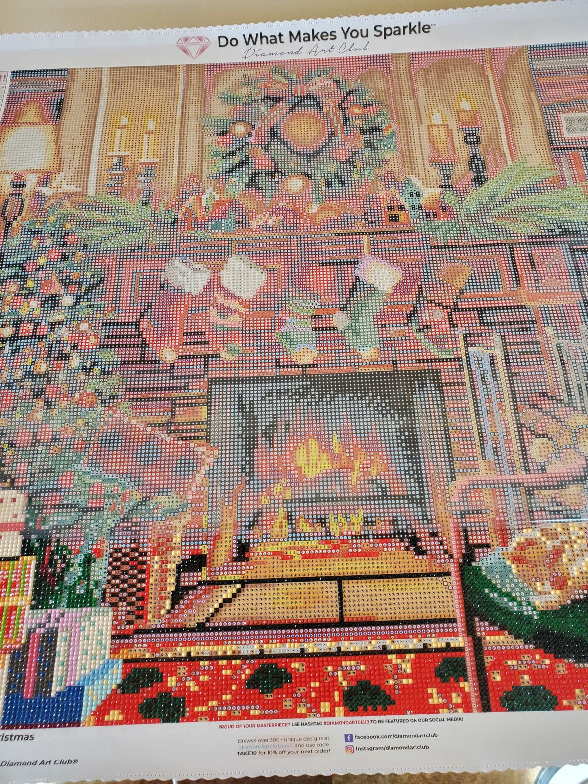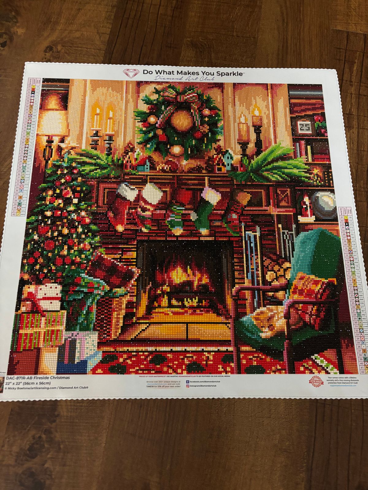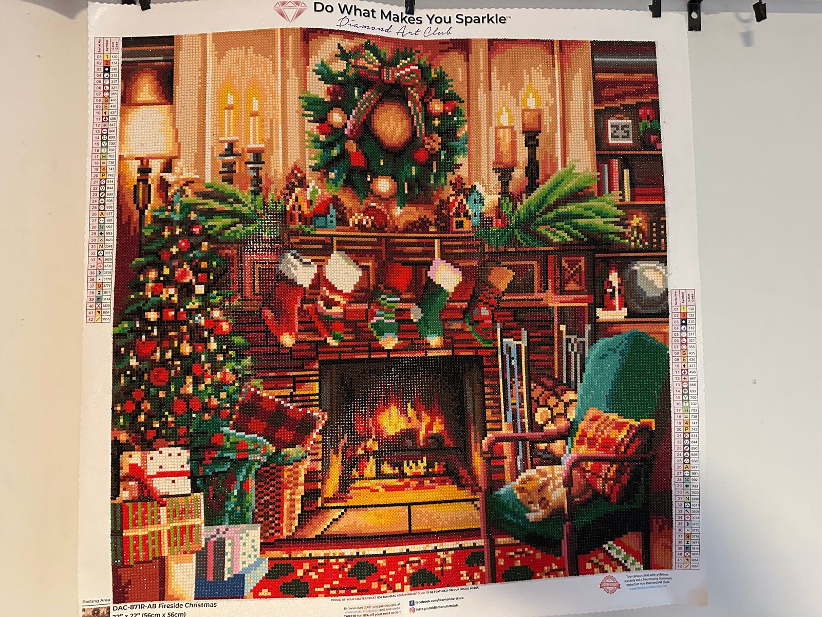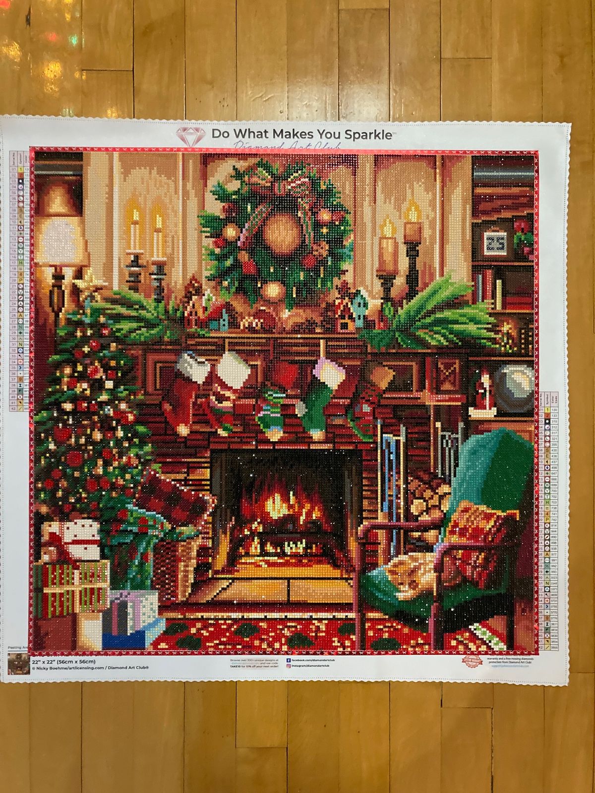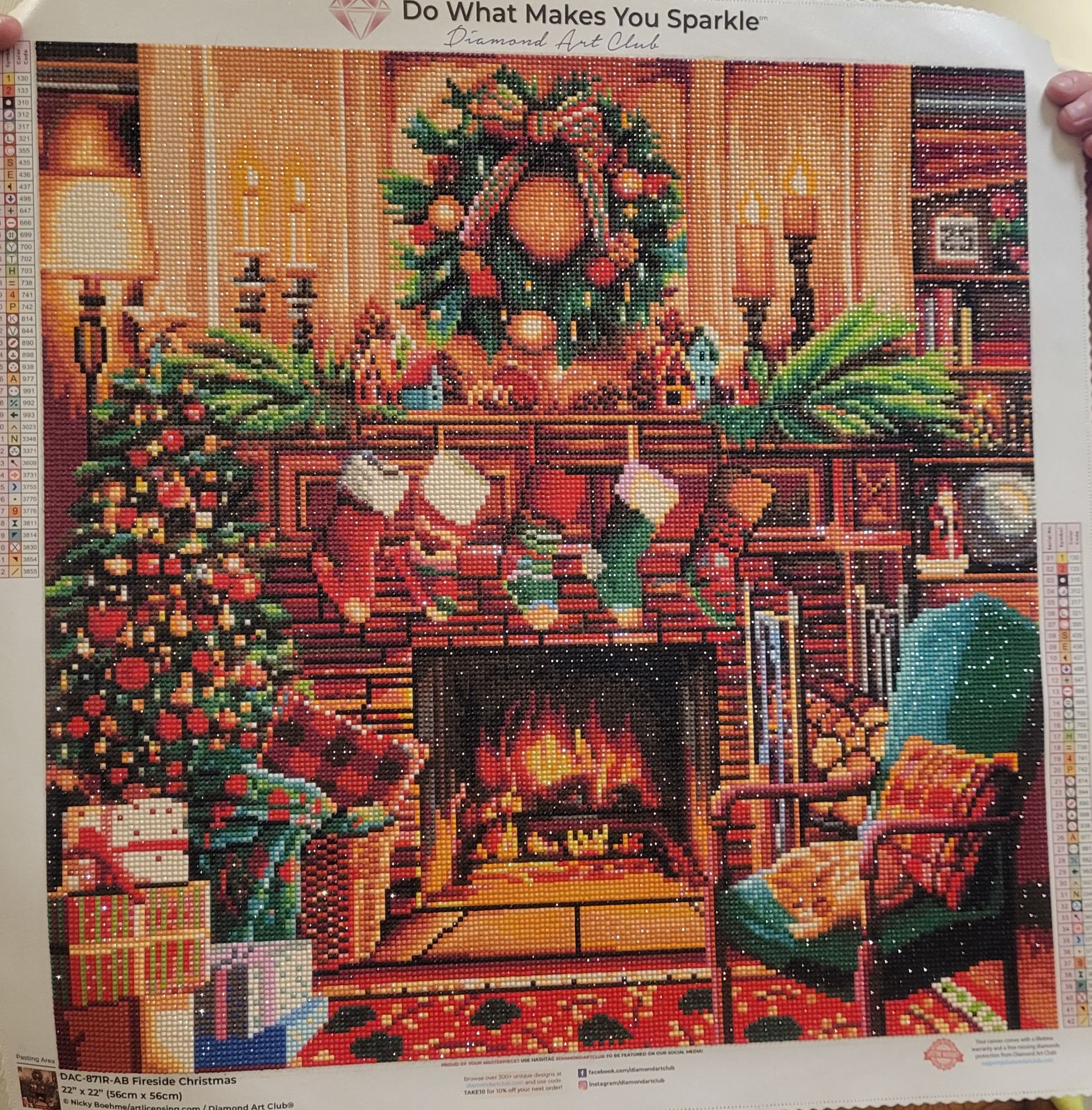 Snuggle up to the crackling sounds of Christmas with this dazzling diamond art painting of warmth and celebration. With a cozy kitty nestled by the hearth, presents and stockings sleep in quiet anticipation for the festive morning to come.