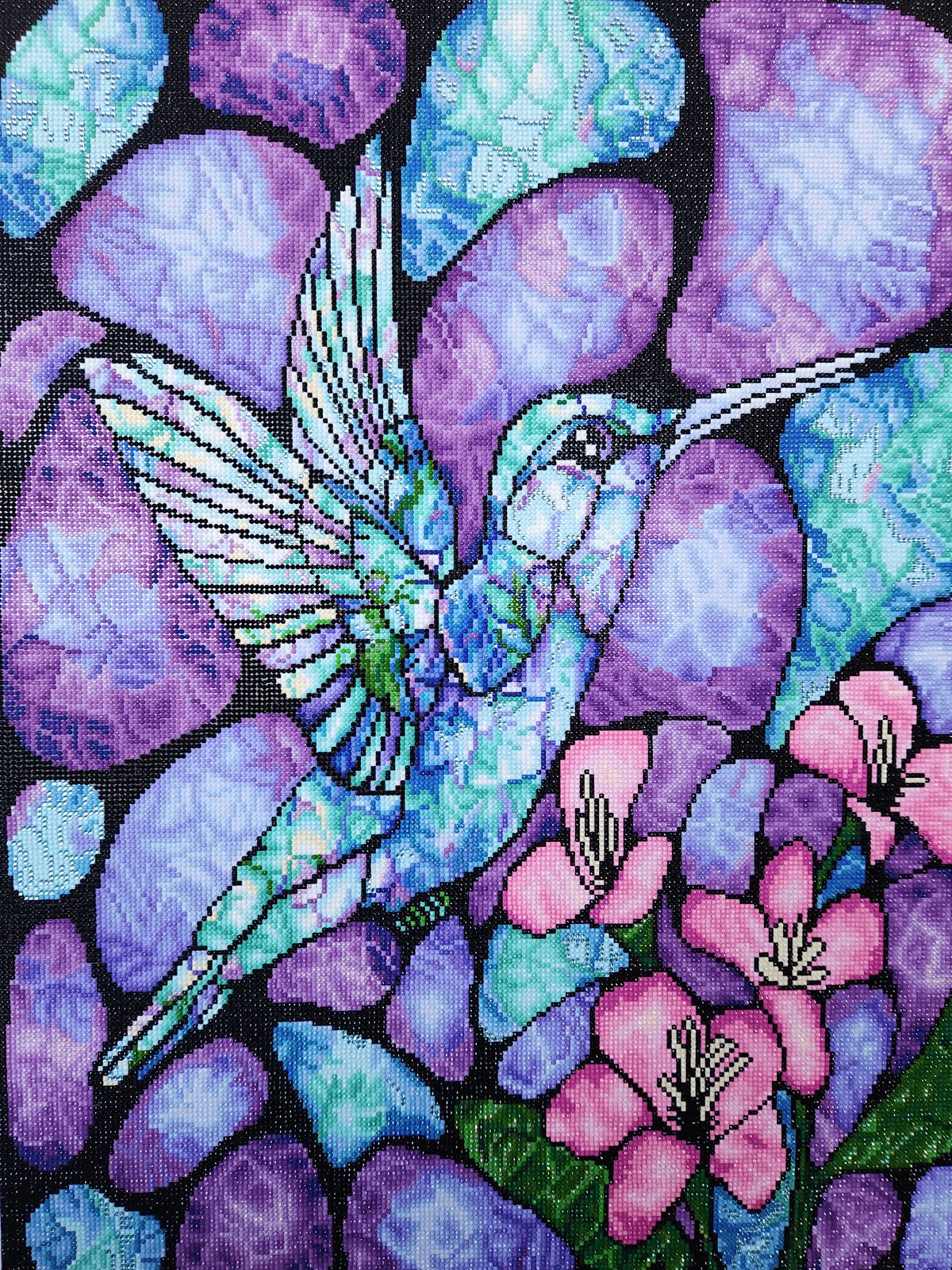 This has all the beautiful shades of blues and purples you could want and the hint of pinks make it pop. I truly enjoy working on the hummingbird it is spectacular the colors are amazing I just love it. This her me is in remembrance of my sister her favorite colors and her favorite bird. So it will have a special place in my heart