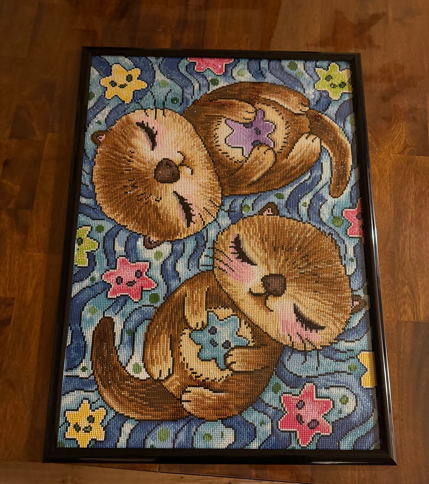 My grand-niece asked me to complete this canvas for her room. She LOVES it. The fur on the otters is rendered perfectly, it looks fuzzy! What a happy design.