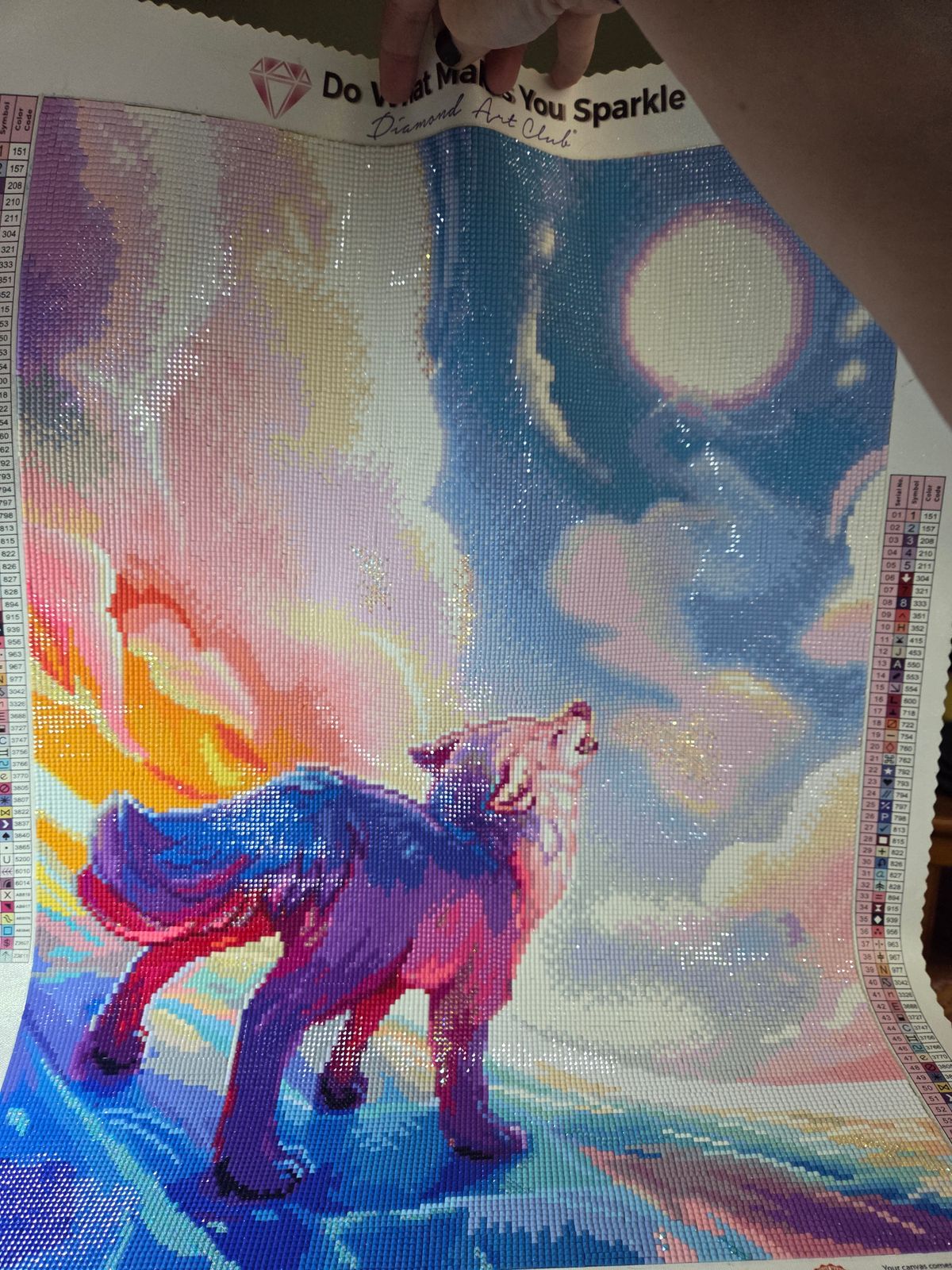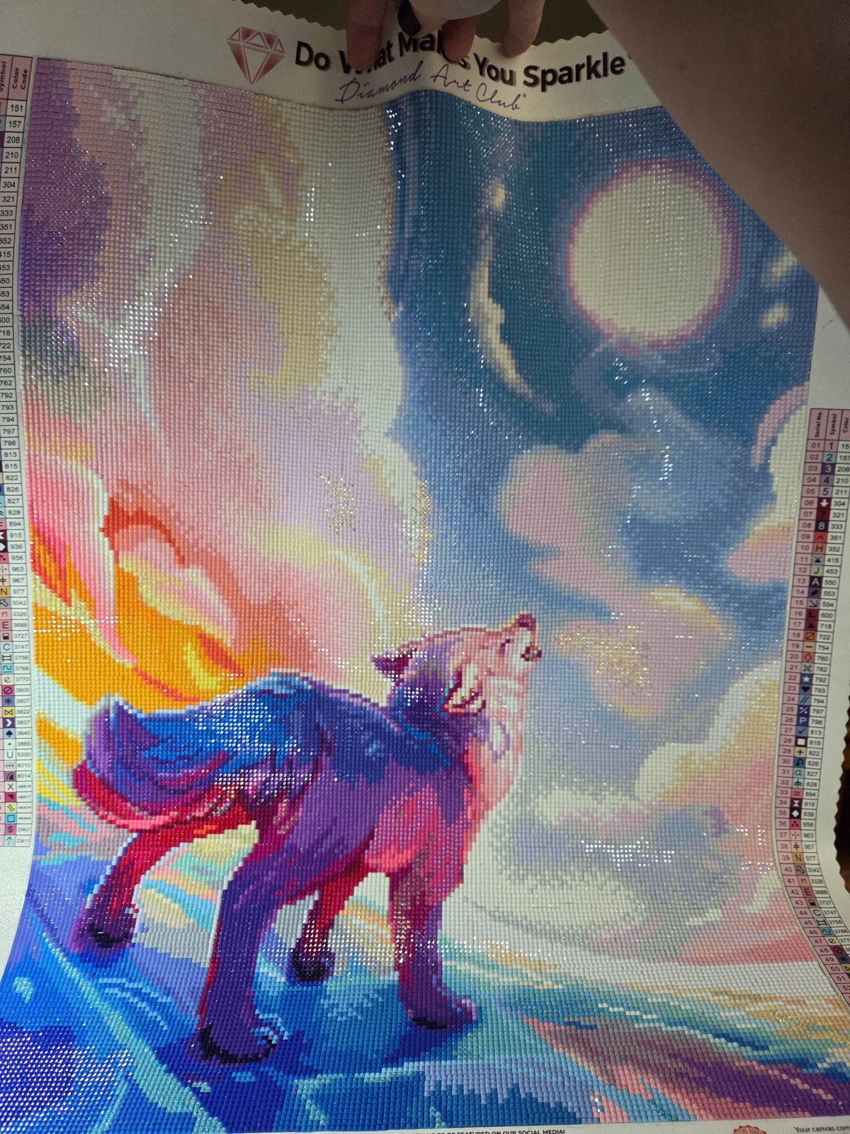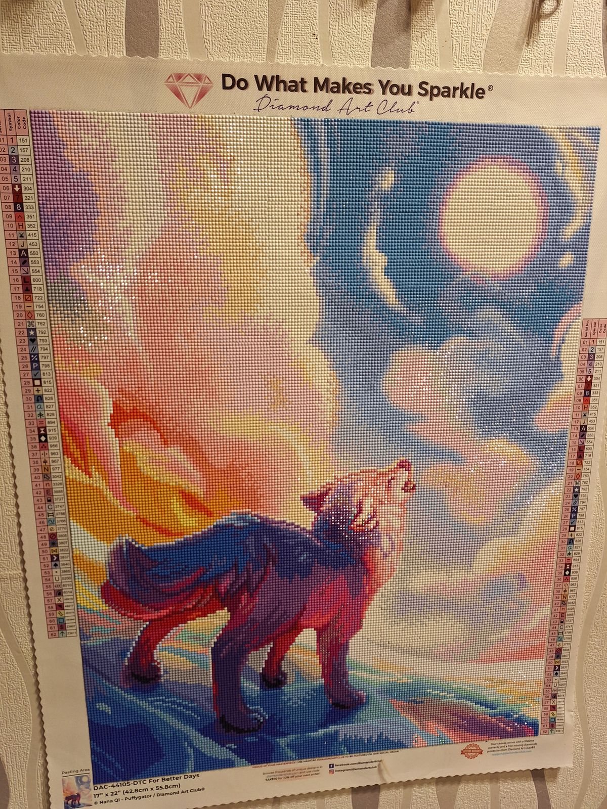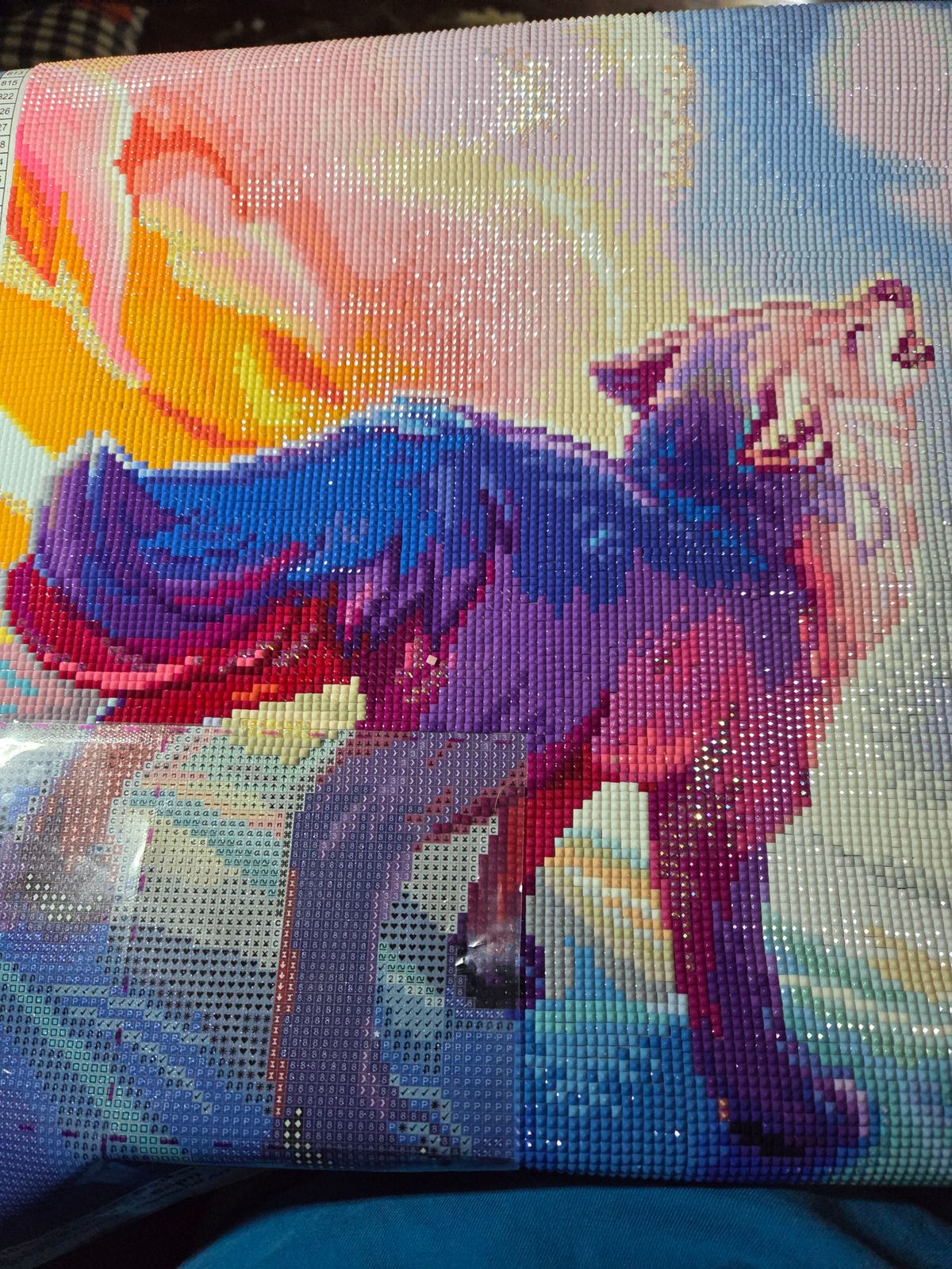 I had a bout of Diamond art block with this diamond painting because of how much sky their is, when it's Finnished it's so pretty and doesn't look like that much sky on it but it does, I love the final product it's very bright I love the yellows and magentas