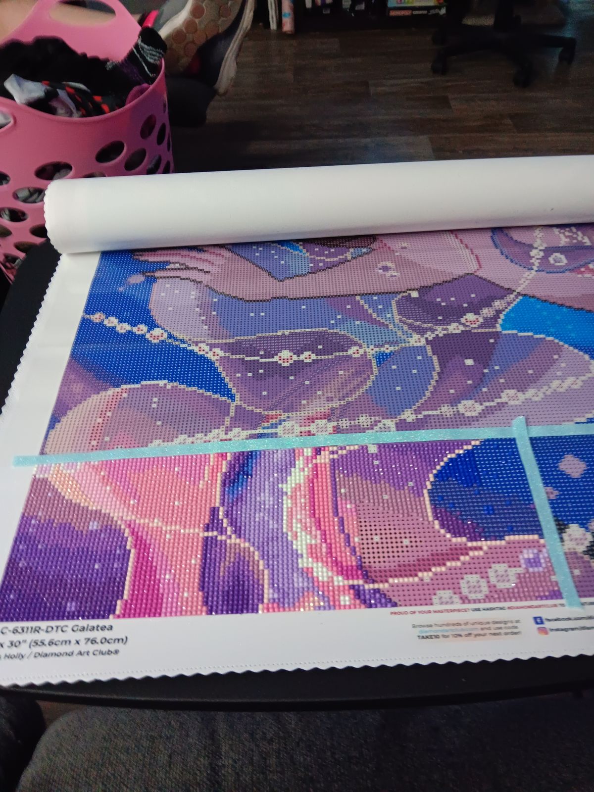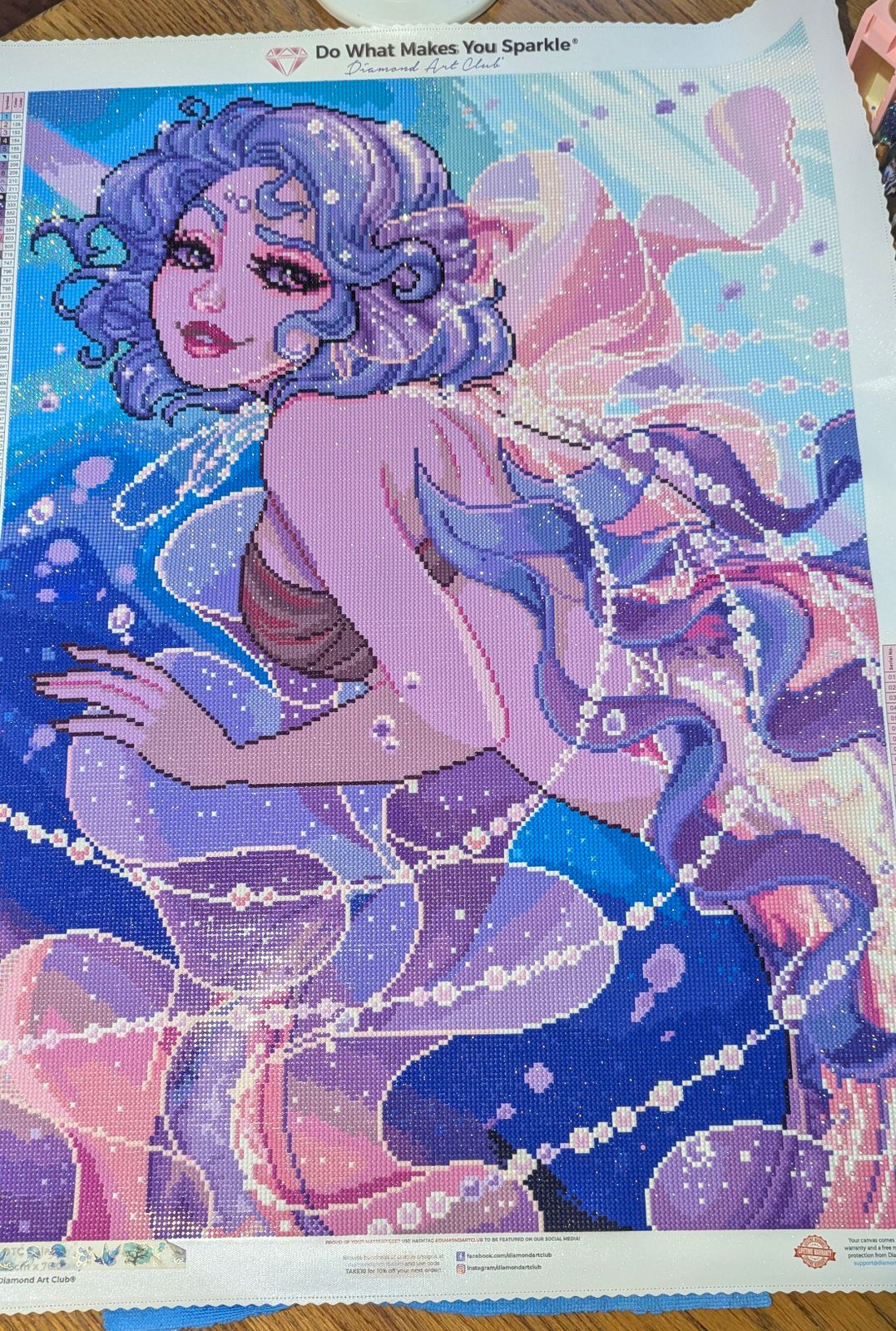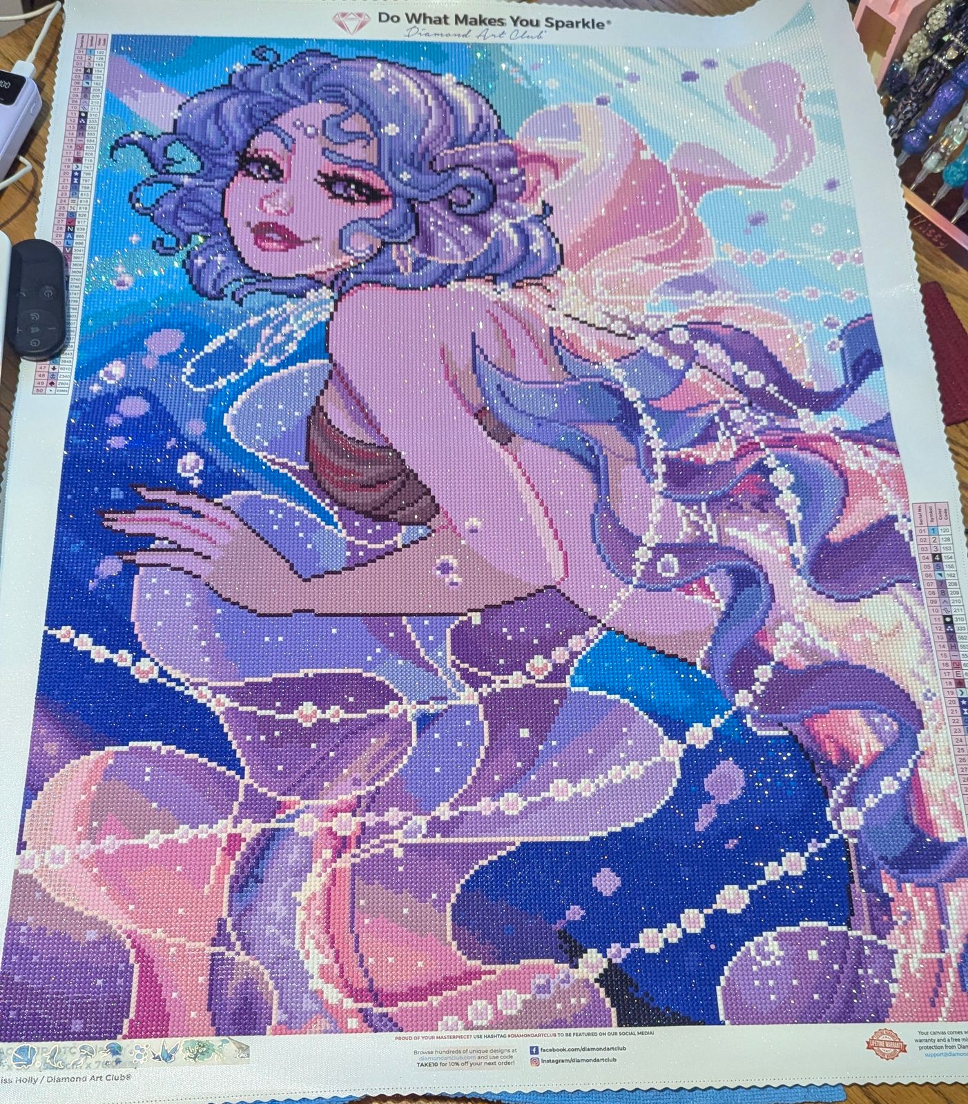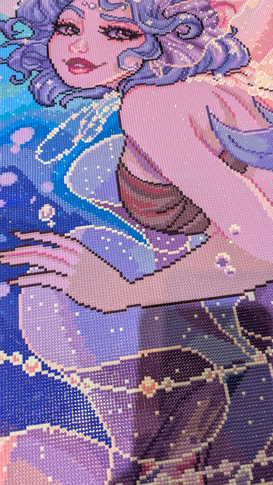Finished "Galatea" Artist - Miss Holly from Diamond Art Club. Started 9/1/25 Finished 9/14/25. 22 inch by 30 inch (55.6cm x 76.0cm). Older kit, No treasure card. Took me 33 hours and 14 days to complete. Round drills, 50 colors, 2 ABs, 3 Fairy Dust 55,752 drills. I had a blast doing this canvas. And I love the color purple 💜😁💜.