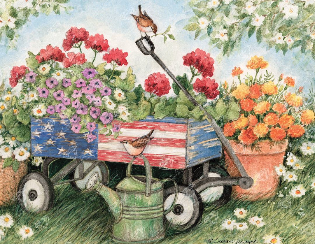 Filled with daisies, geraniums and pansies, this patriotic garden wagon is perfect for perching while making friends. Paired with a pot full of marigolds and well-loved watering can, this painting is filled with charm and appeal of fragrant