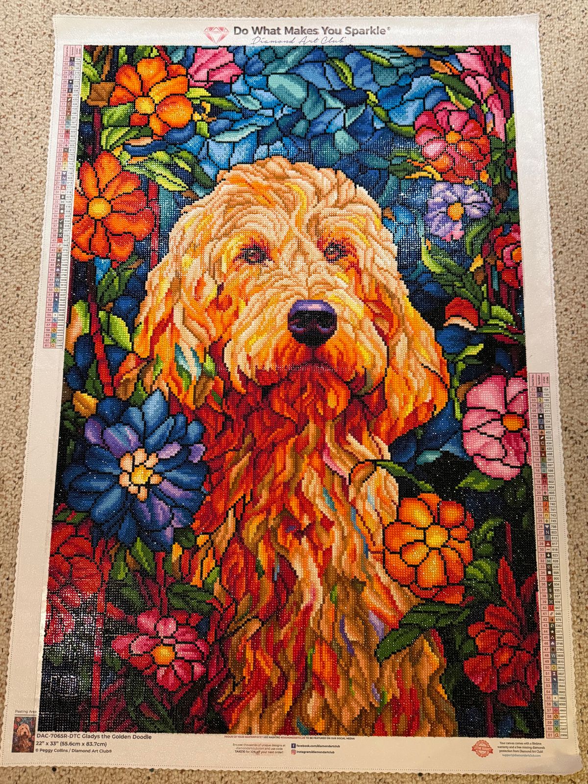 I made Gladys the Goldendoodle for my parents because it looks so much like their Roxy. It was my first Peggy Collins piece and I really enjoyed working on the individual sections of the stained glass effect. So pretty!