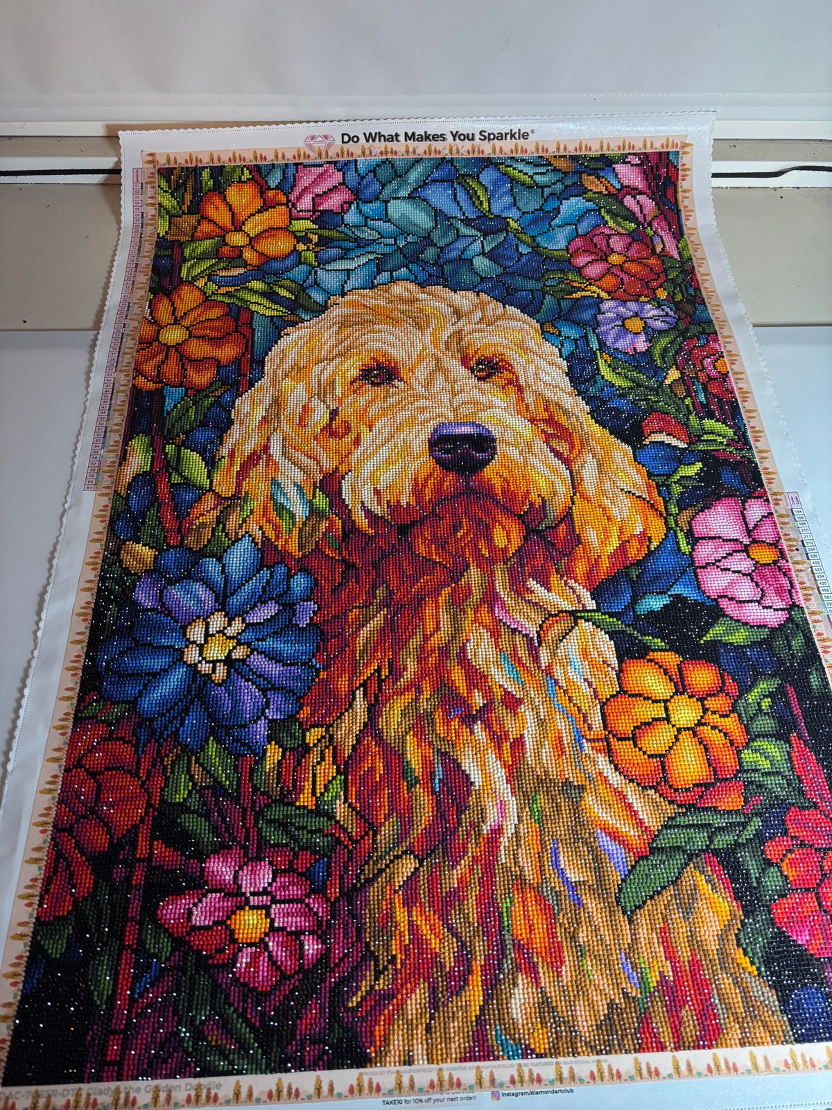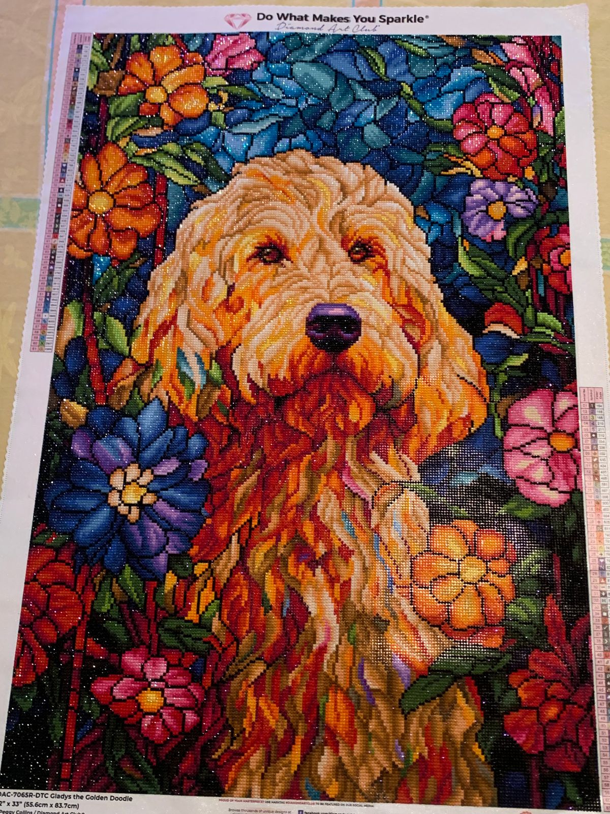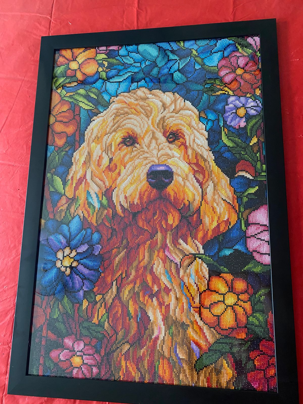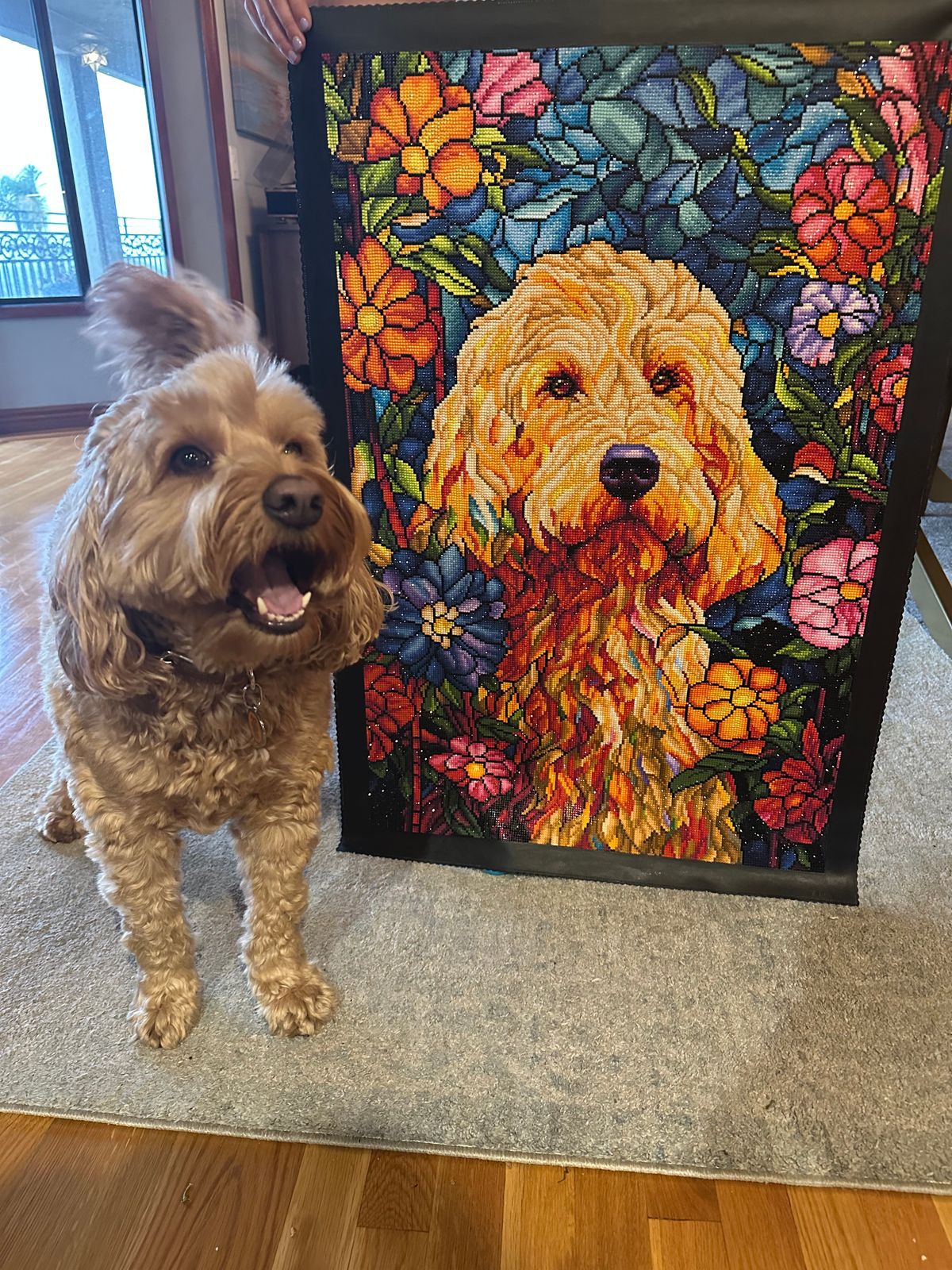 I made Gladys the Goldendoodle for my parents because it looks so much like their Roxy. It was my first Peggy Collins piece and I really enjoyed working on the individual sections of the stained glass effect. So pretty!