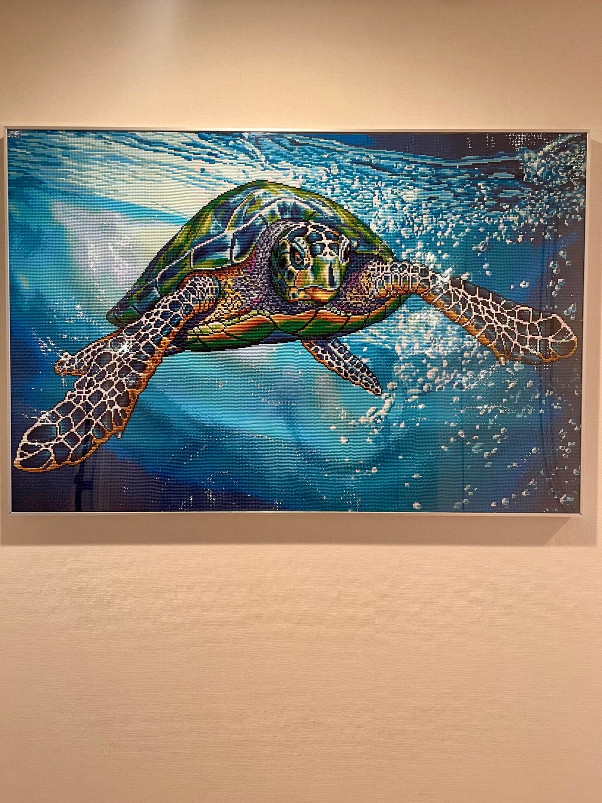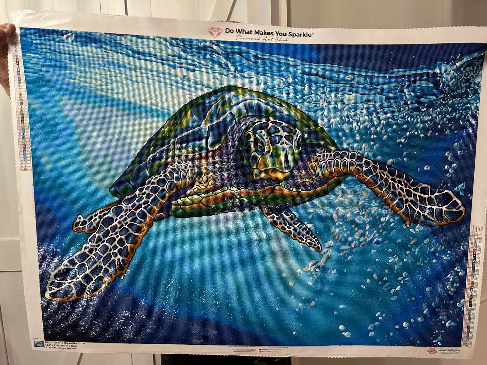 I was a little worried I’d get bored with all the blue but there is so many different shades and patterns that turned out beautiful that that I’m so happy I bought it. My granddaughter loves turtles and she can hardly wait to get it up on her wall.
