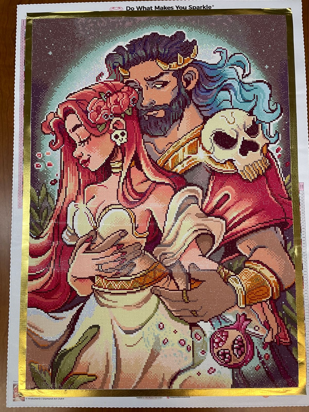 This one went a lot faster than I thought it would, probable because it is rounds. And I was snowed in for a few days, so I got to work on it a lot more than usual. I loved the metallic gold accenting their jewelry and the skull on his shoulder and her earring.