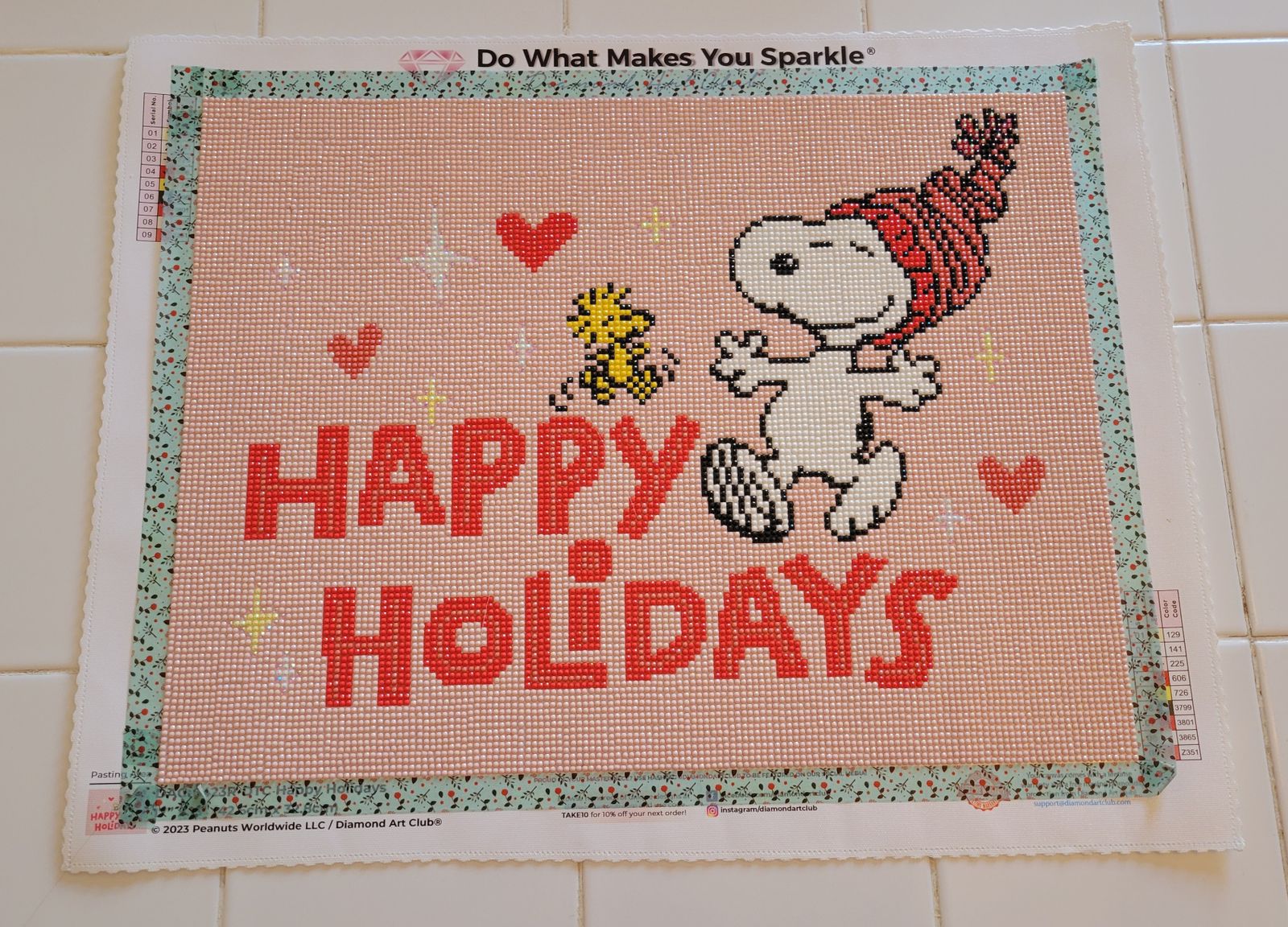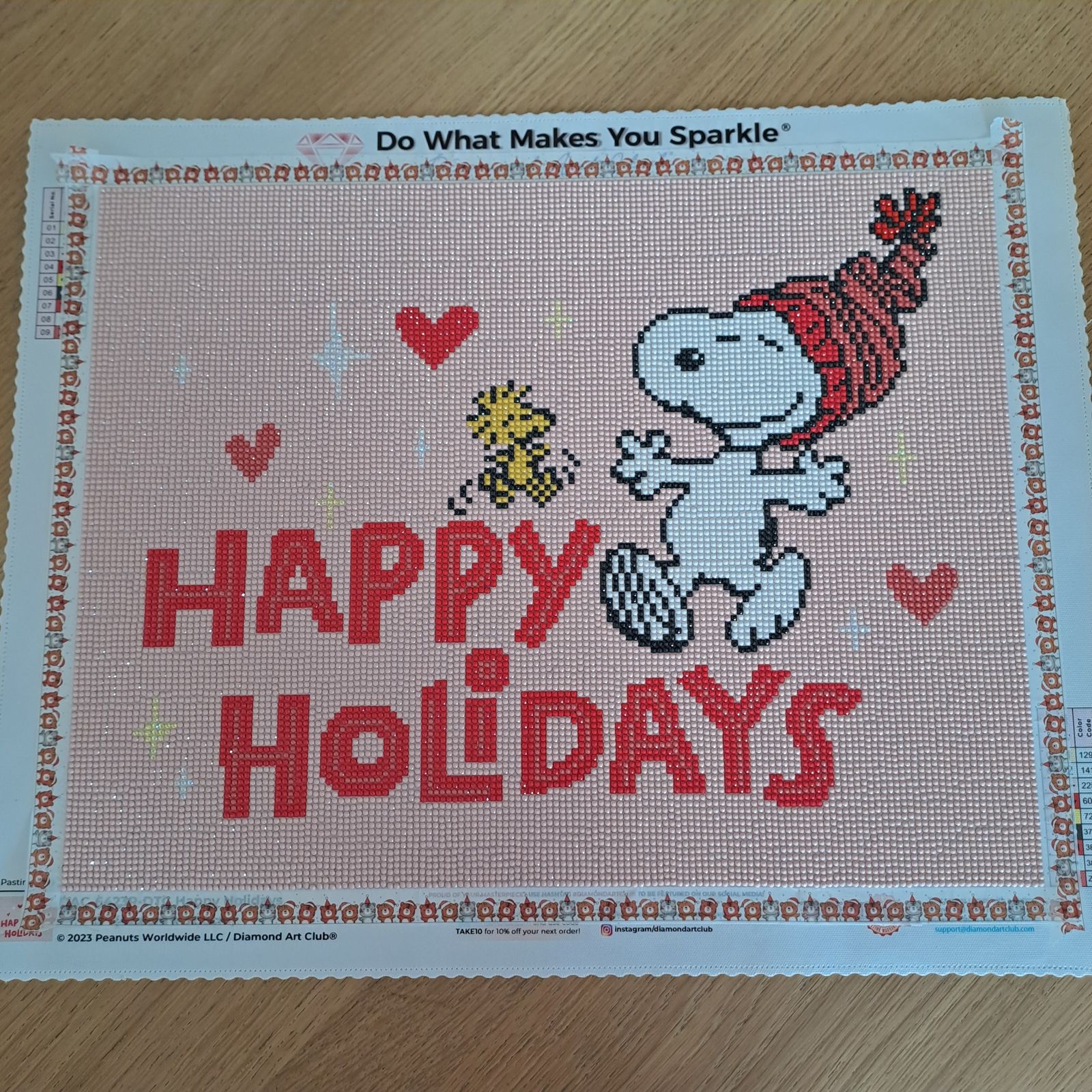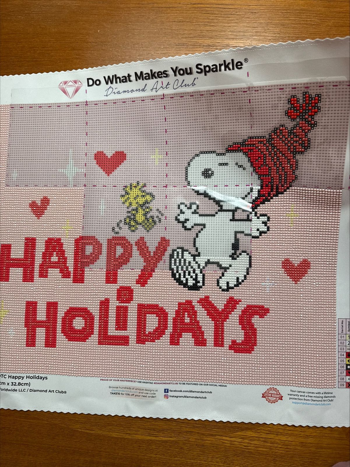 I have always loved Peanuts characters, especially Snoopy. When I saw this, I definitely had to get it. It was only my second diamond painting, and I finished it in one week. I wanted it to be done before Christmas of course. It is so cute and I'm excited to hang it up. DAC is of great quality; you can see it in the printing of the symbols on the canvas (super easy to read) and in the upgraded kit and drills. The packaging is excellent. I use the long, narrow box on my table to drop tools into while working, so they are easily accessible and quick to clear off my dining table, LOL. Love, love, love Diamond Art Club. I've already purchased two more to do, can't wait to get started on them.