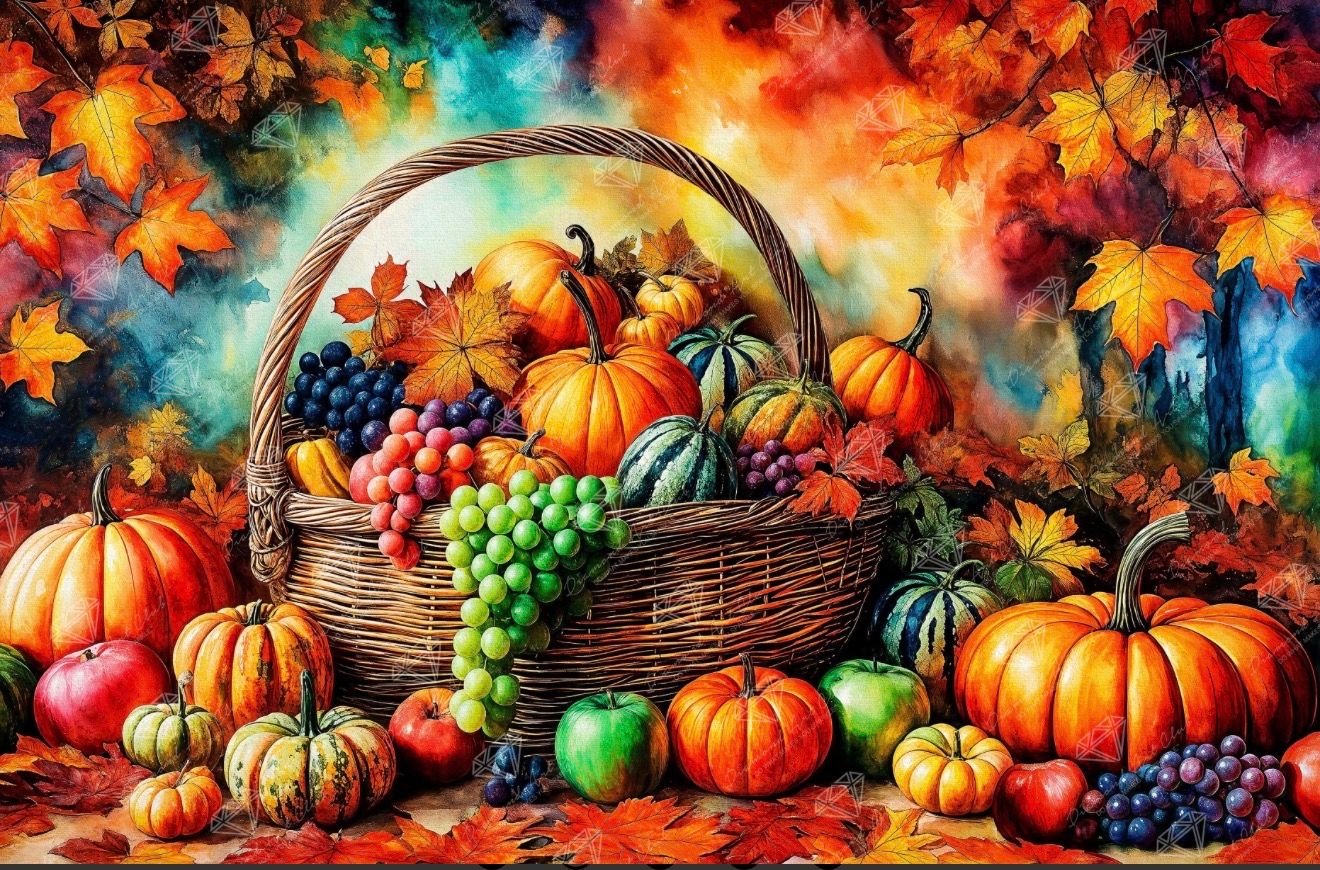 Dig into the colors of the season with a harvest so vibrant it practically glows. Pumpkins, grapes, and apples round out a cornucopia overflowing with autumn brilliance.