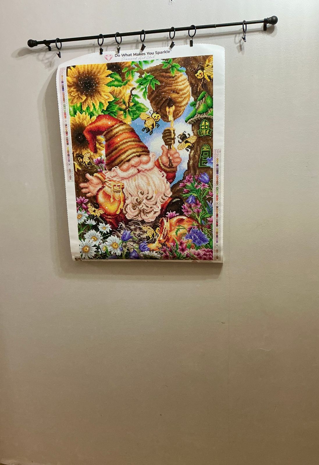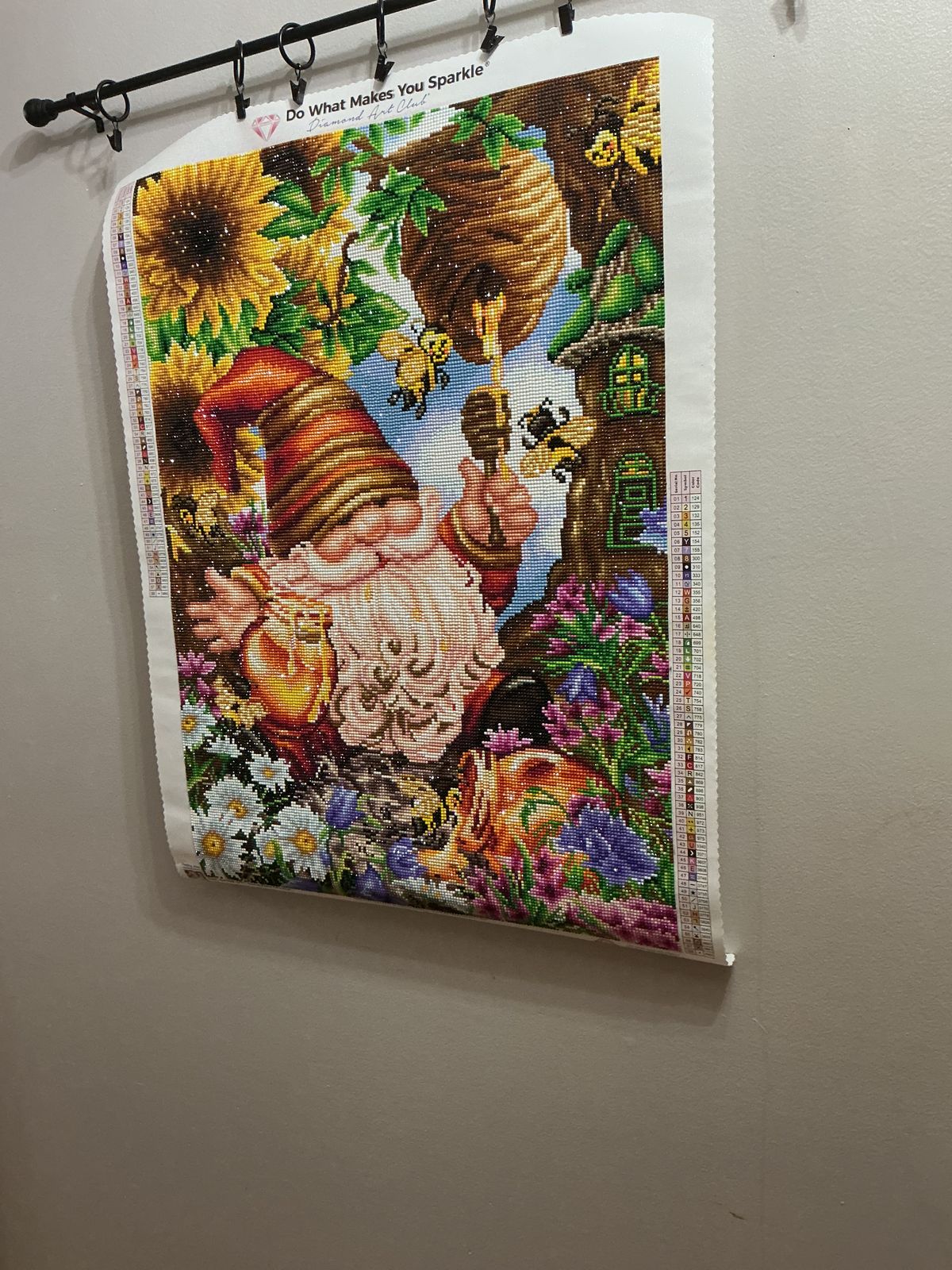 As noted by a couple of others, I ran short on the N drill while working on the gnome's beard. I know you can request more drills from DAC, but I took the opportunity to use up some of the other drills in the kit. I used a variety of slightly darker colors to make the swirls more well defined and I'm really happy with the results! I felt inspired to pop some drills in the area below the beard to make the bumblebee stand out a little more and had fun playing with the colors. This canvas is adorable and special to me since my mom loves gnomes and her father was a bee keeper.