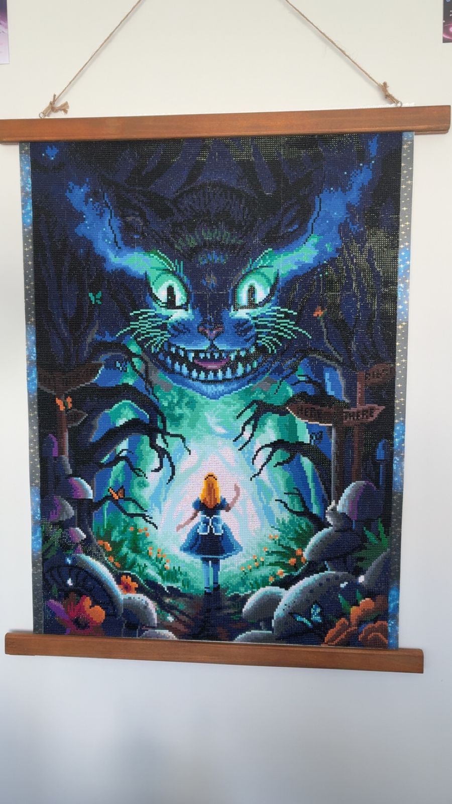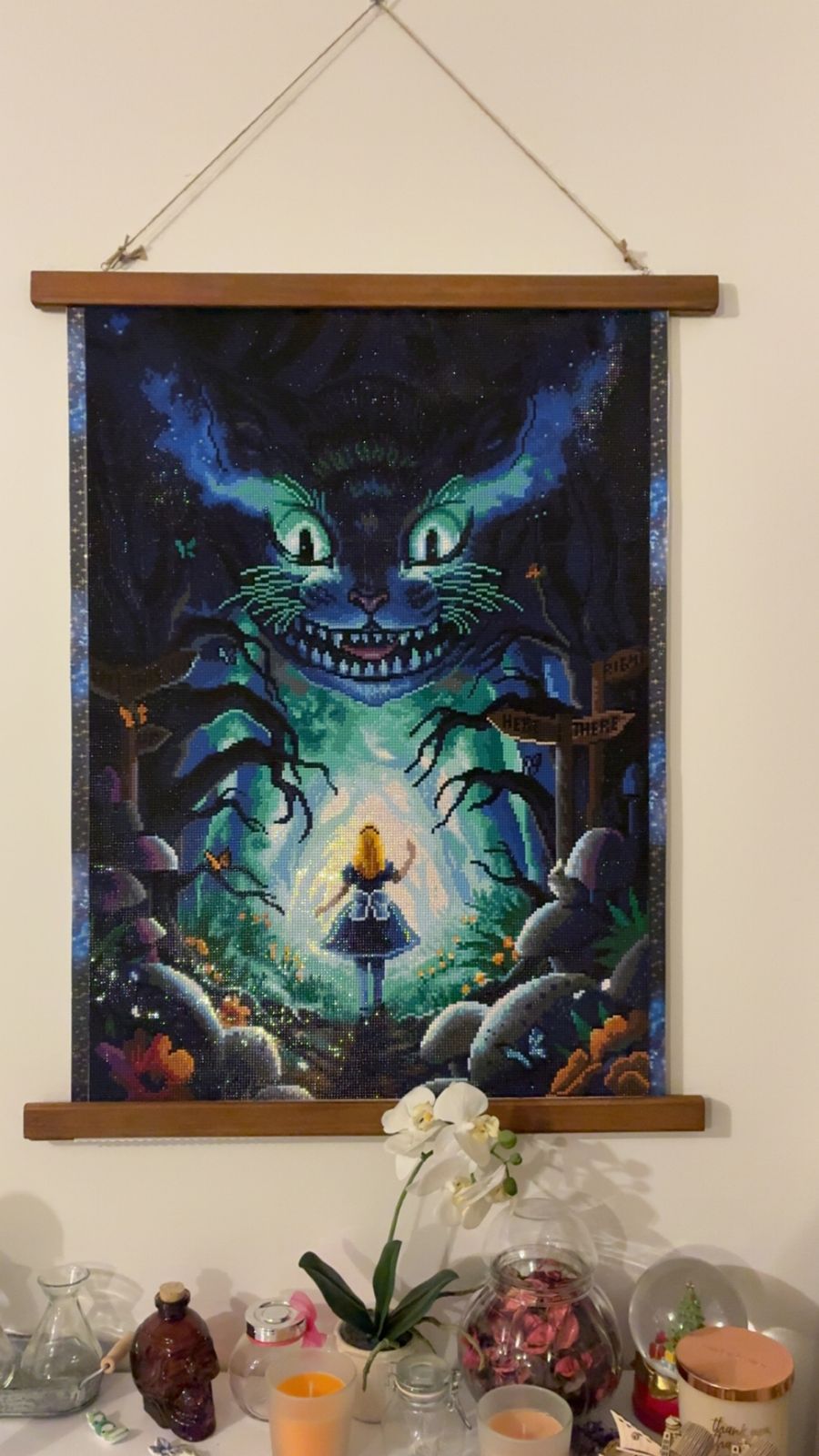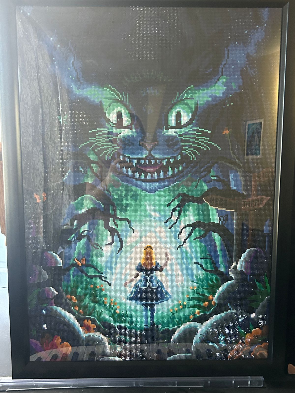 First square diamond kit I’ve done and really enjoyed it. Loved doing the green section around Alice and Cheshire’s eyes the most. Looks great above my bookcase