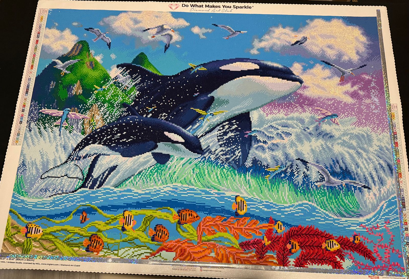 This kit was so fun. The AB placement was fantastic as usual. I was surprised by an extra bird that was rendered under Mamas dorsal fin that isn't in the original painting. But overall it was so fun.