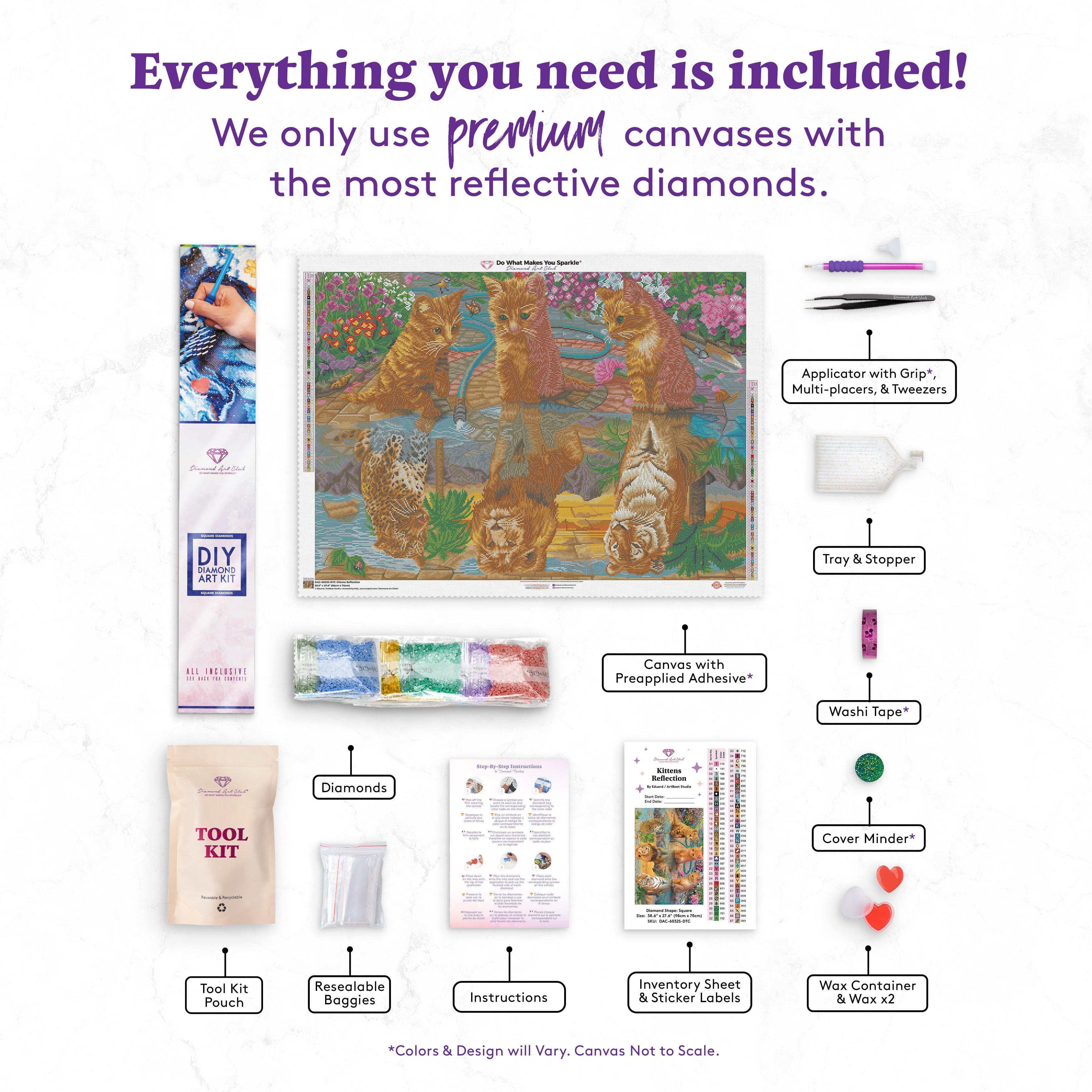Canvas x 1, Diamonds, Tray x 1, Applicator + Grip x 1, Wax x 2, Tweezers x 1