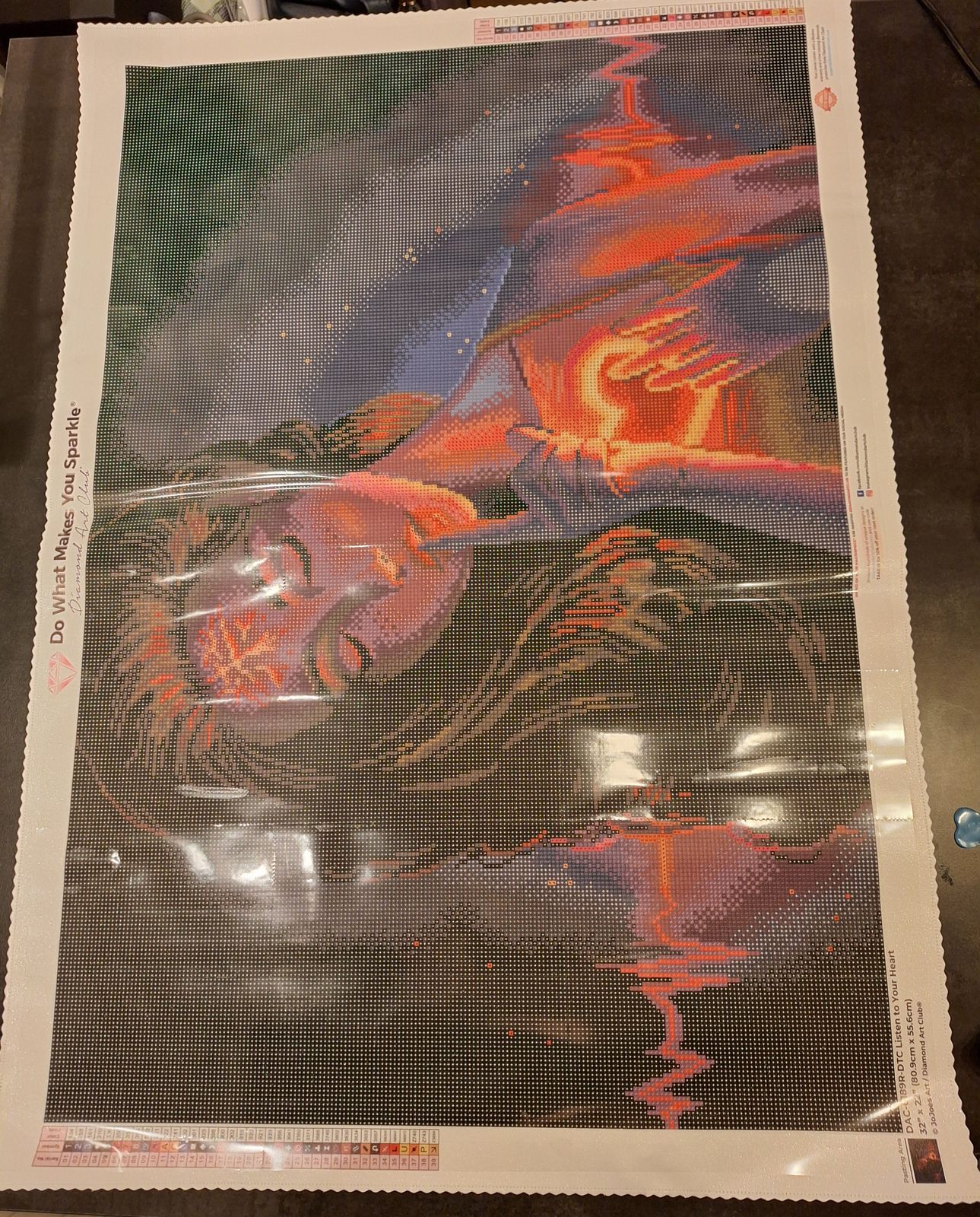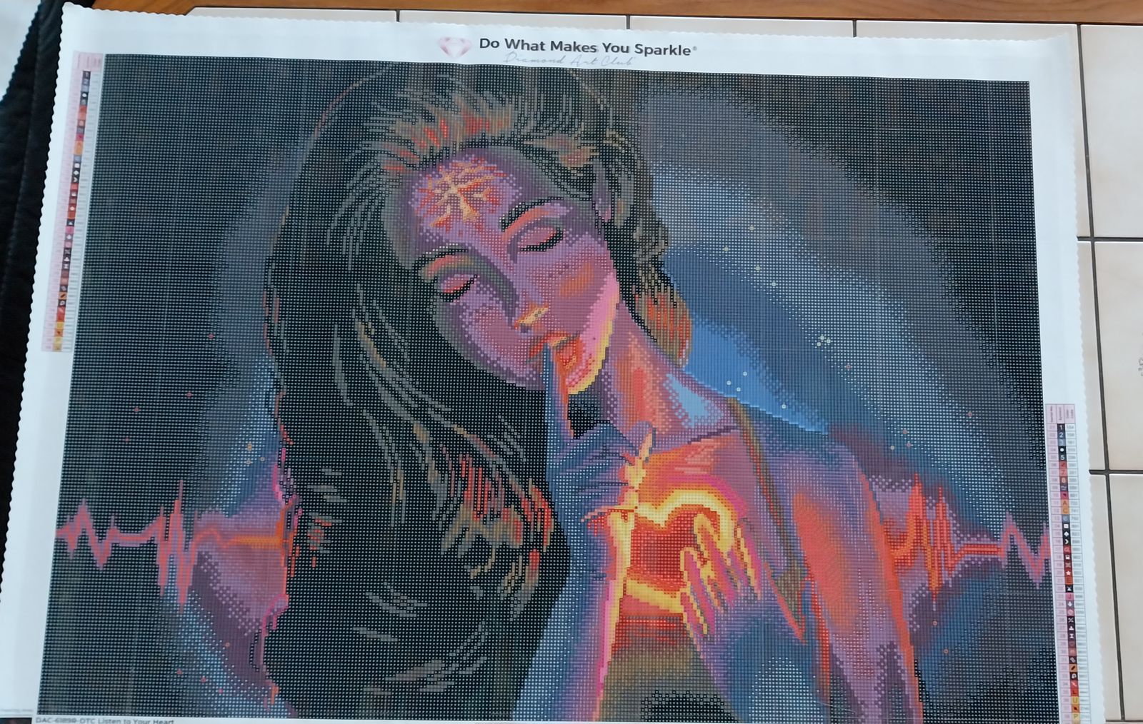 I loved this painting and I think it is going to go on my wall. Reminds me of meditation with my 3rd eye & heart chakra. I did deduct 1 star because I wish there was a bit more difference between the hair and the background. Just a shade or two lighter on the blue. I did substitute some crystals for the yellows to make them pop a bit in the heart/3rd eye.