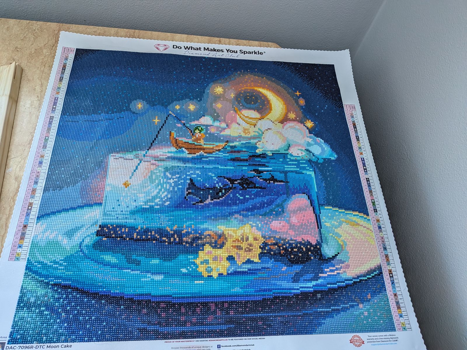 i had so much fun creating the moon cake canvas! i found the color palette very calming and relaxing with all of the blue hues. i enjoy how there was a mixture of color blocking and other areas like the girl fishing, and inside the piece of cake, that had more "confetti". this canvas took me around 3 weeks to complete, i enjoyed that it was a smaller size canvas than i typically create. it is going to hang in the living room as it is complementary to my color scheme. this canvas would be a wonderful first painting as a gift to a friend, or a great one to order for yourself! i thoroughly enjoyed this piece and it looks beautiful upon completion!