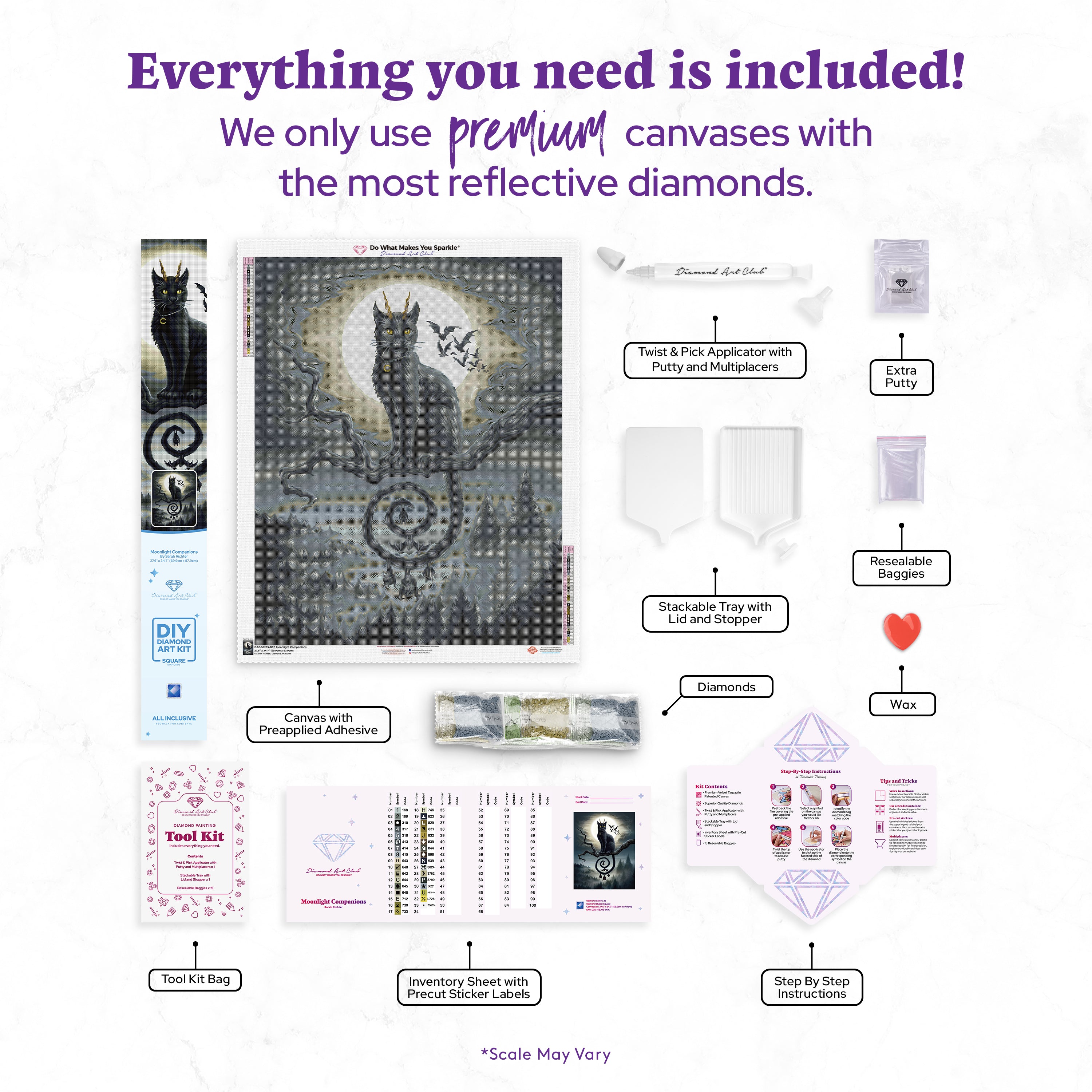 Canvas x 1, Diamonds, Tray x 1, Applicator + Grip x 1, Wax x 2, Tweezers x 1