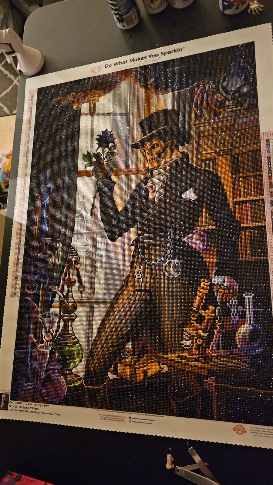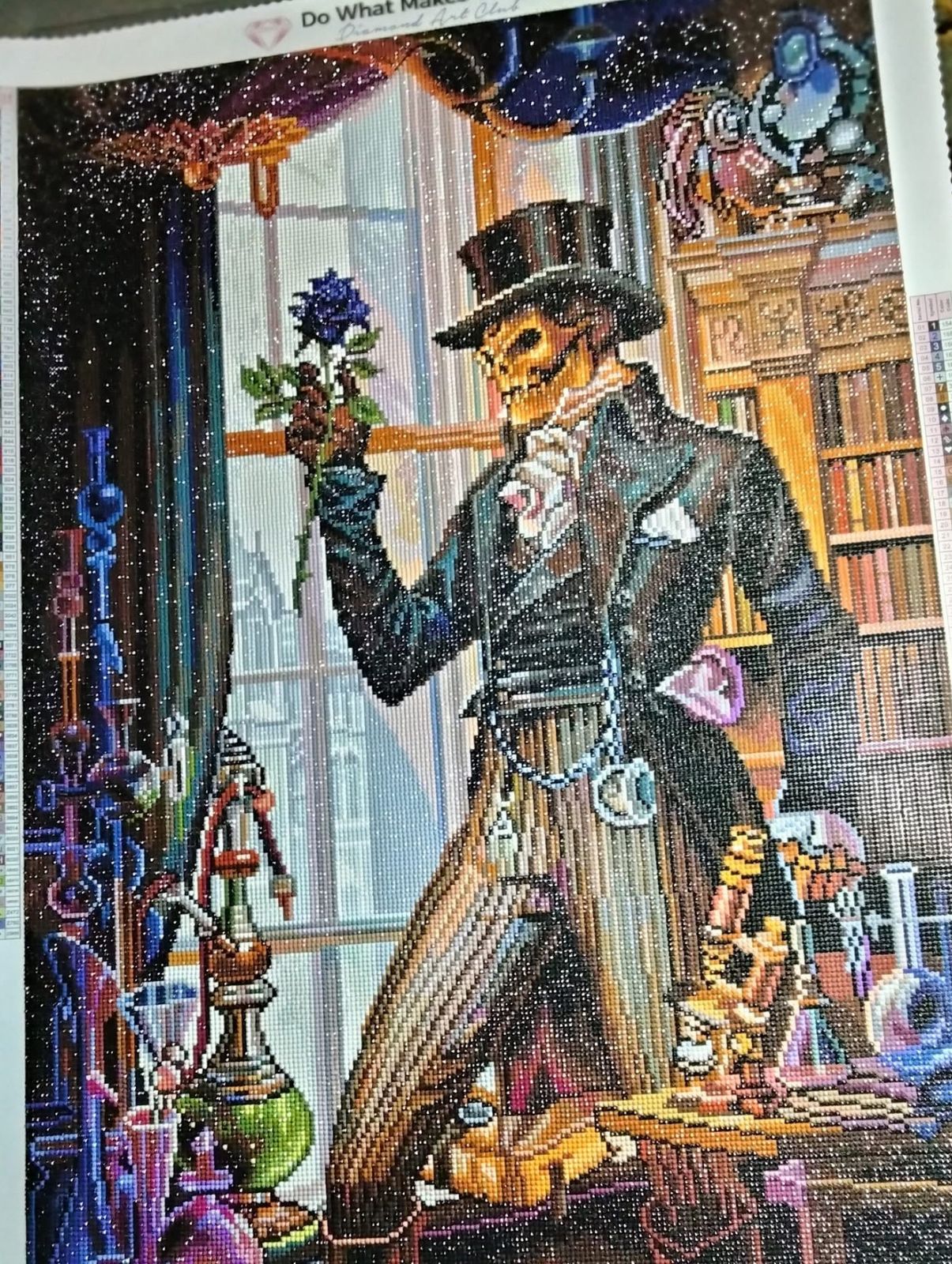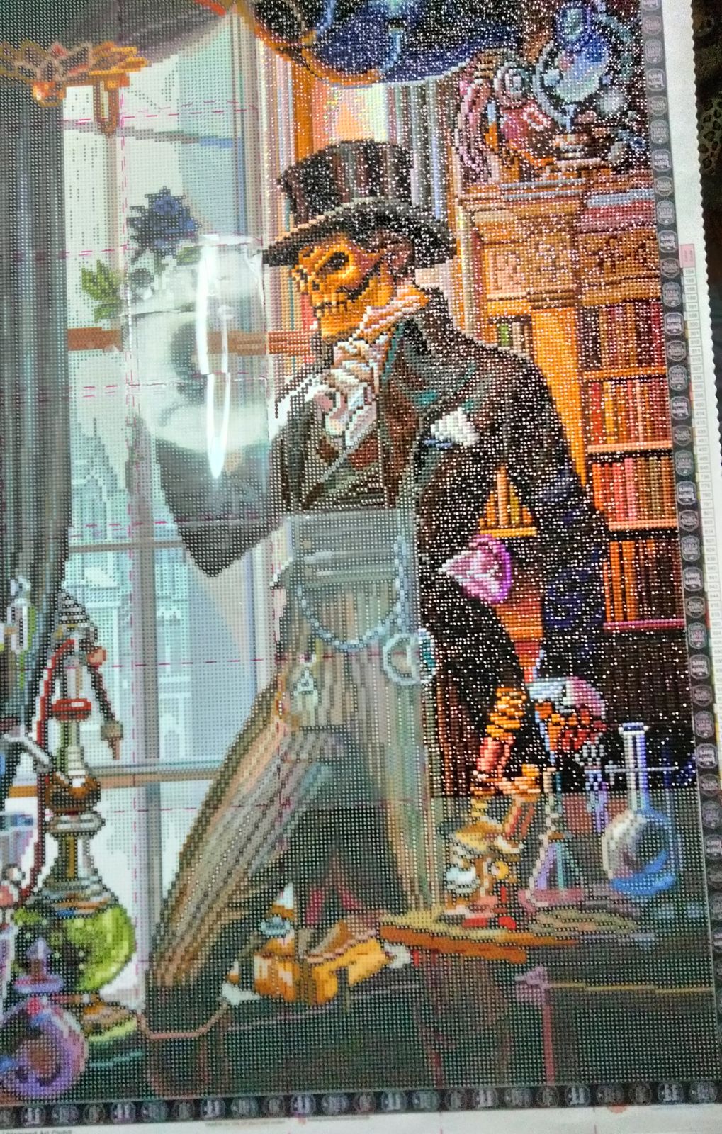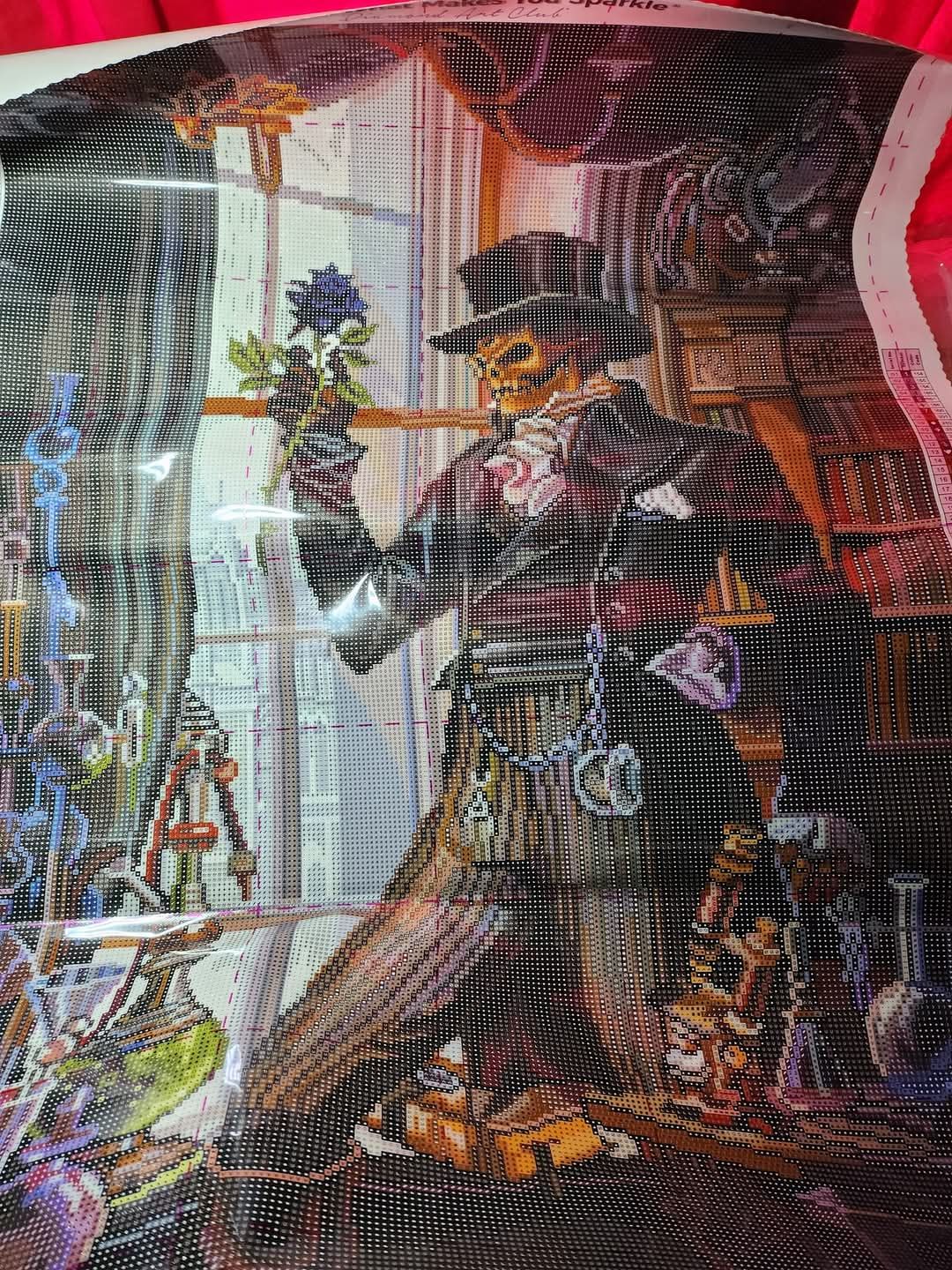 Took about 2 months. What was neat about this print is the film that covers it was sectioned off in blocks. So i didnt have to cut the film. Some of the print was dark to see, i recommend bright area to do this. However cant wait to frame it and put it up for Halloween