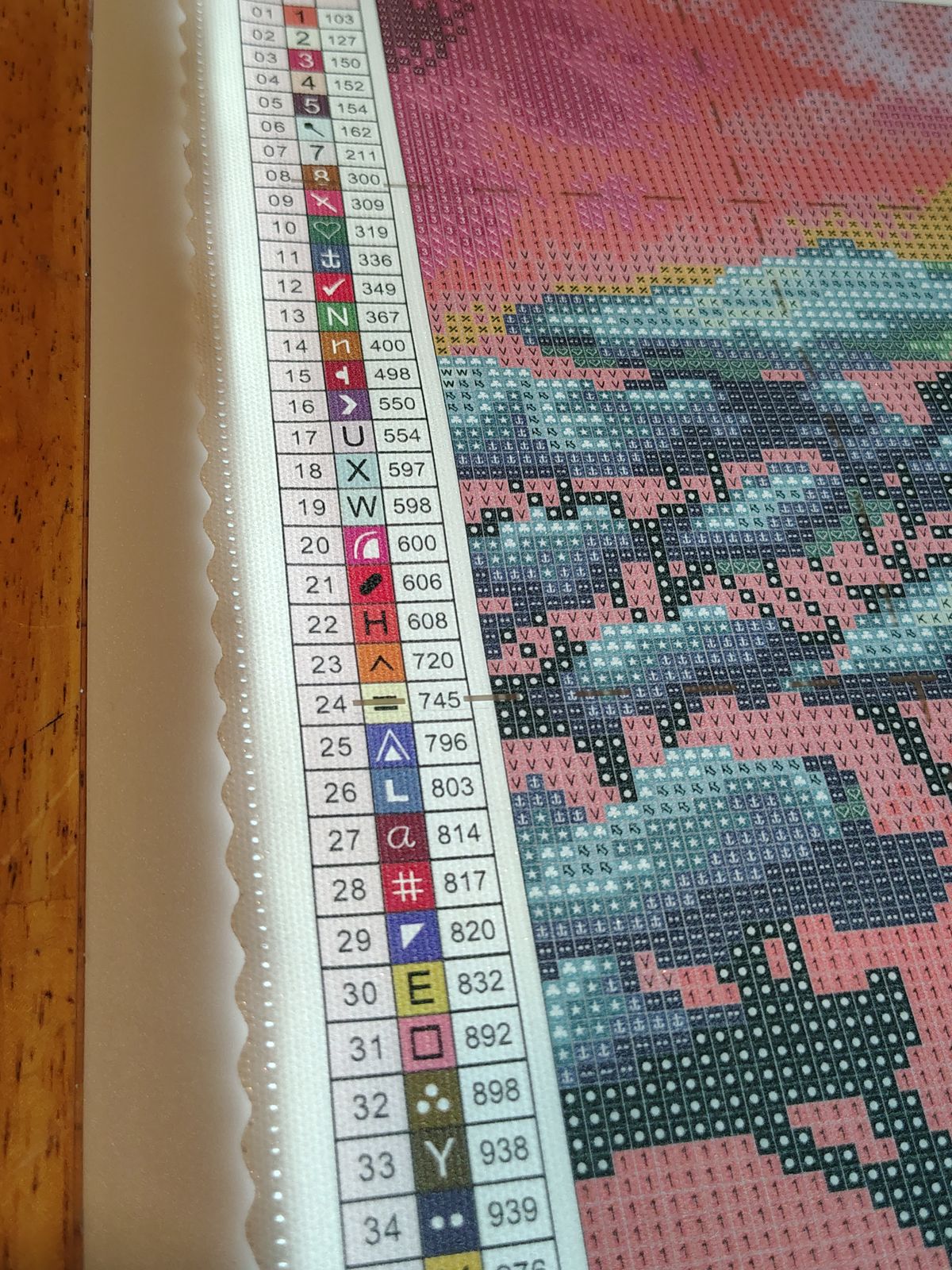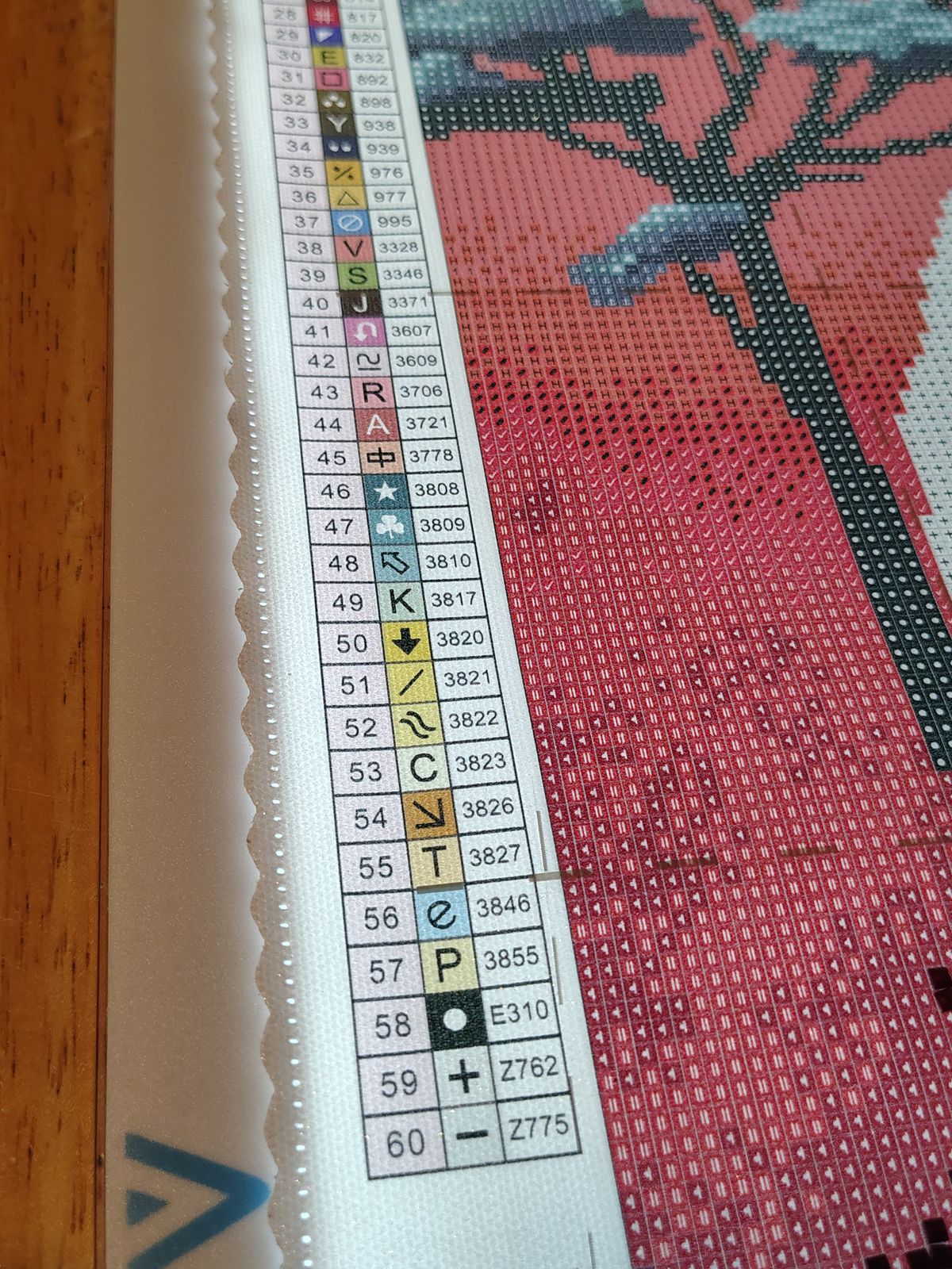 SOO! Where to begin I got one full row down and then when went to start on a new row and looking for the color that was supposed to match what looked like 2 slashes like this (ll) and I looked and looked thought I was going crazy missing it and I literally do not have any drills with that symbol so the only one I could come up with that it had to be was the hashtag symbol (#) and on the canvas it's missing the lines across (=) so there was NO way I was going to start all over so I'm hoping that using the # on the ones that have ll symbol will turn out the right way or I'll be sooo upset! I'm quite disappointed in DAC for not double checking the canvas before sending it out especially with it being such a big mistake! As you can see in the pics the symbol is different than any others on the legend on the side of the canvas! I haven't finished it yet so praying it comes out ok!