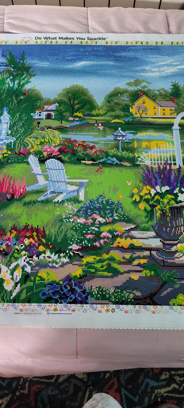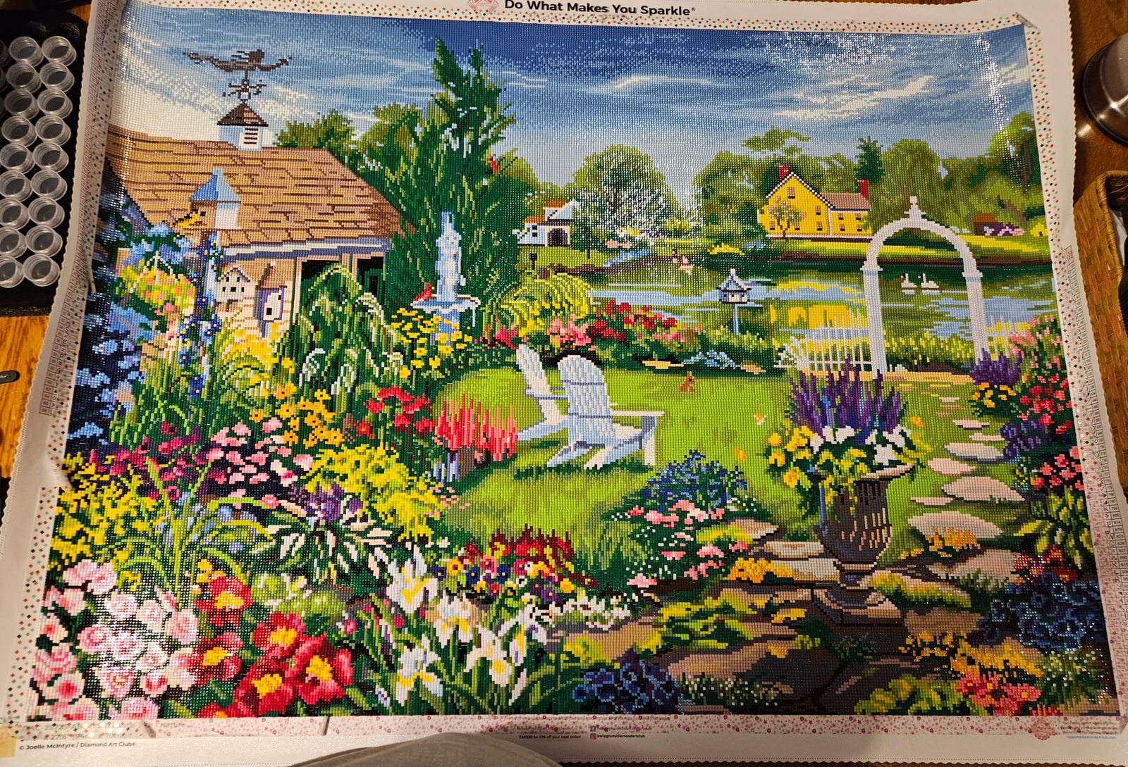 It came out beautiful. Flowers, houses, a pond, and pretty birds all in a wonderful garden.