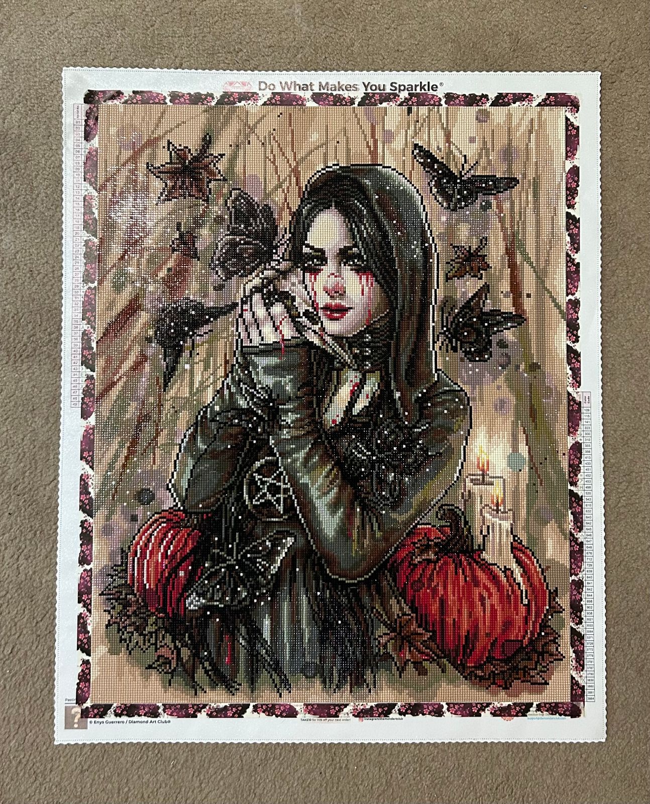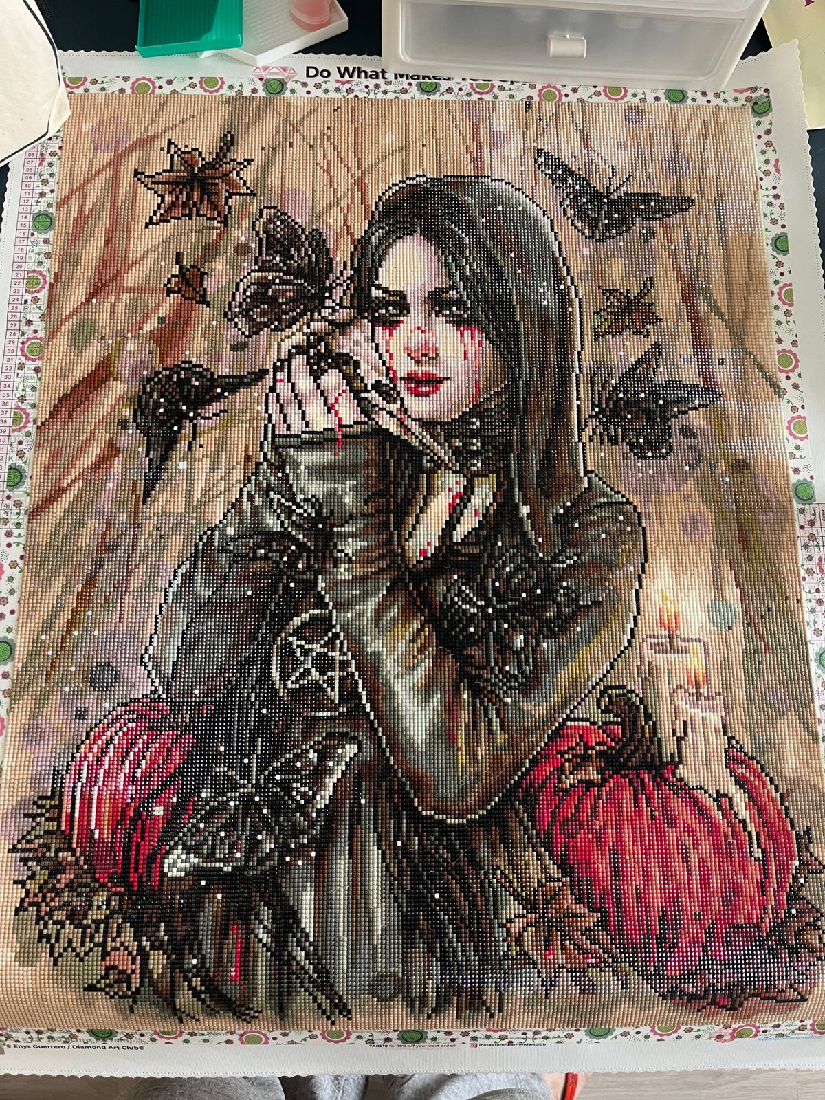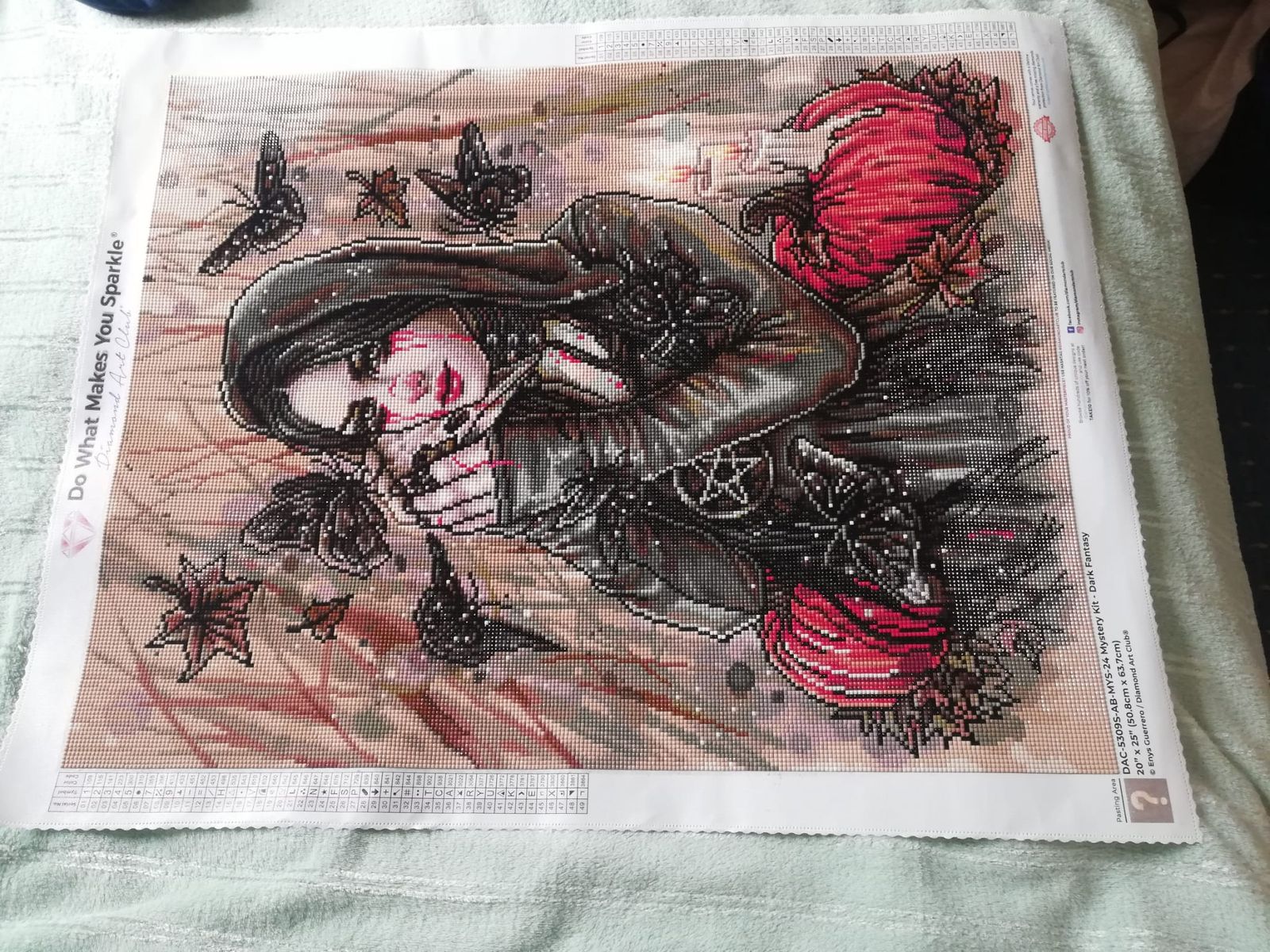 One of my favorite DAC sizes of a canvas. Being on a smaller size scale this one is perfect size to try out on a mystery. I roll up my canvas and work in rows with release paper cover each row so non spoiler. This one worked up perfect. Drills fit so nicely amd love seeing the image come to life. Working in small sections is my key to handling the B&W .