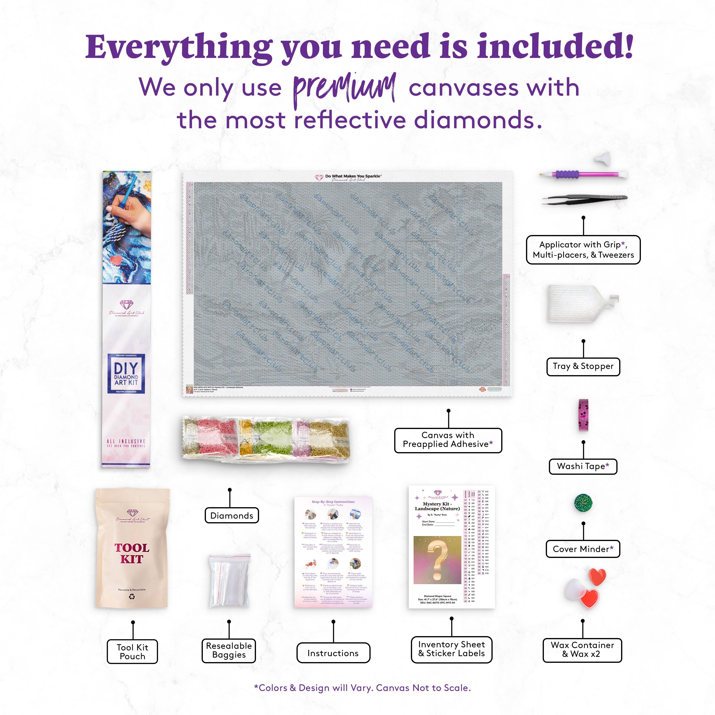 Canvas x 1, Diamonds, Tray x 1, Applicator + Grip x 1, Wax x 2, Tweezers x 1