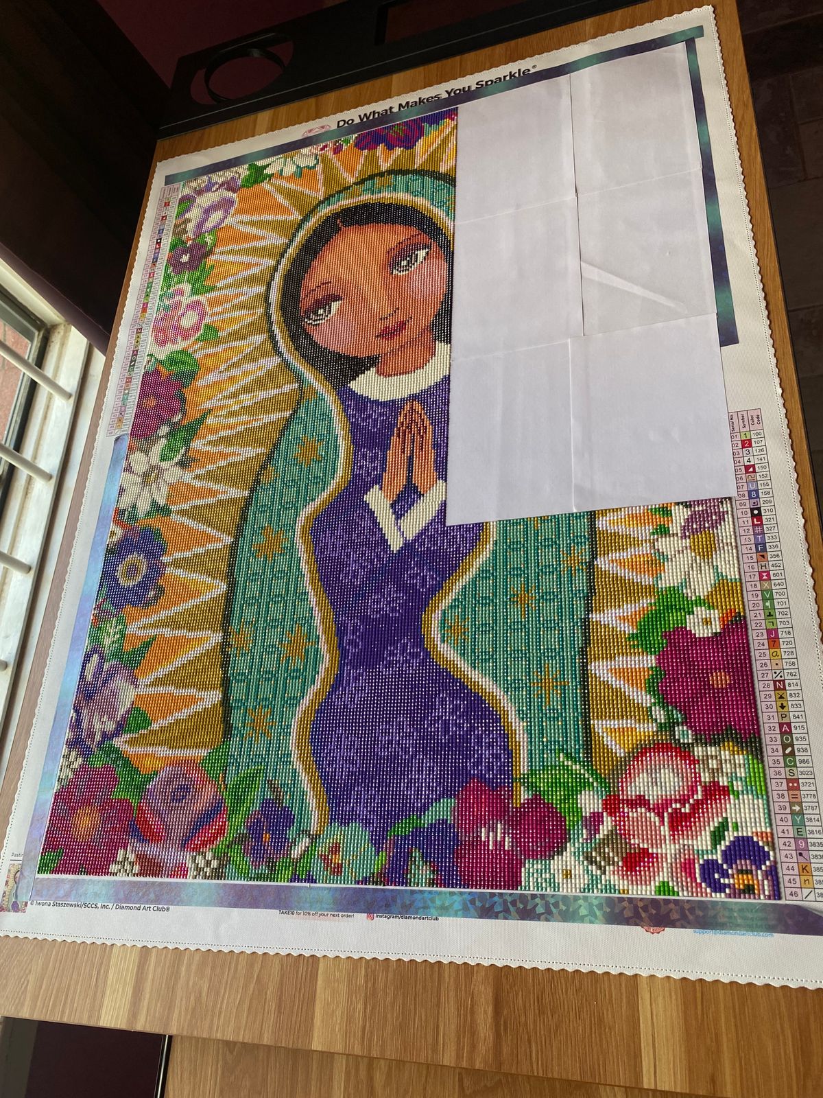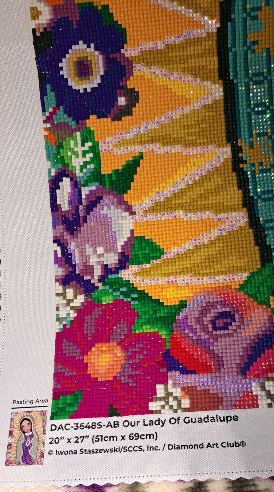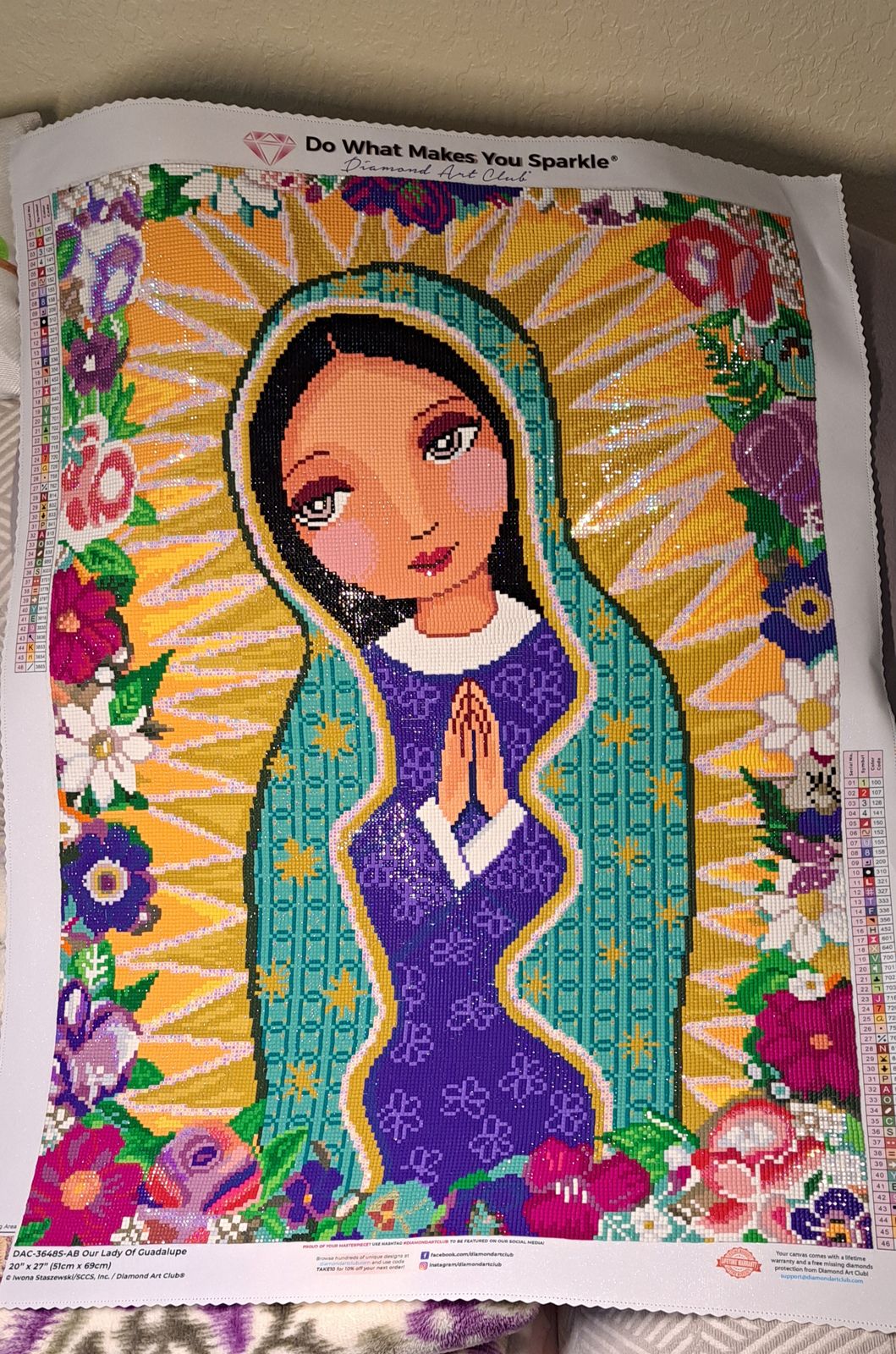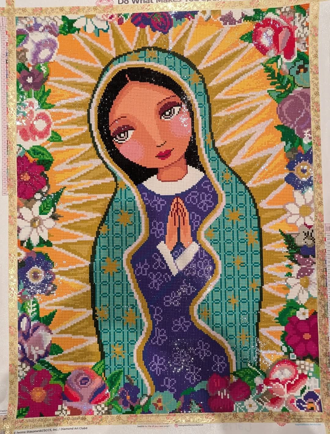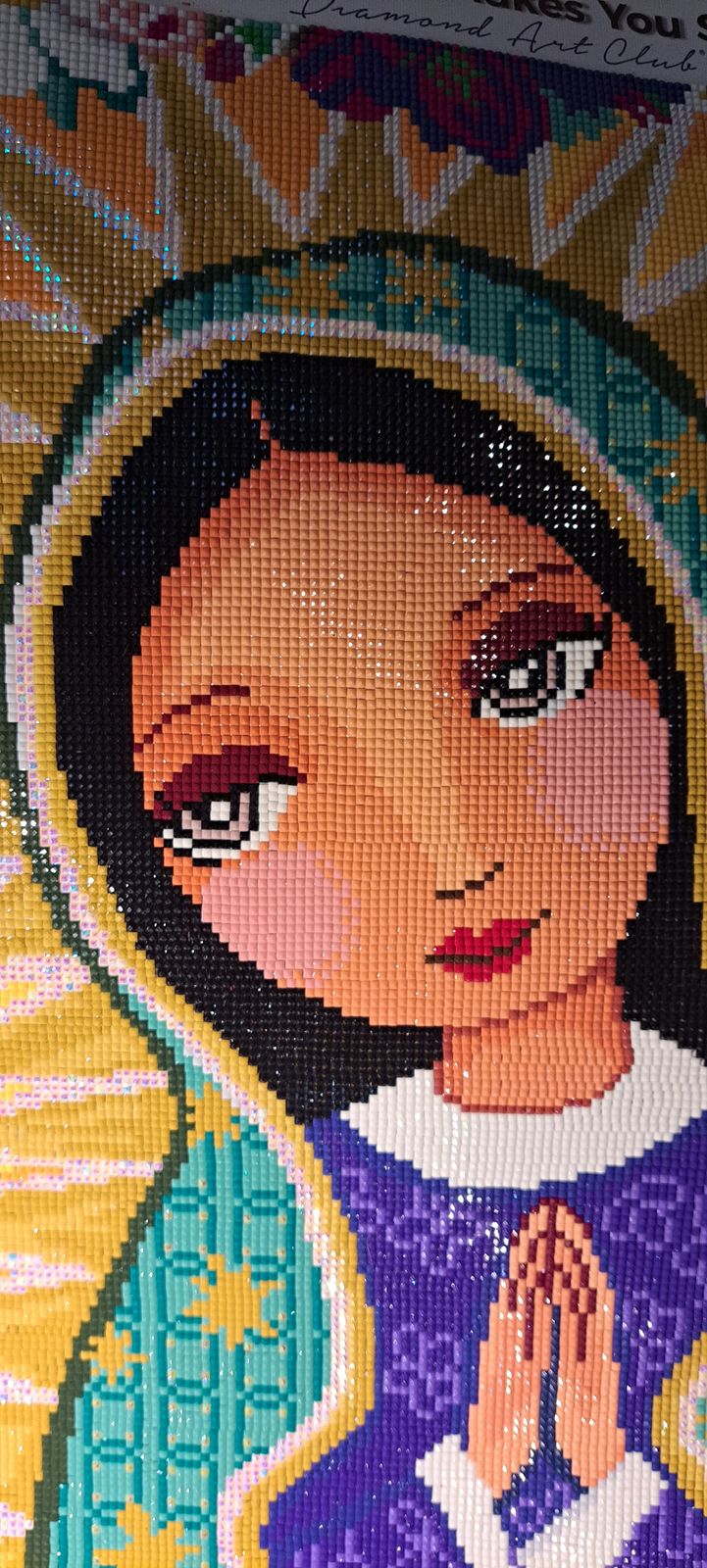 I enjoyed every minute of this sparkly, colorful painting. It made me smile and was peaceful for my mind, my heart and soul. I know the Our Lady of Guadeloupe story, and I love it. Good quality drlls, soft canvas, tight drill field, with enough stick, and barely any trash. Was easy to work up and my first completion for 2025. It is gorgeous!