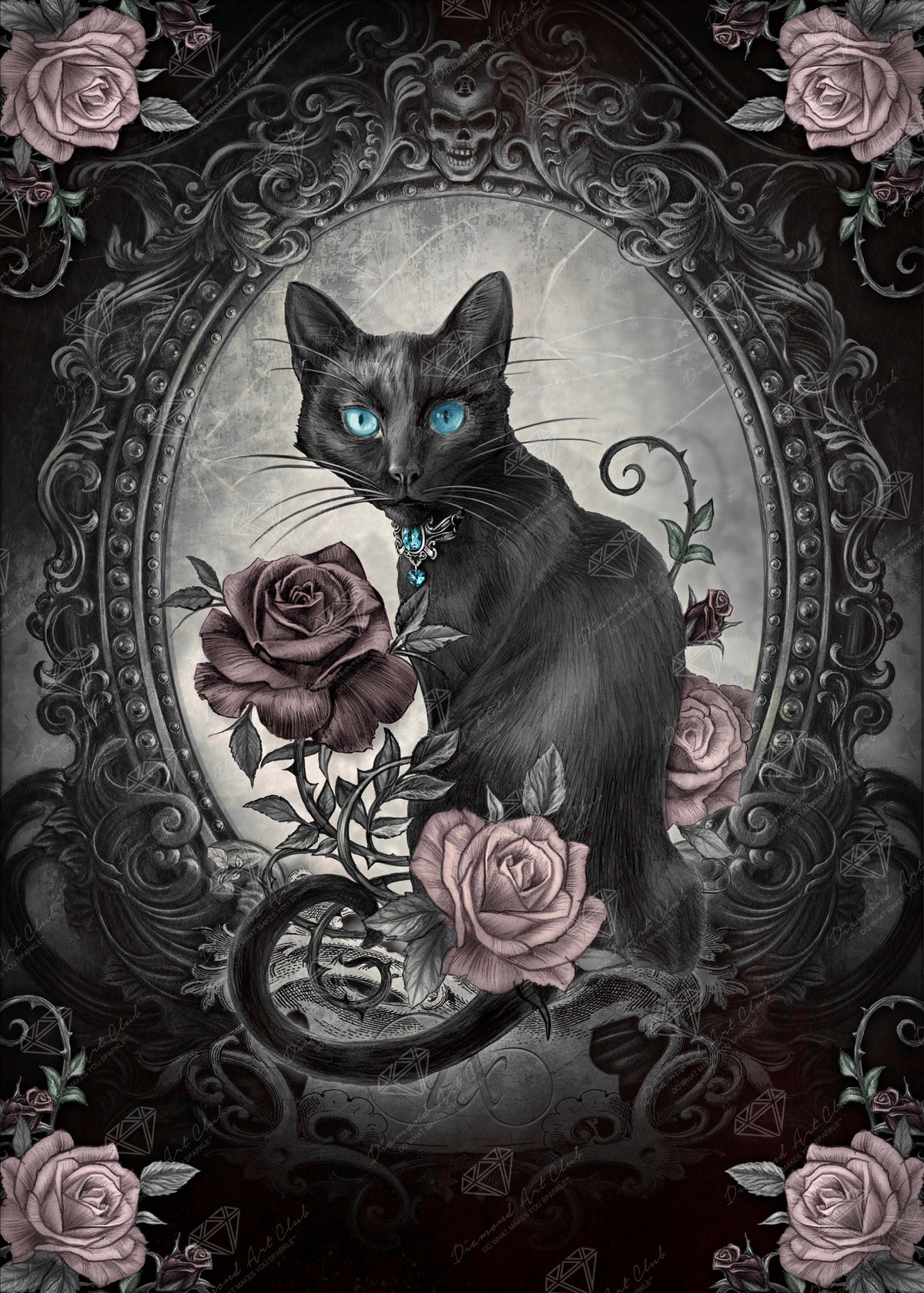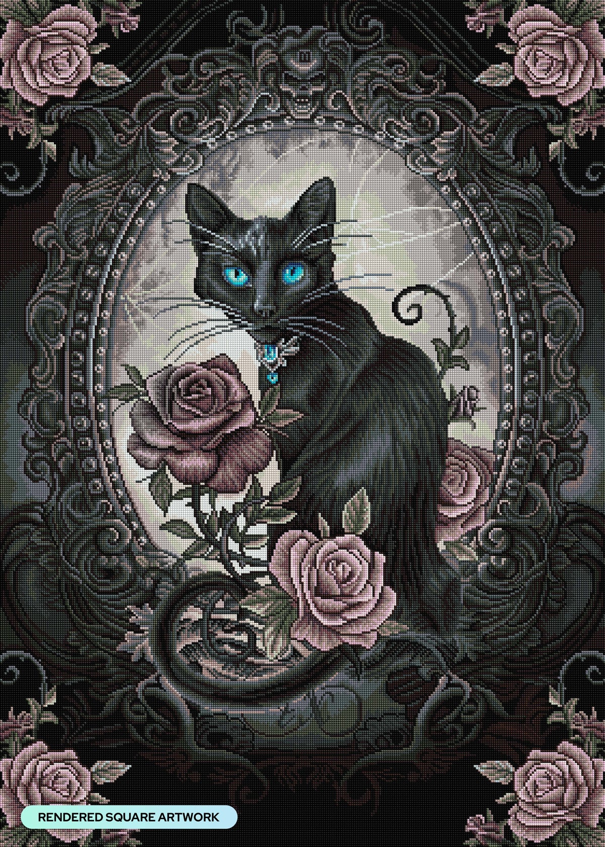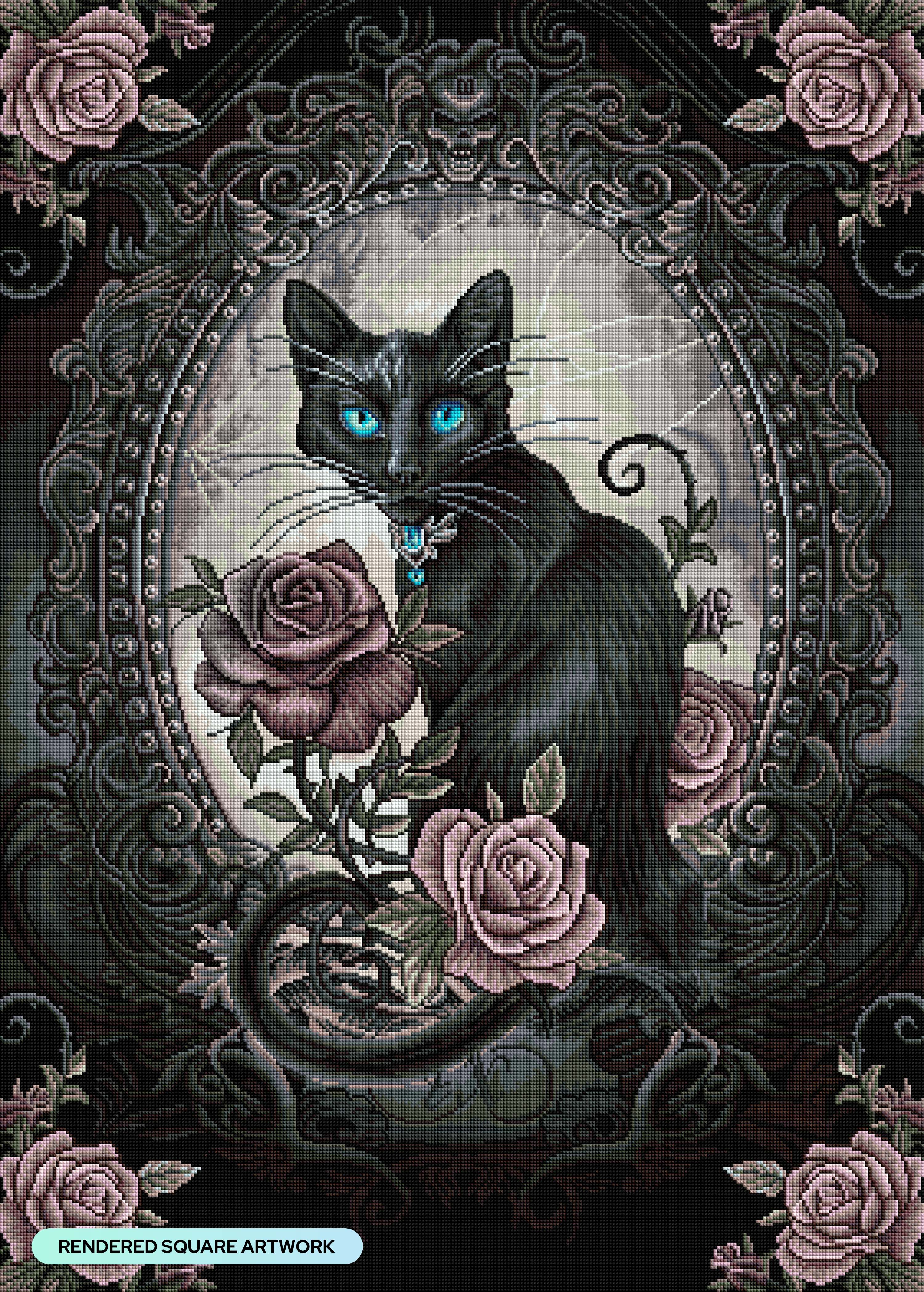 Rest amidst the roses set within a frame of mystic charm. Disarm with eyes as blue as the sky and a shimmering coat that begs to be touched.