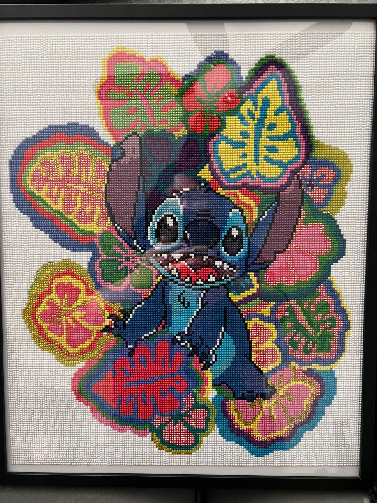 This painting was so fun and looks so good completed. My son loves Stitch so I did this to put in his room. This was the first time I also got the chance to really use my multi-spacer tip and also has lots of fun confetti. I also really loved the iridescent drill and I found that fairy dust drills are my favorite!